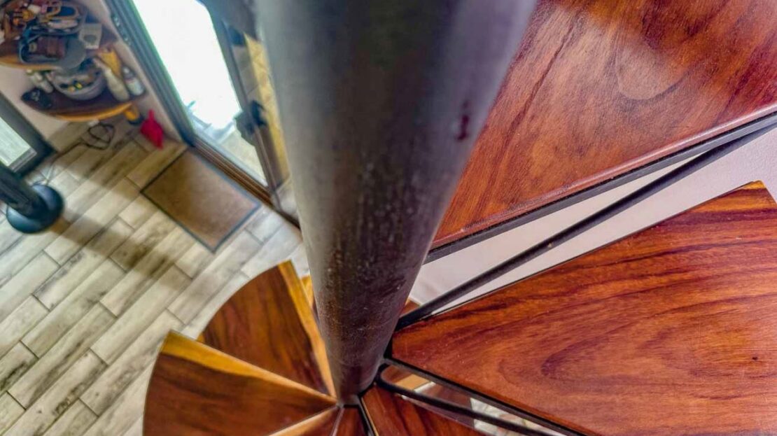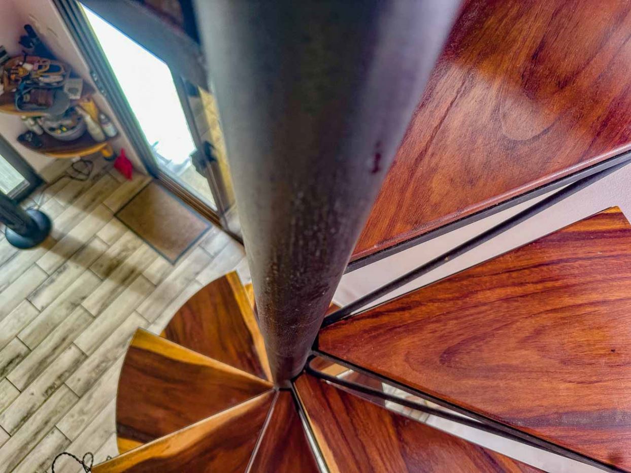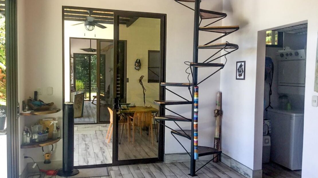 The lower and upper left sides of the home hold two stunning, bright bedrooms that amaze with extensive tropical vistas. The lower bedroom includes a large space used as a laundry and storage room. An outdoor shower, with a definite surf-beach theme, sits just outside the bedroom’s patio doors. A beautiful lumber spiral staircase ascends to the upper bedroom and the attached balcony which extends over the central, open area of the home.