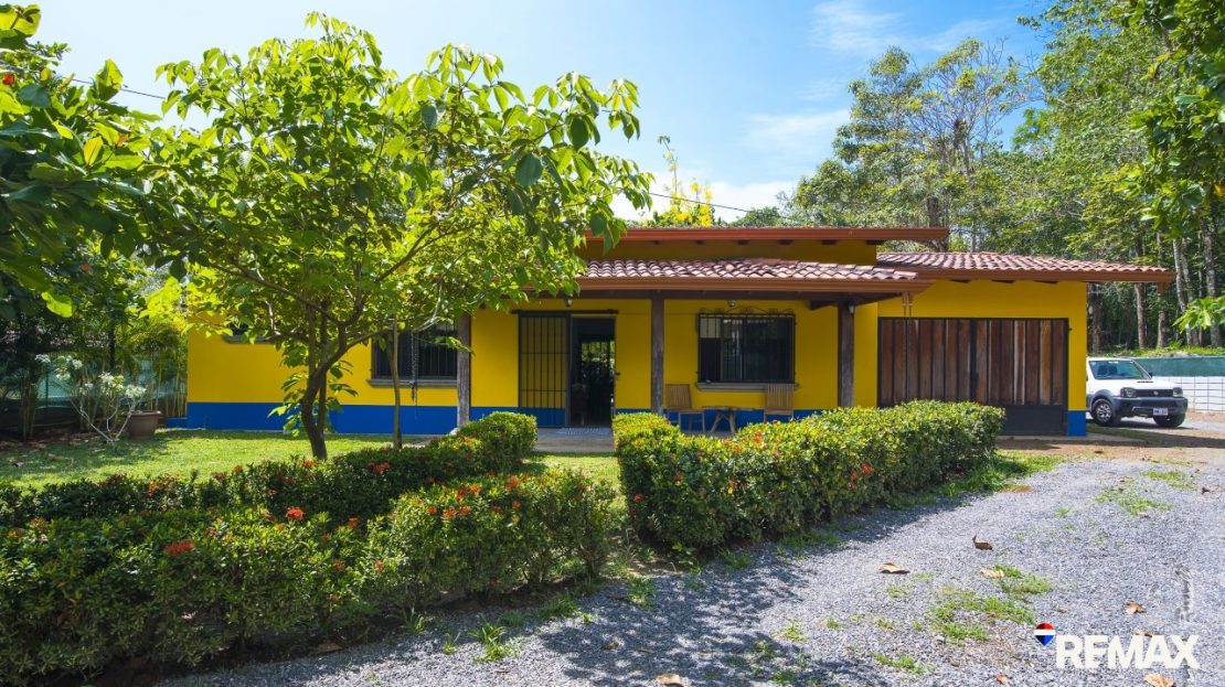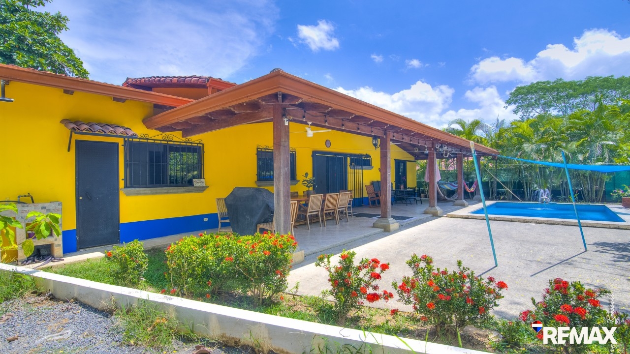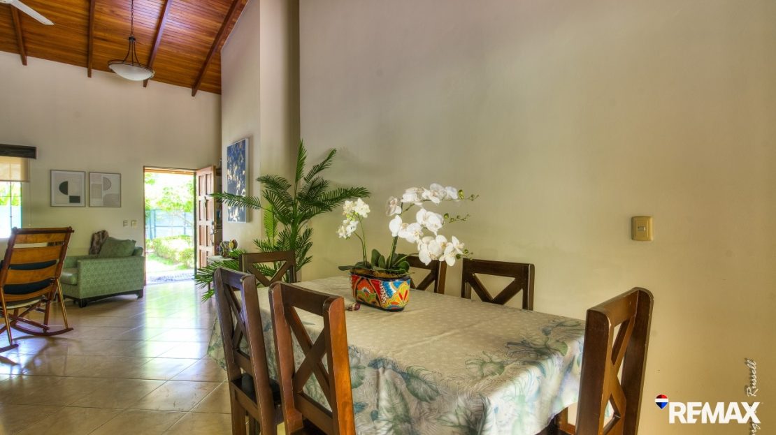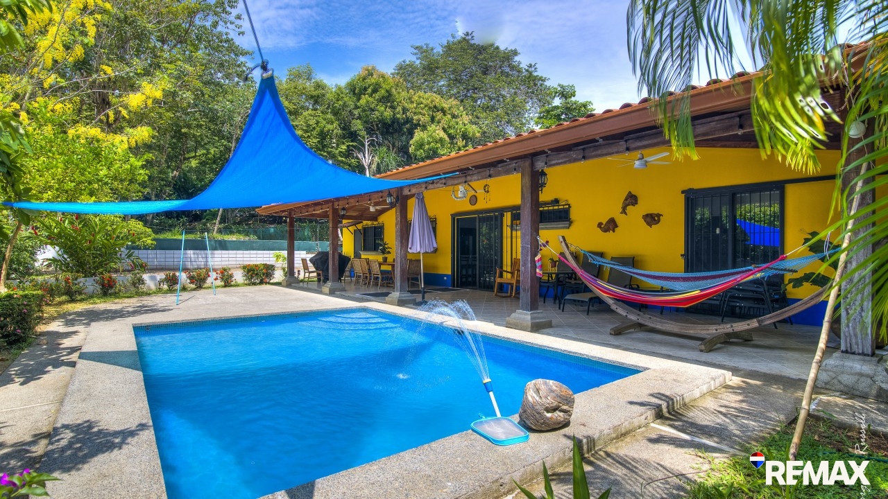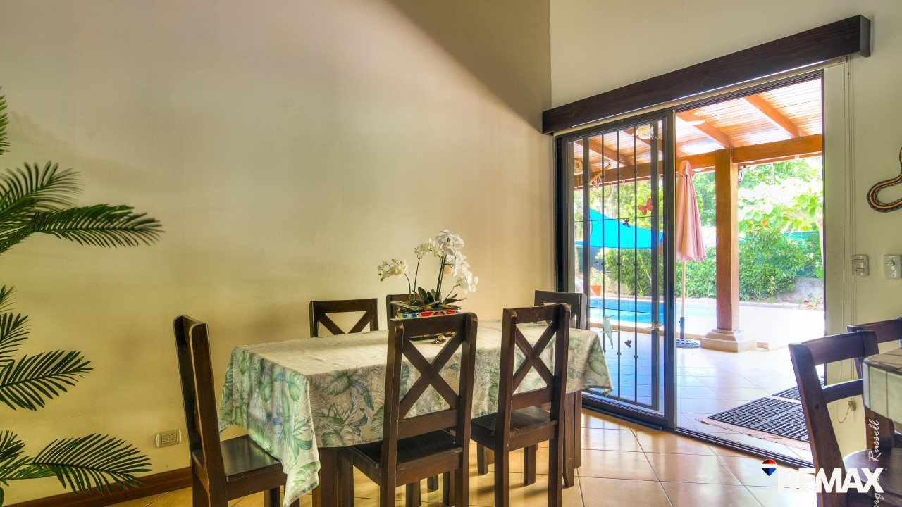 Construida sobre un lote de gran tamaño, la propiedad cuenta con un amplio patio trasero con una gran piscina, una **ducha y baño junto a la piscina**, y un **jardín exuberante perfecto para entretener o relajarse bajo el sol tropical. Los techos altos, las **vigas expuestas** y los acabados de **teca machihembrada** aportan una atmósfera abierta pero acogedora en toda la casa, combinando elegancia con el encanto típico de Costa Rica.
