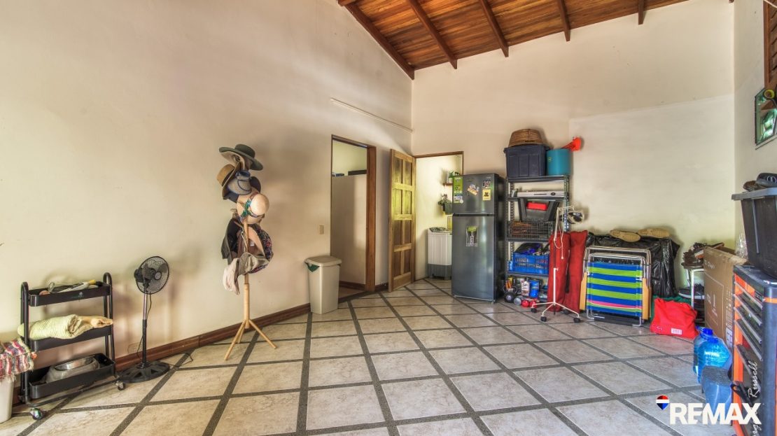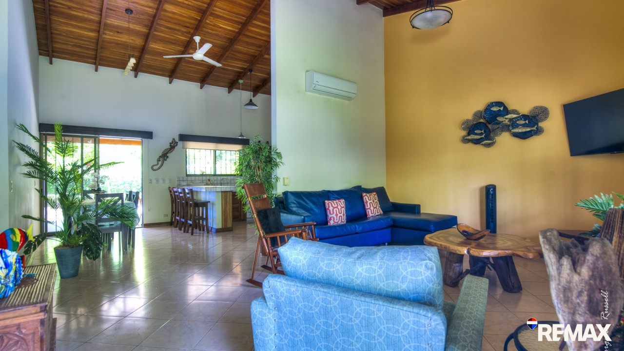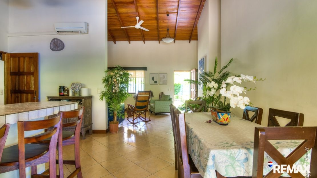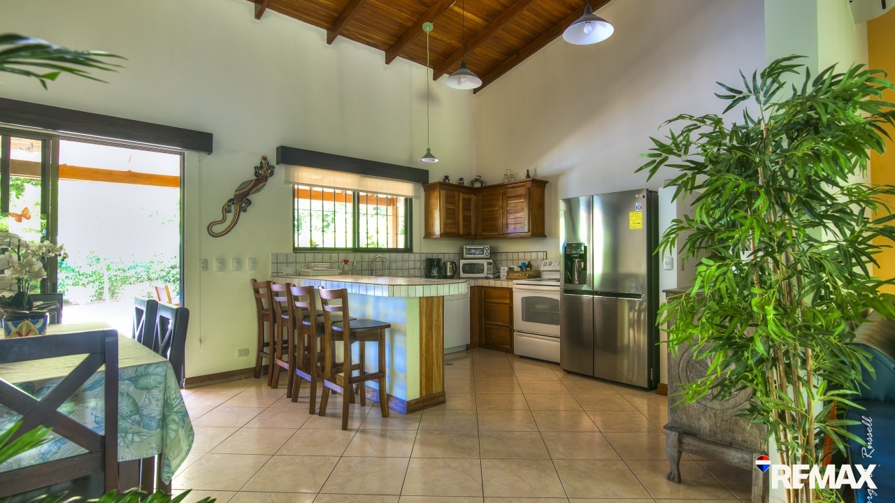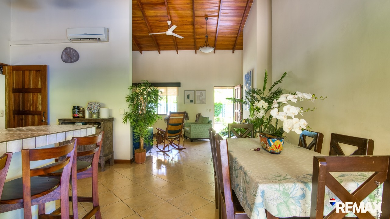 Située sur un terrain spacieux, la propriété dispose d’un **grand jardin arrière avec piscine**, une **douche extérieure et une salle de bain près de la piscine**, ainsi qu’un **patio verdoyant idéal pour recevoir ou se détendre sous le soleil tropical**. Les **plafonds hauts**, les **poutres apparentes** et les finitions en **teck rainuré** apportent une ambiance à la fois ouverte, chaleureuse et élégante, imprégnée du charme costaricien.