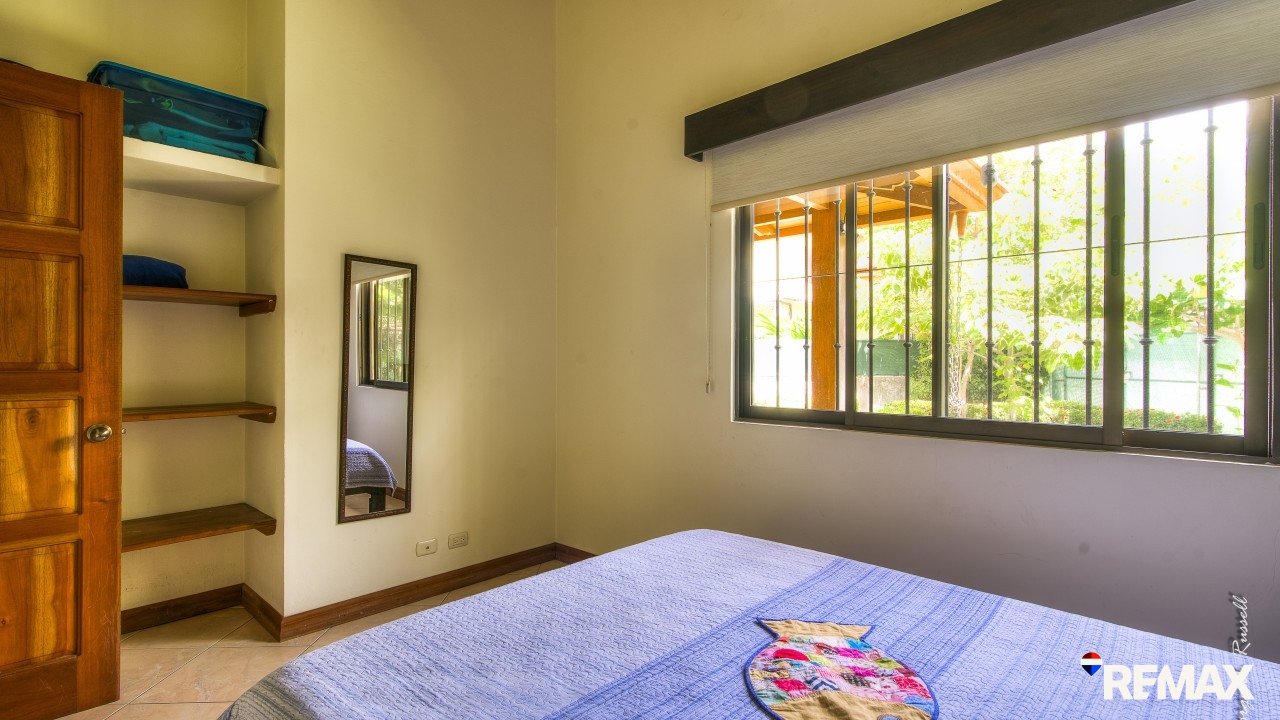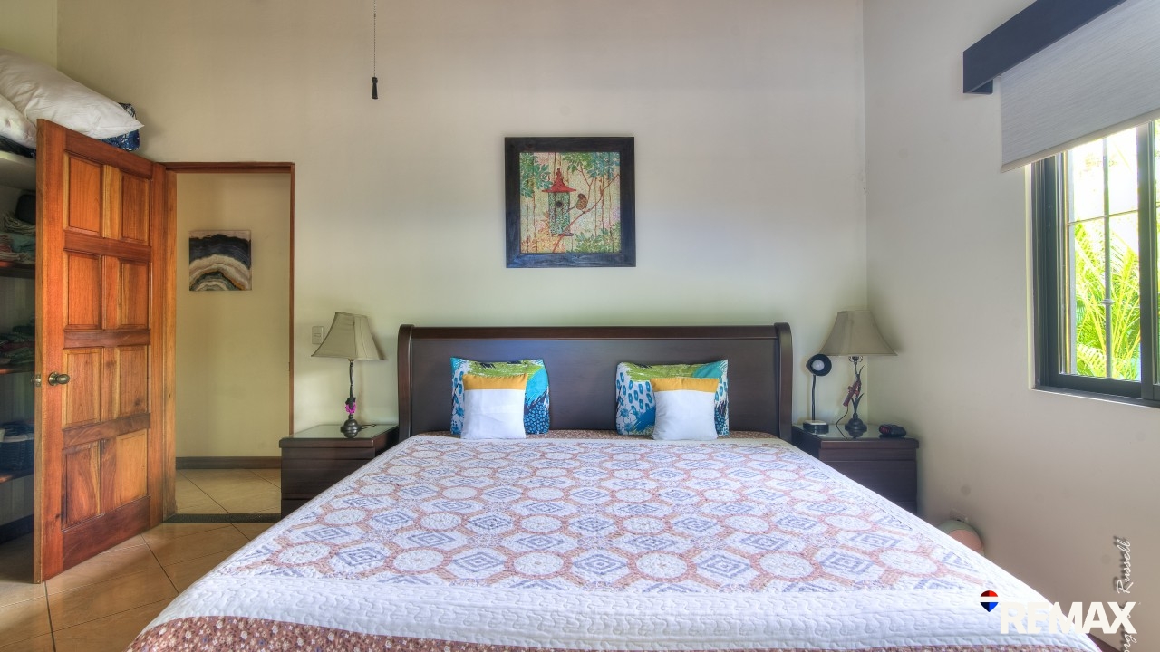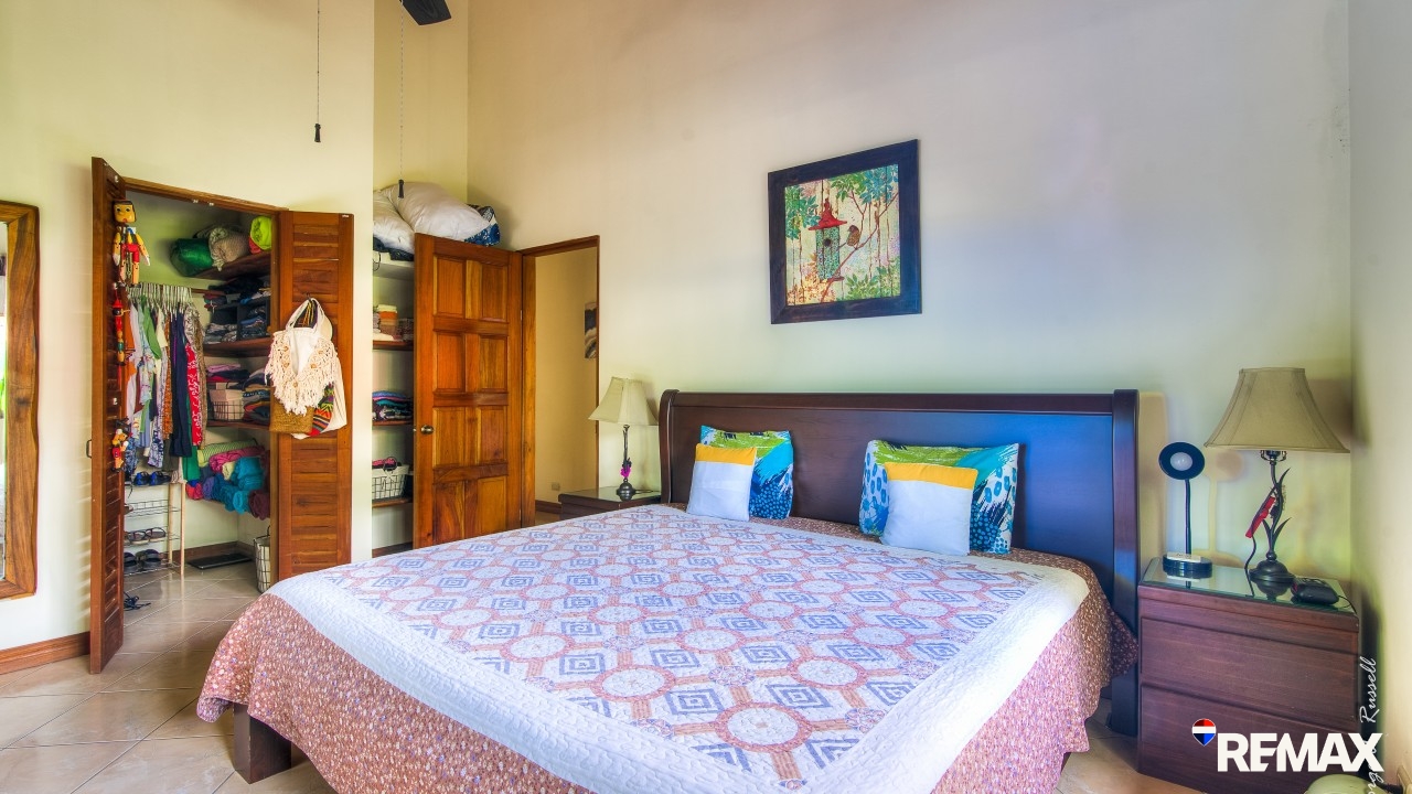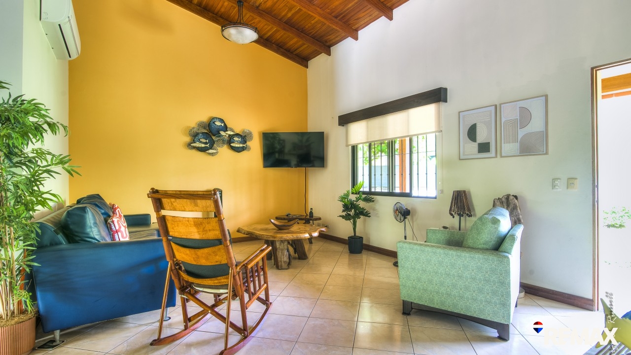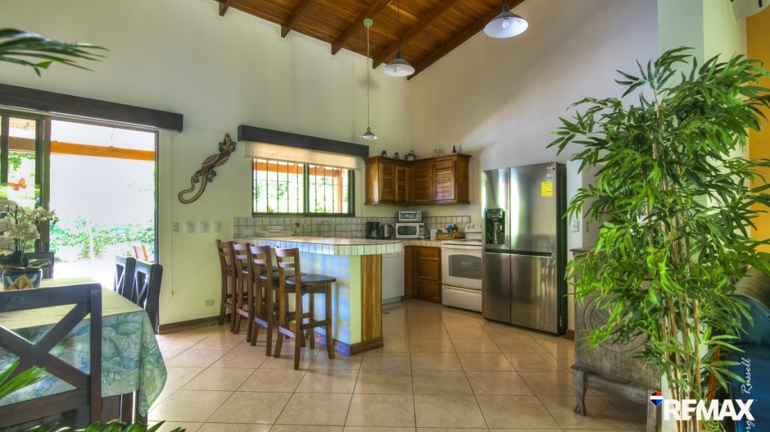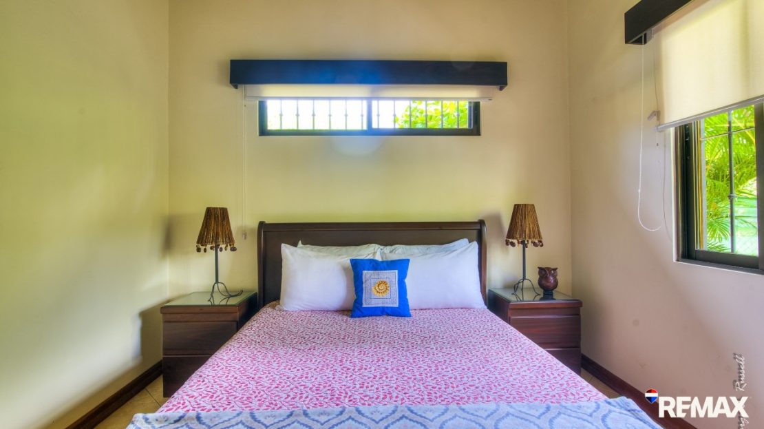 Située sur un terrain spacieux, la propriété dispose d’un **grand jardin arrière avec piscine**, une **douche extérieure et une salle de bain près de la piscine**, ainsi qu’un **patio verdoyant idéal pour recevoir ou se détendre sous le soleil tropical**. Les **plafonds hauts**, les **poutres apparentes** et les finitions en **teck rainuré** apportent une ambiance à la fois ouverte, chaleureuse et élégante, imprégnée du charme costaricien.