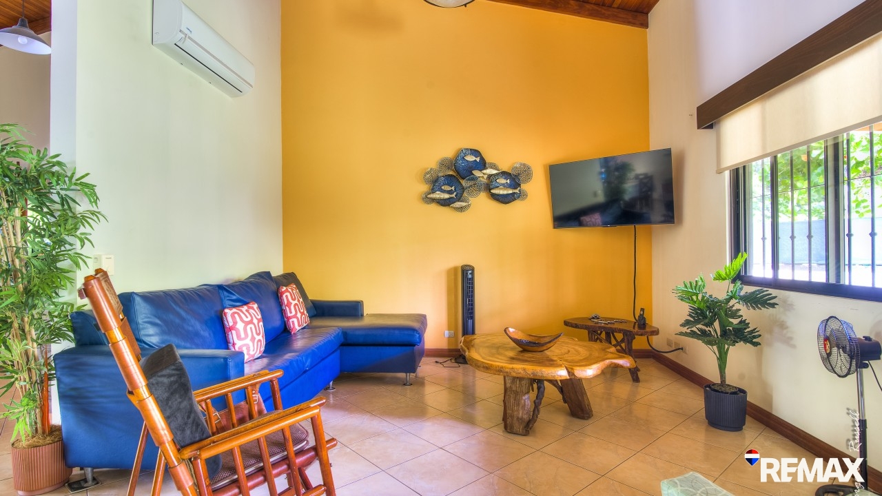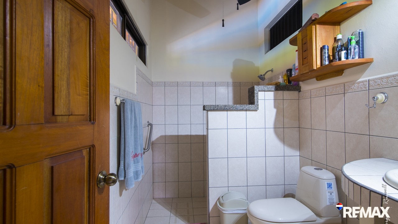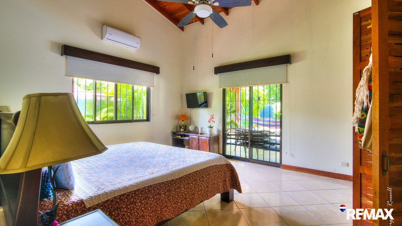 Set on an oversized lot, the home features a spacious backyard with a large pool, a **poolside shower and bathroom, and a **lush patio area perfect for entertaining or relaxing in the tropical sun. The home’s high ceilings, **exposed beams, and **tongue-and-groove teak finishes create an open yet warm atmosphere throughout, combining elegance with Costa Rican charm.