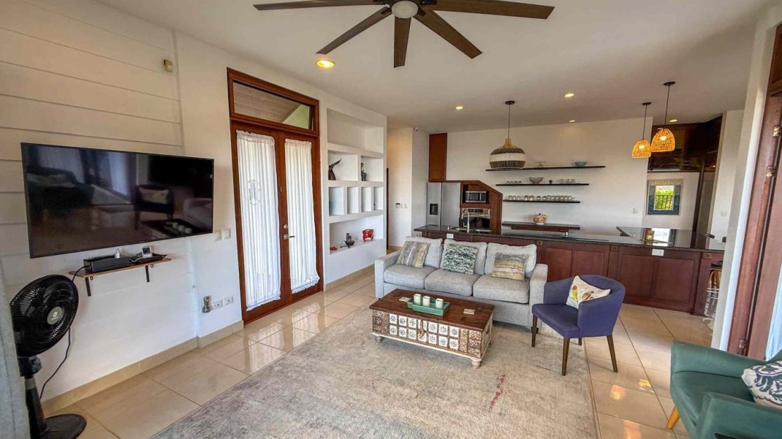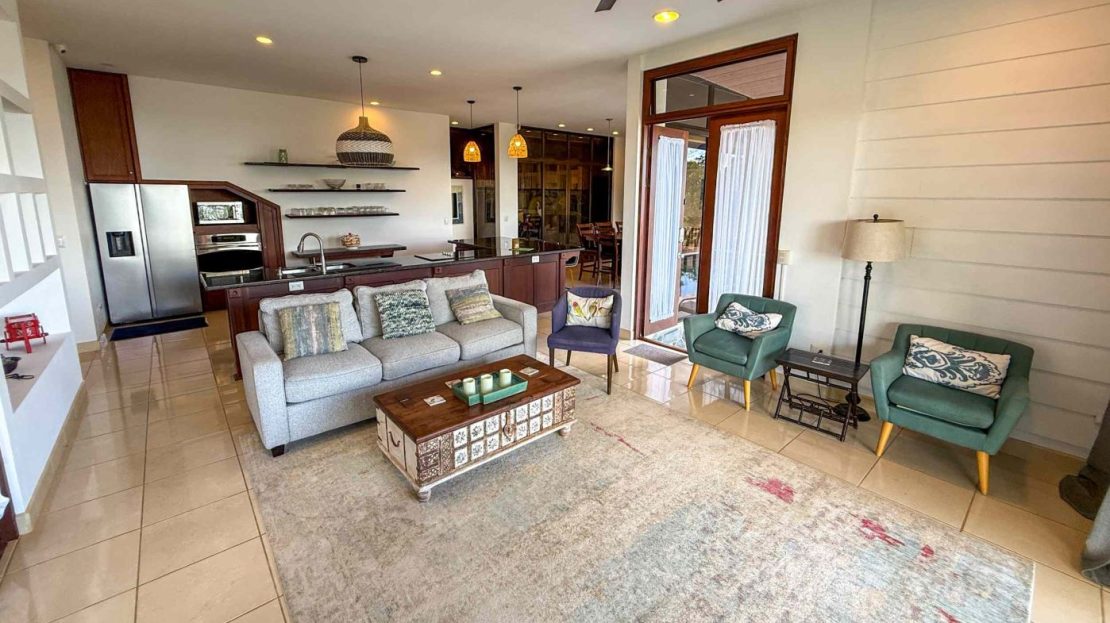 Step into an expansive open-concept living space where the boundaries between common indoor spaces disappear and flow to the comfortable outdoor living spaces. The “Chef’s Kitchen” is a culinary dream, boasting ample counter space and storage designed for hosting large gatherings. Whether you are hosting a formal dinner for eight, a casual breakfast for four at the breakfast bar, or dining al fresco on the terrace, the backdrop is always the same: a breathtaking, panoramic view of the Pacific Ocean and year-around sunsets. The living room is a sanctuary of comfort, featuring a large television and plush seating, perfectly positioned to capture the ocean breeze and the shifting colors of the sunset.