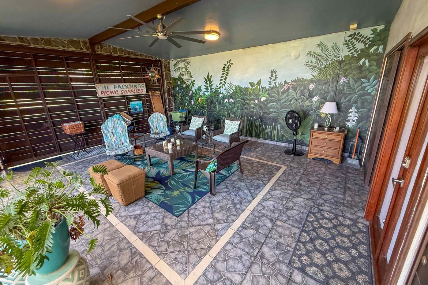 · The Rancho: A massive, screened-in rancho features a custom mural and an oversized fan, providing a bug-free environment to lounge and entertain in total comfort. It also includes a couple of large closets for storing tools and other items.