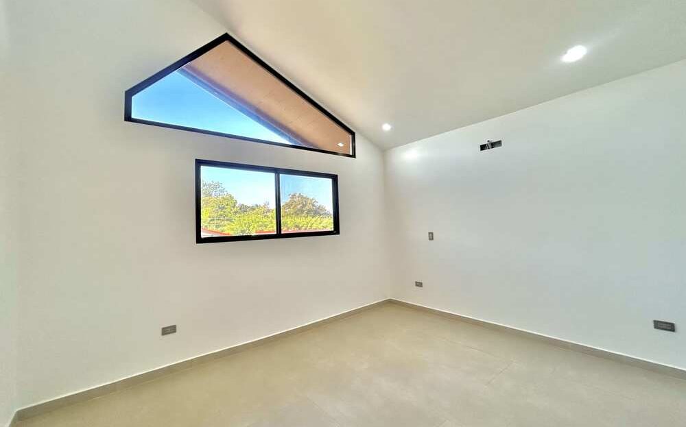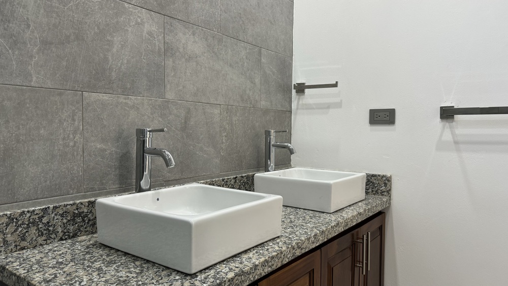 Furthermore, the master bedroom is located on the lower level of the house with its own closet and bathroom, adding comfort and privacy. It has access from the living room and large sliding glass doors that lead you to the pool through a detailed deck with high-quality wood. On the second floor, you’ll find two guest rooms with queen-size bed capacity and a shared bathroom. Additionally, there’s a small balcony to enjoy the breeze and neighborhood views. From the upper part of the house, you’ll have a lovely view of the living room and sitting area.