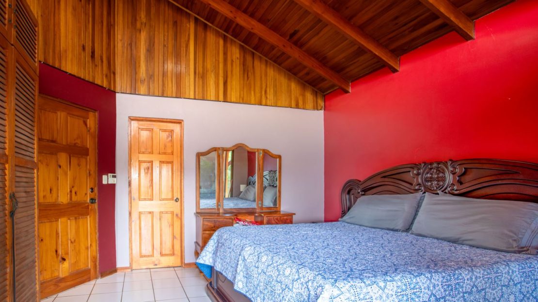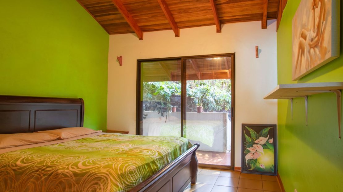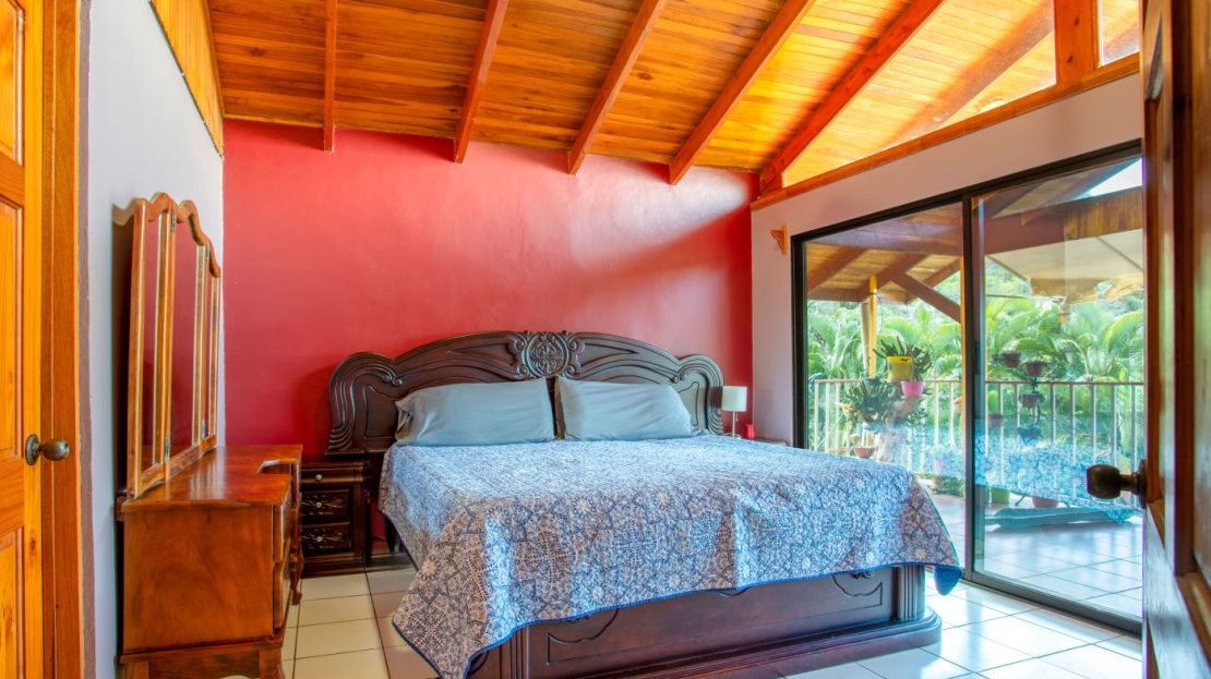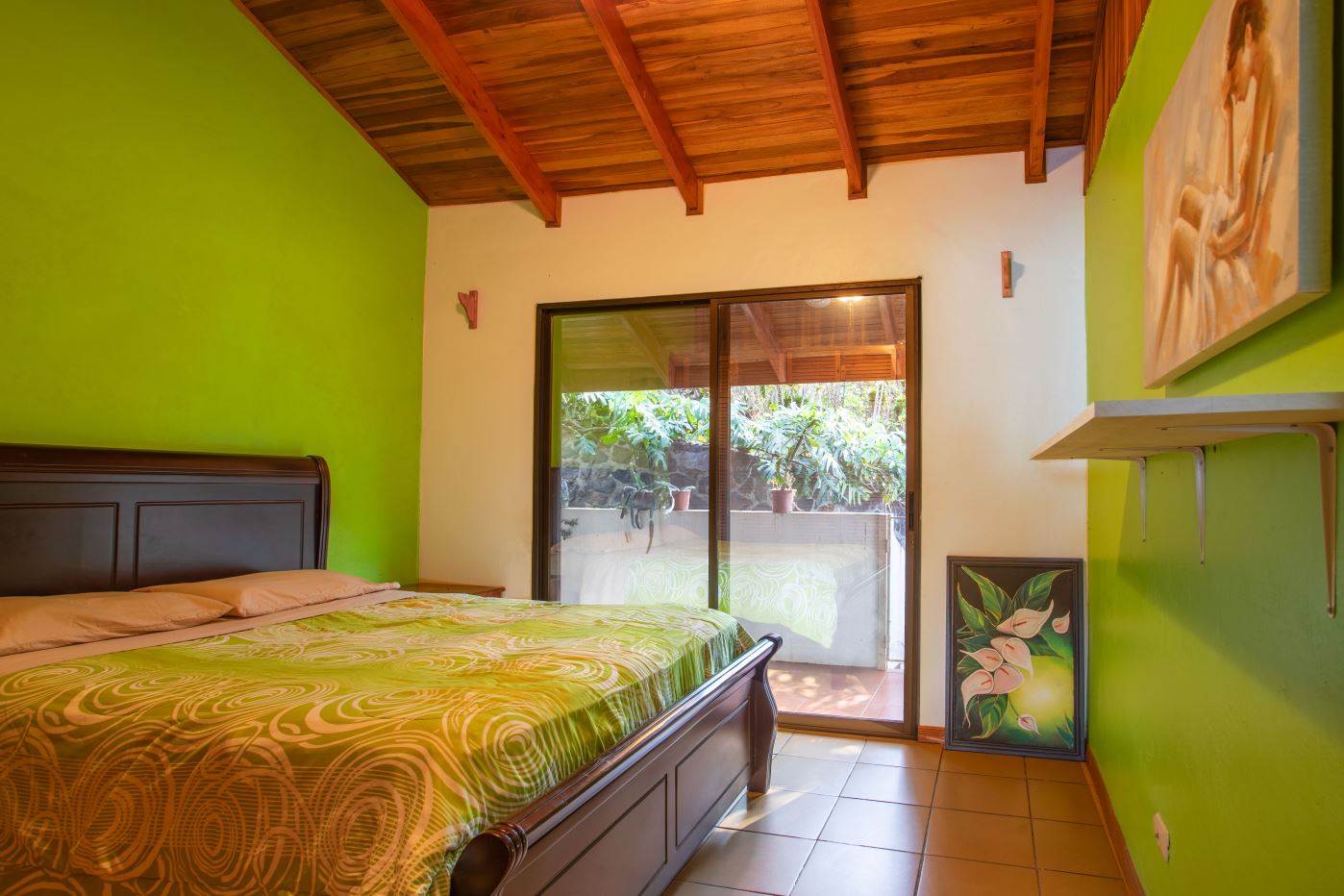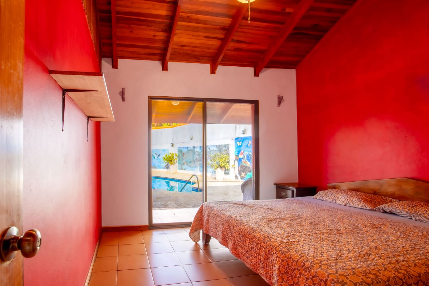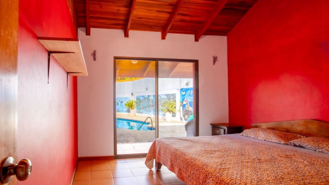 El dormitorio n.° 5 comparte un baño completo con el dormitorio n.° 6. Excelente vista de las flores, las plantas, la piscina y la cocina al aire libre.