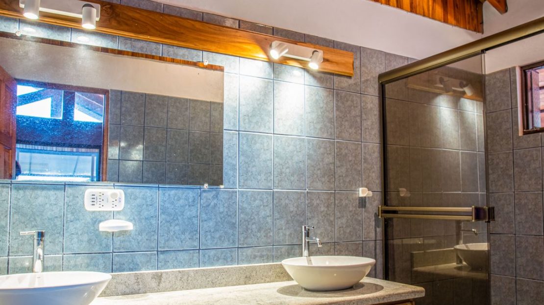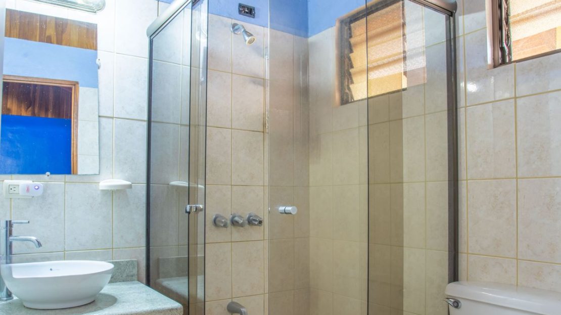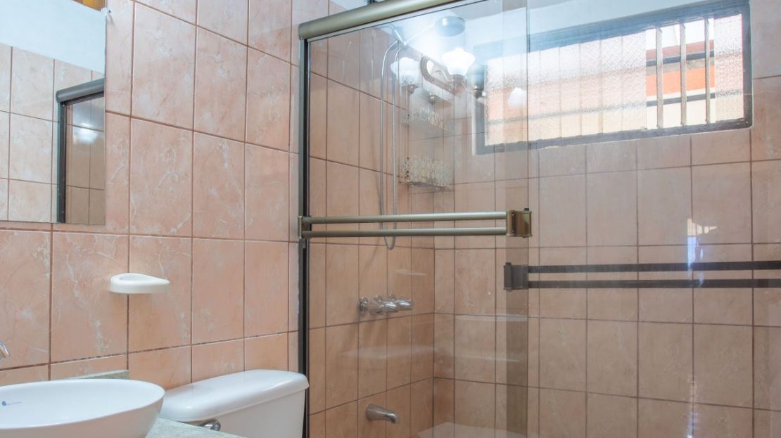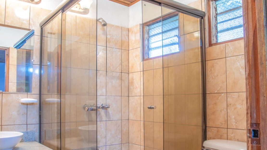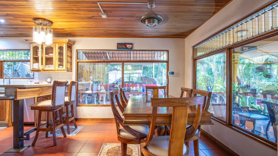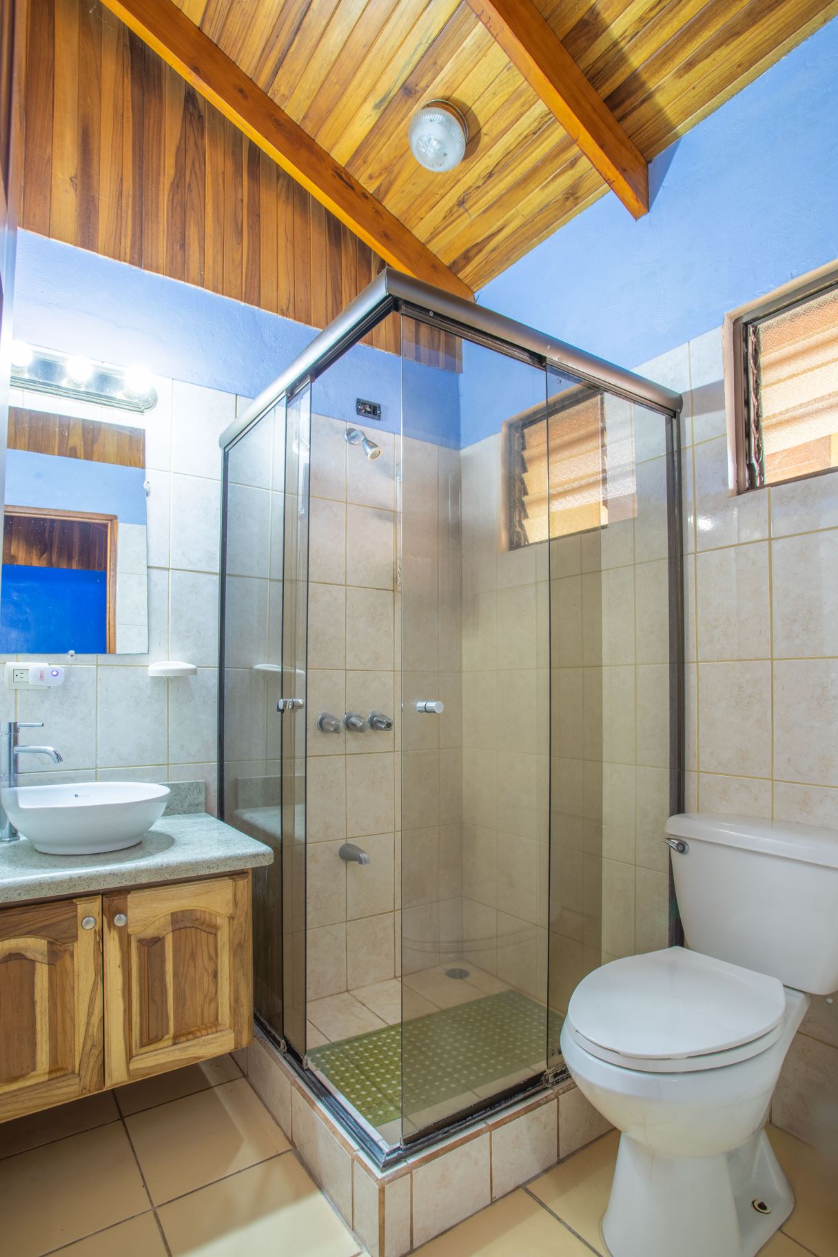 El dormitorio n.° 5 comparte un baño completo con el dormitorio n.° 6. Excelente vista de las flores, las plantas, la piscina y la cocina al aire libre.