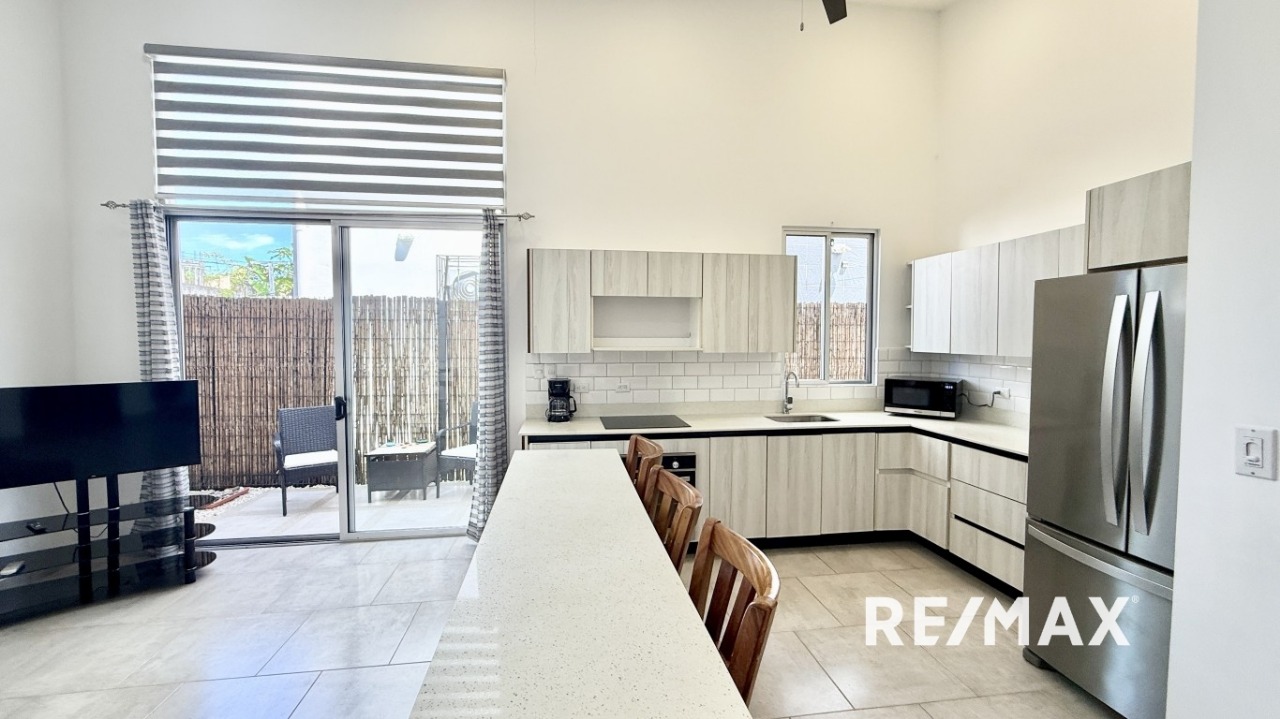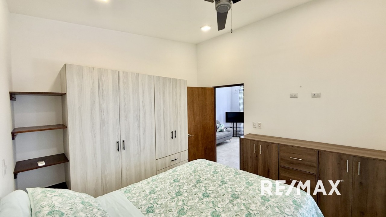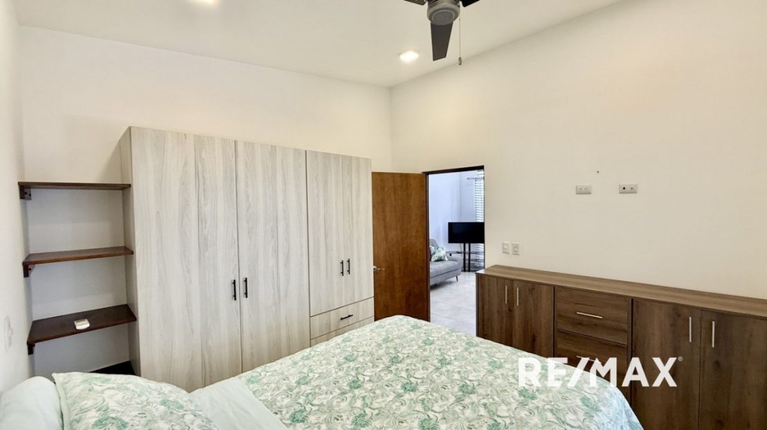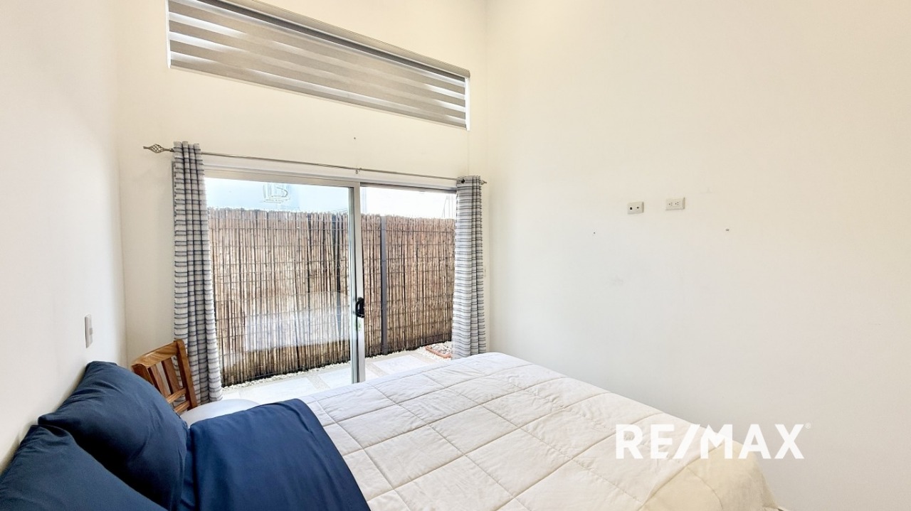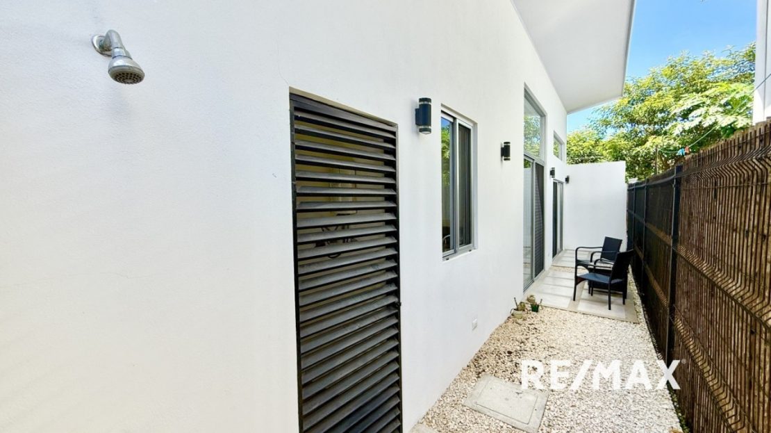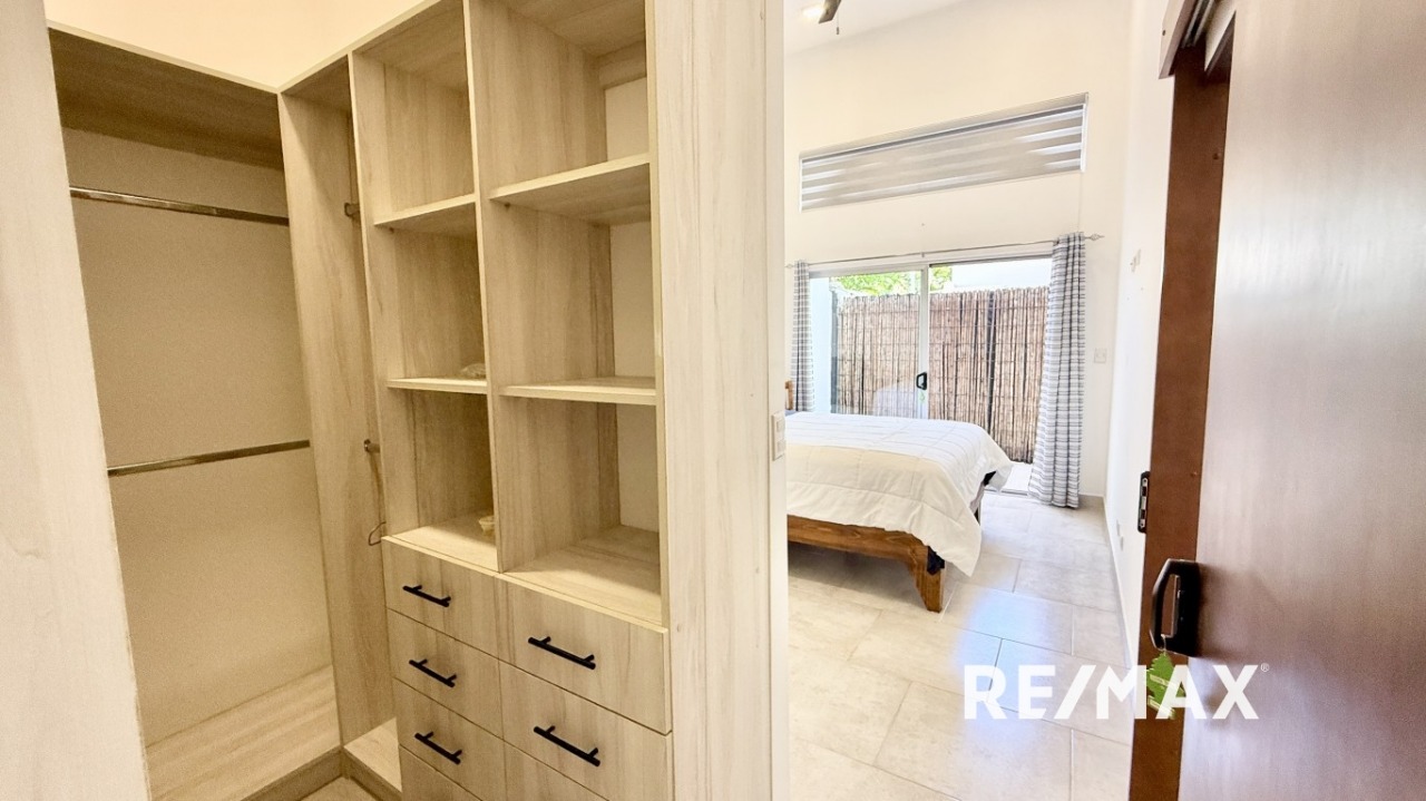 Al entrar, encontrarás habitaciones confortables, una cocina moderna y refinada, y áreas de estar agradables, todas equipadas con aire acondicionado para tu comodidad durante todo el año. También cuenta con un walk-in closet en la habitacion principal con su baño privado, múltiples espacios de almacenamiento, un cuarto de lavandería independiente, una ducha exterior y un encantador patio lateral privado, perfecto para disfrutar tu café de la mañana.