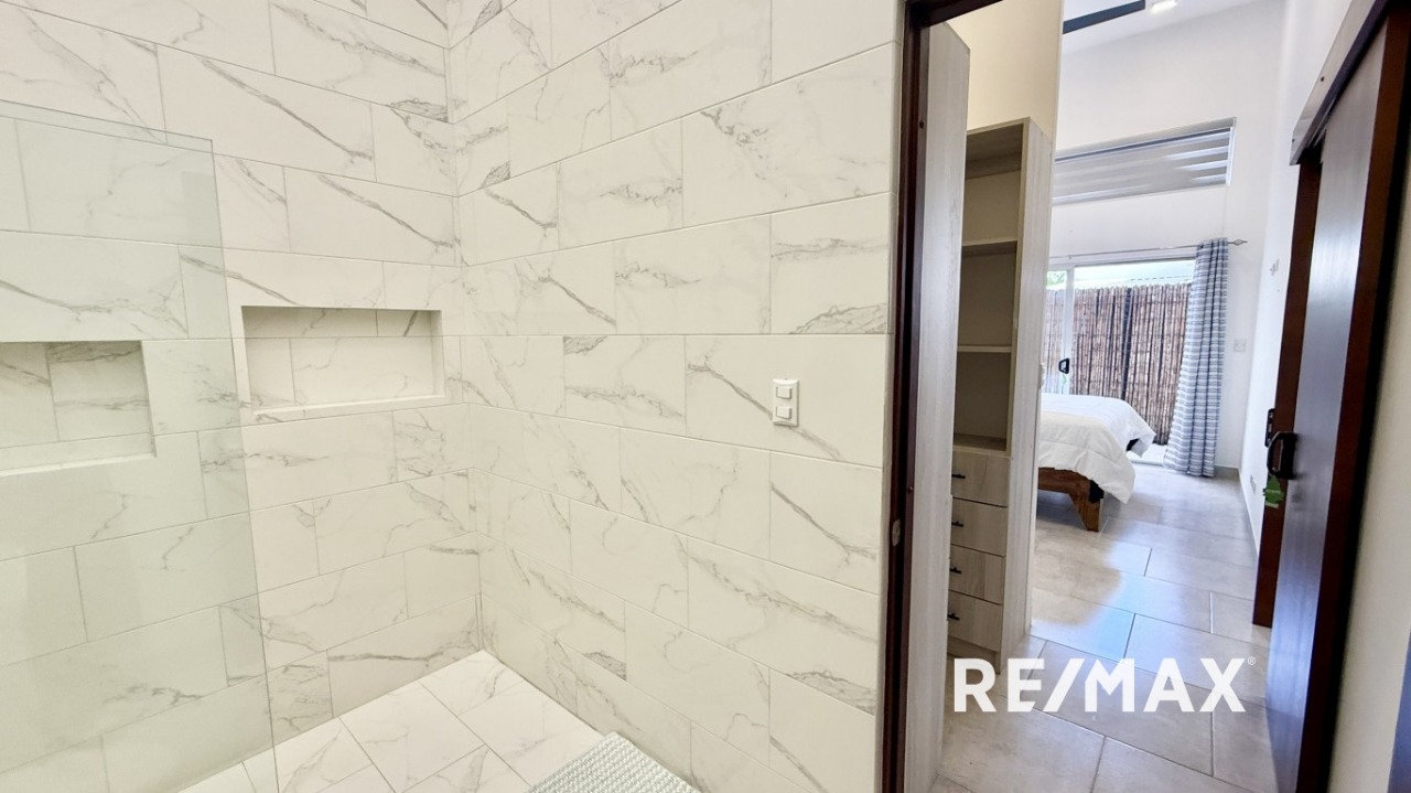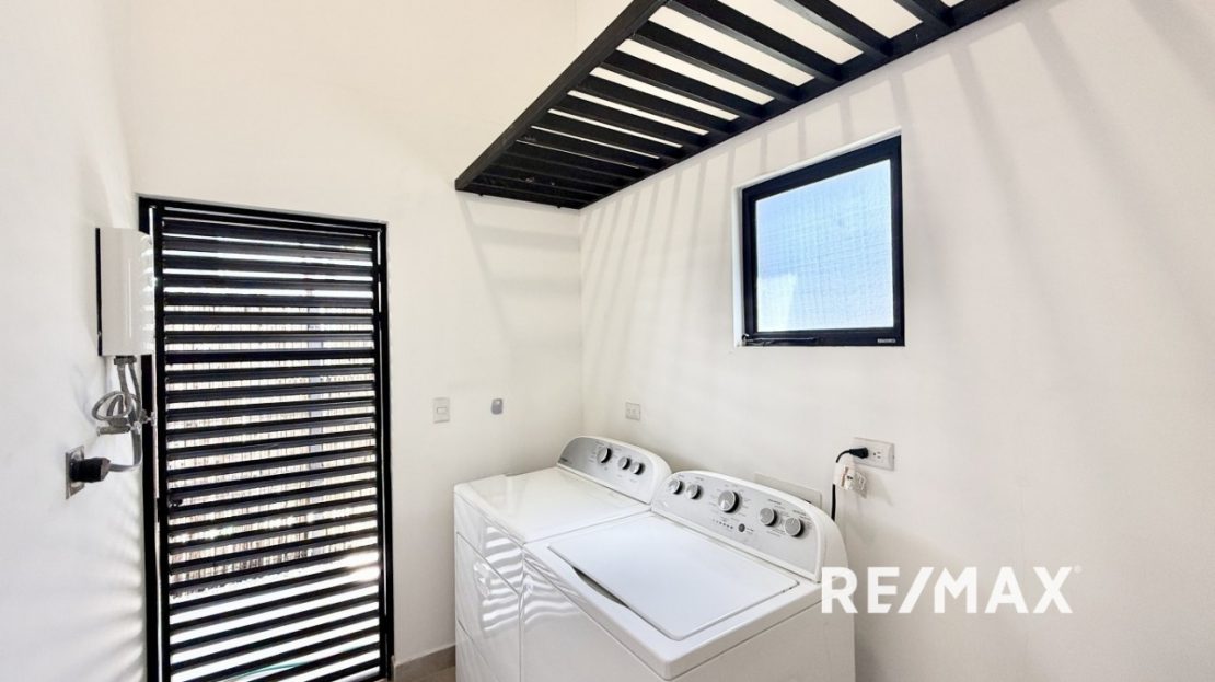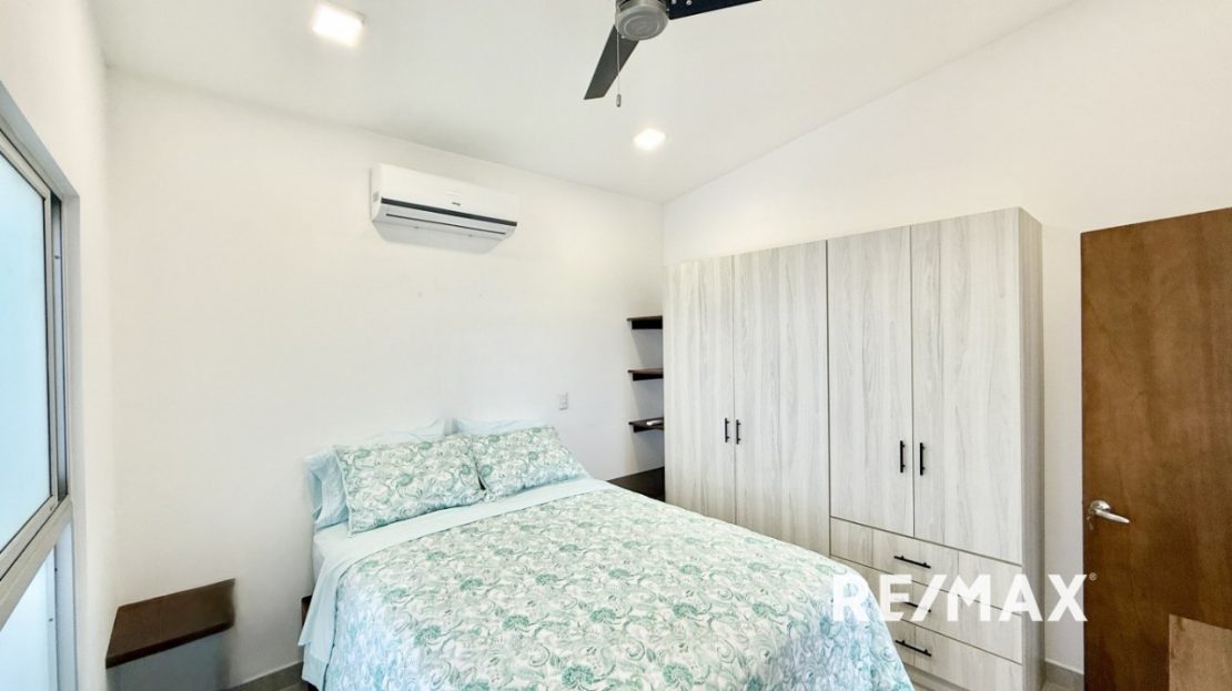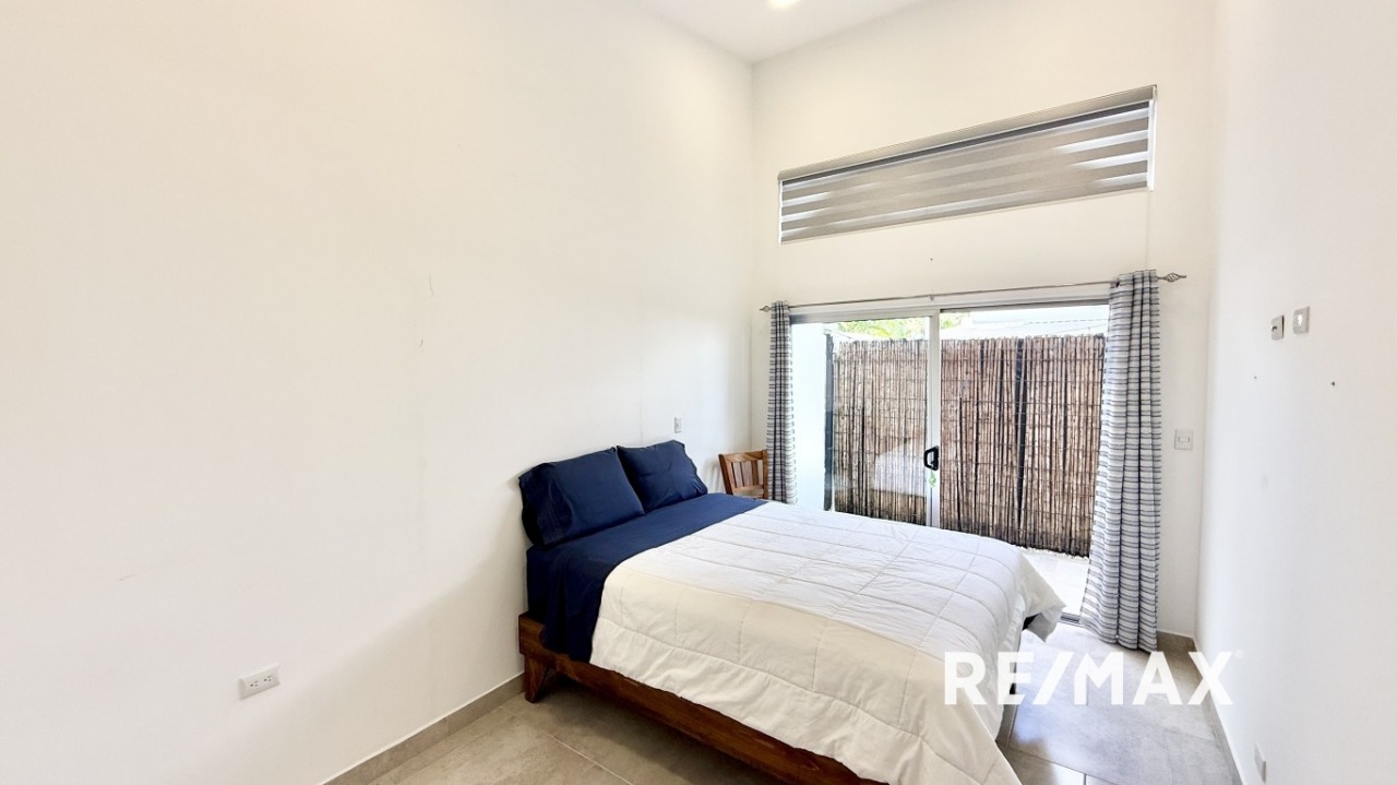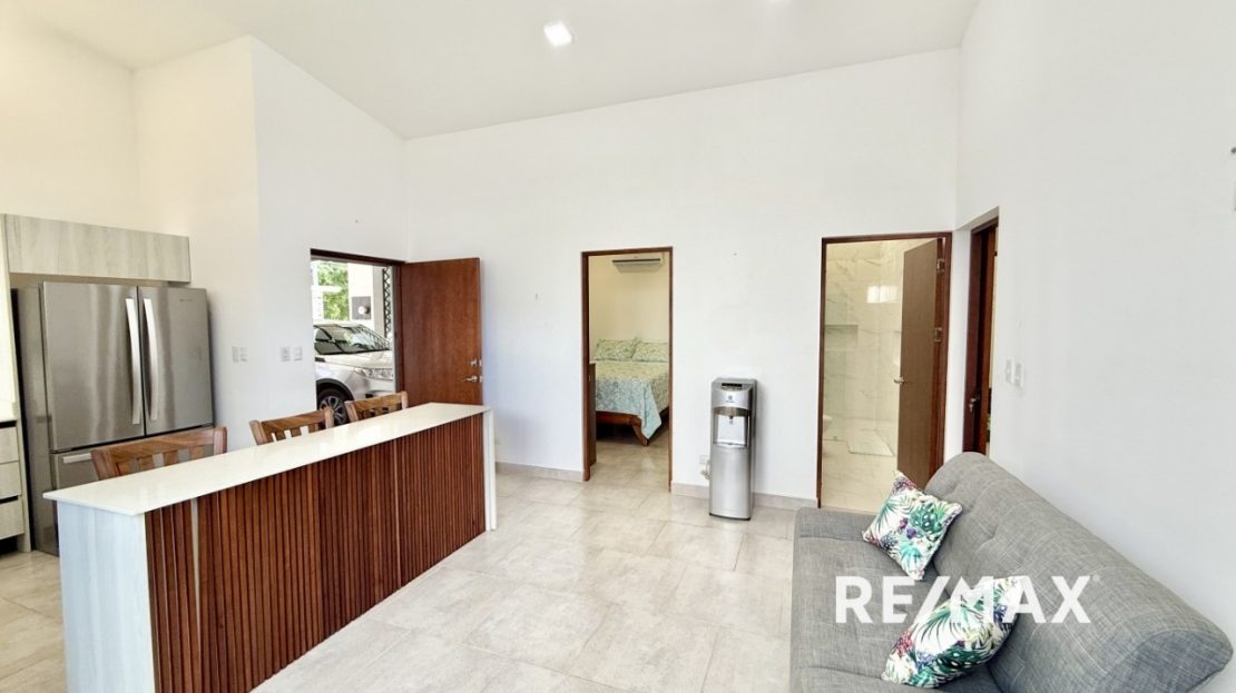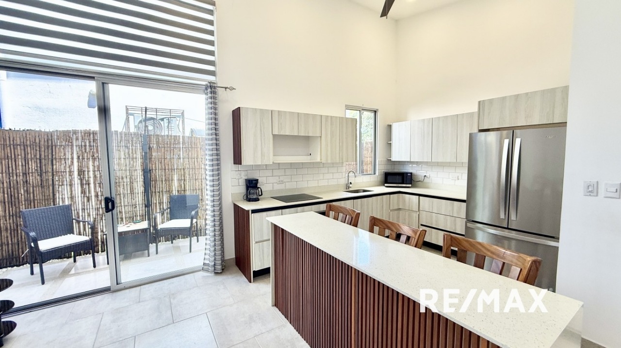 Al entrar, encontrarás habitaciones confortables, una cocina moderna y refinada, y áreas de estar agradables, todas equipadas con aire acondicionado para tu comodidad durante todo el año. También cuenta con un walk-in closet en la habitacion principal con su baño privado, múltiples espacios de almacenamiento, un cuarto de lavandería independiente, una ducha exterior y un encantador patio lateral privado, perfecto para disfrutar tu café de la mañana.