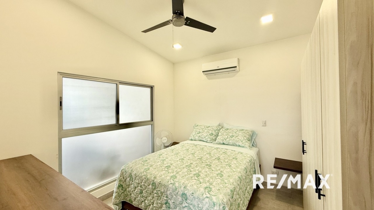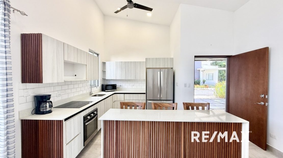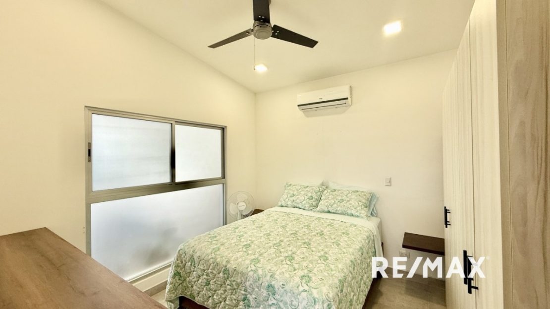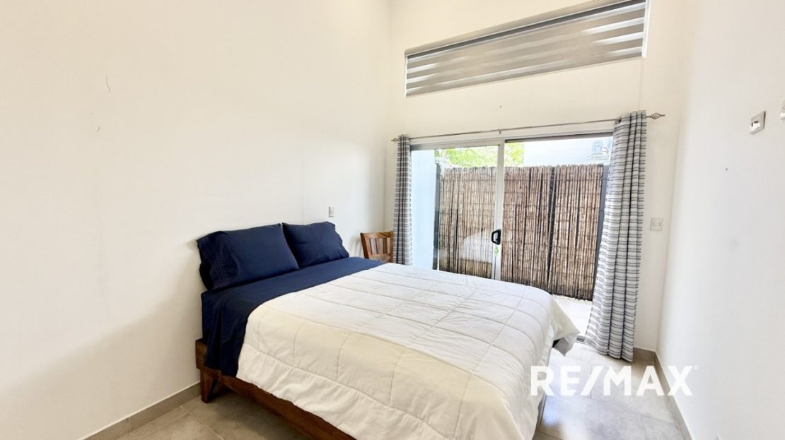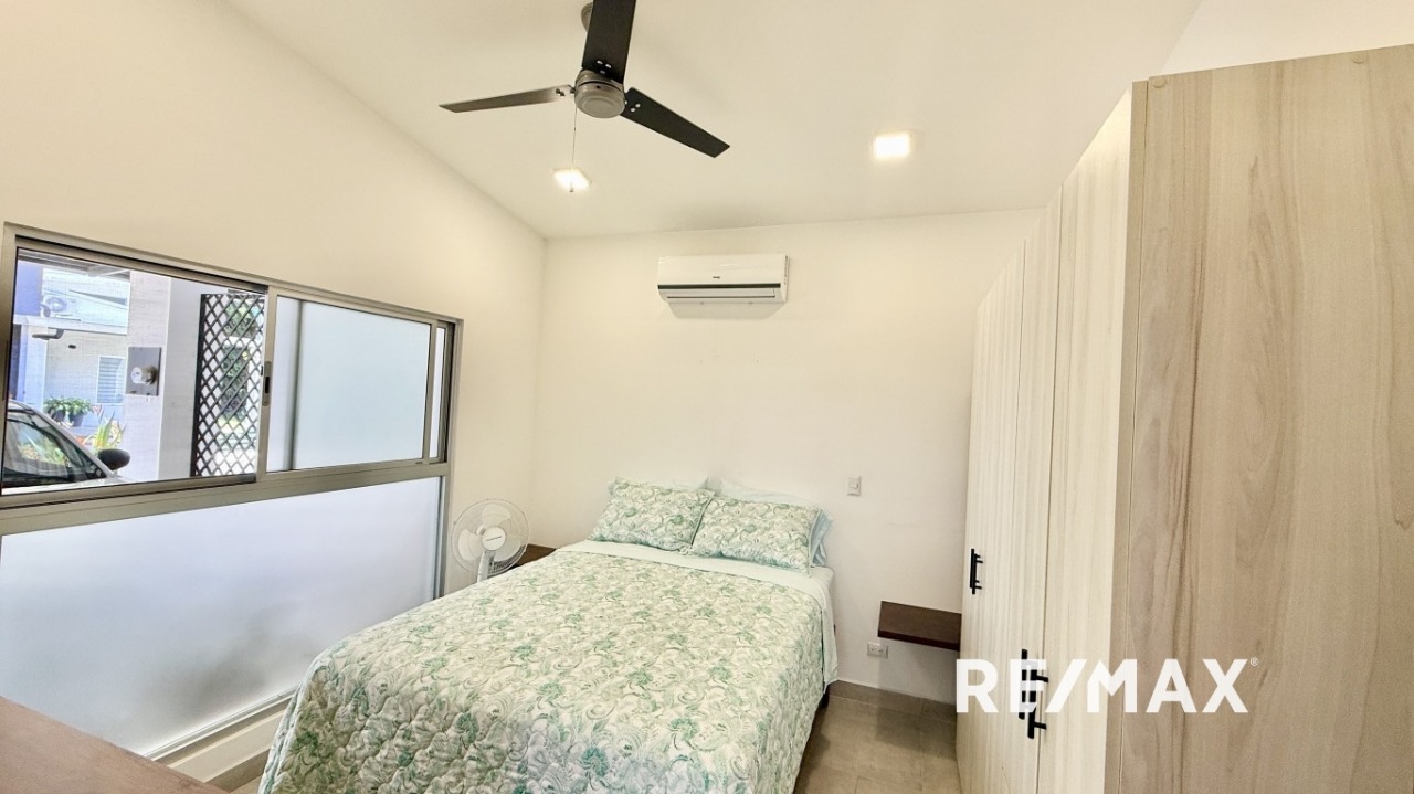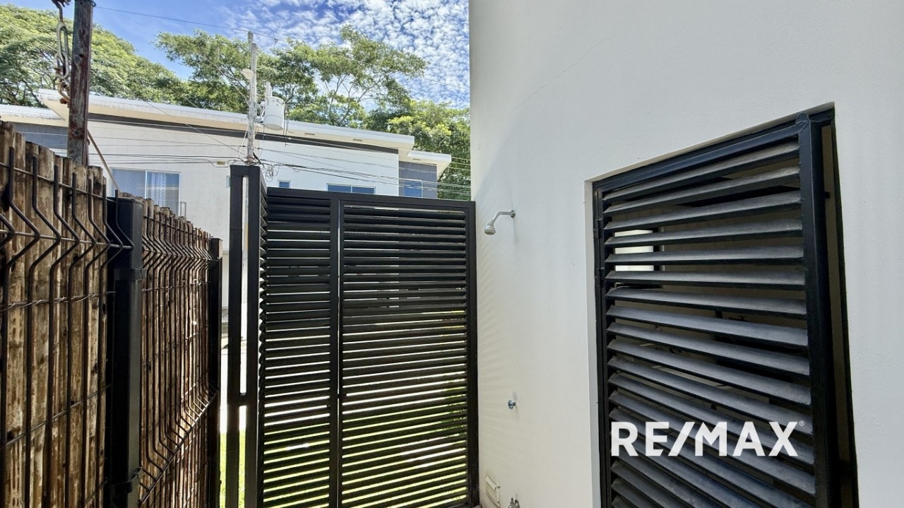 Al entrar, encontrarás habitaciones confortables, una cocina moderna y refinada, y áreas de estar agradables, todas equipadas con aire acondicionado para tu comodidad durante todo el año. También cuenta con un walk-in closet en la habitacion principal con su baño privado, múltiples espacios de almacenamiento, un cuarto de lavandería independiente, una ducha exterior y un encantador patio lateral privado, perfecto para disfrutar tu café de la mañana.