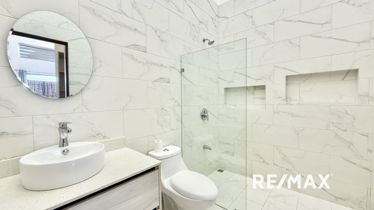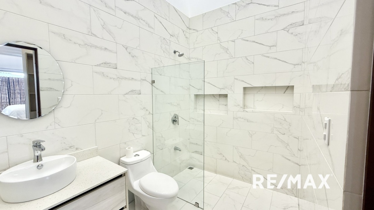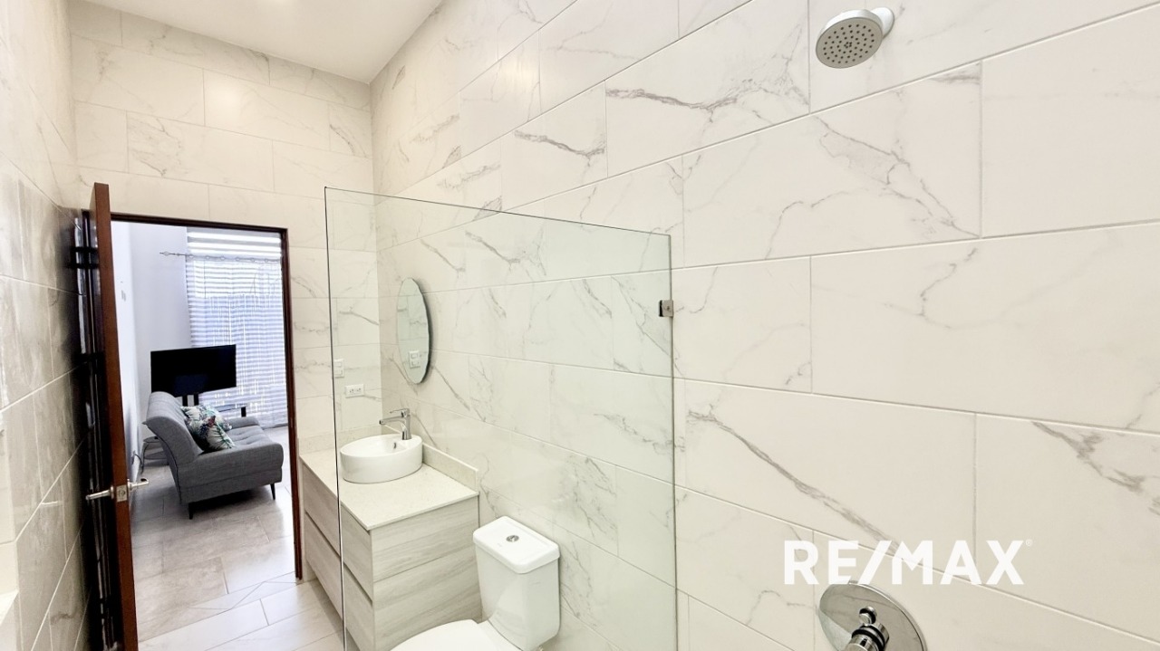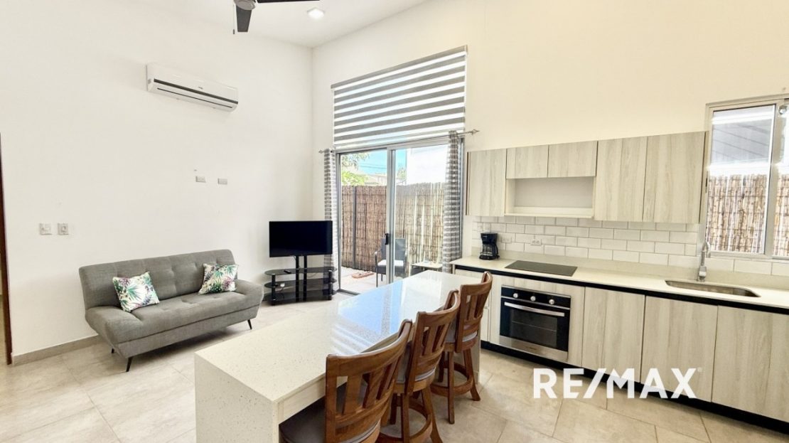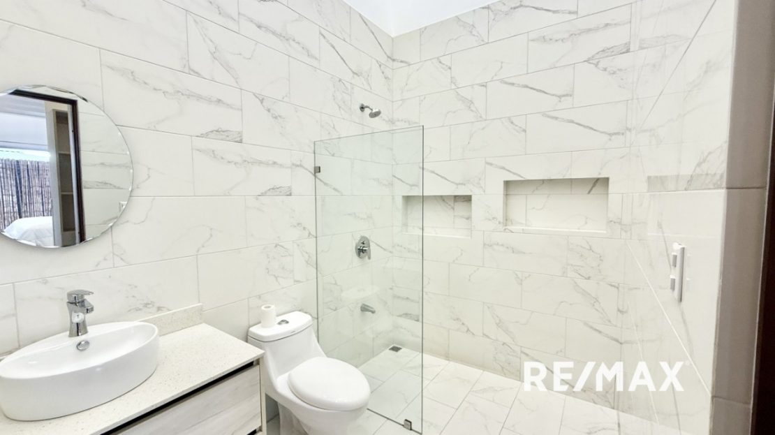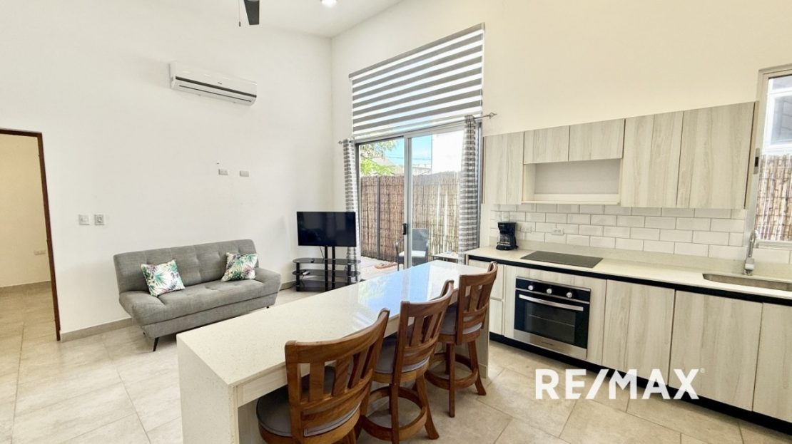 Al entrar, encontrarás habitaciones confortables, una cocina moderna y refinada, y áreas de estar agradables, todas equipadas con aire acondicionado para tu comodidad durante todo el año. También cuenta con un walk-in closet en la habitacion principal con su baño privado, múltiples espacios de almacenamiento, un cuarto de lavandería independiente, una ducha exterior y un encantador patio lateral privado, perfecto para disfrutar tu café de la mañana.