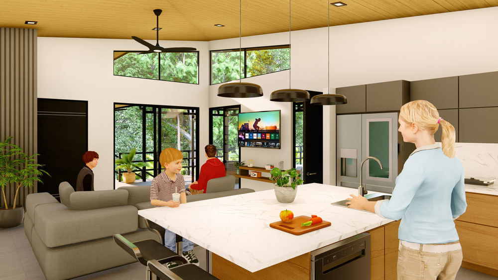 The home features 3 spacious bedrooms, each with a private bathroom and closet, all facing a refreshing and elegant pool. The open-concept living space includes a modern living room with a sofa and television, flowing into the kitchen, which boasts a quartz island, stylish cabinets, and plenty of room for family gatherings. A convenient guest half-bathroom adds to the comfort of this thoughtfully designed space. From the pool, you’ll enjoy serene views of the bordering creek, and you may even spot howler or white-faced monkeys as you relax and take in the tranquility that only Costa Rica offers.