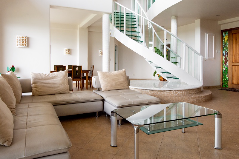 The glass princess staircase, gently curves to the top of the penthouse. A main feature is the alpine teak ceiling surrounded by huge windows.