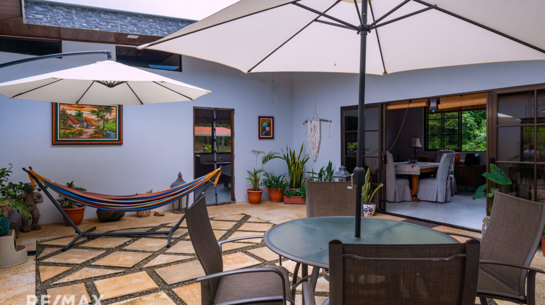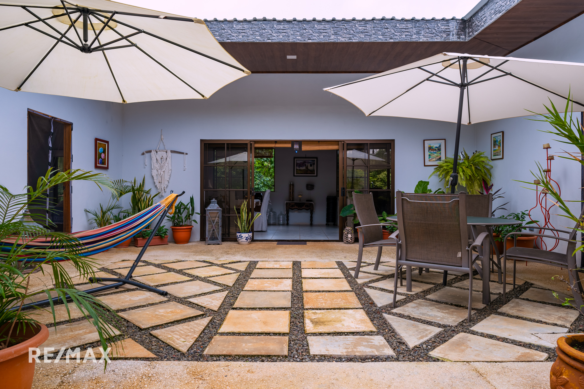 A well-equipped kitchen makes meal preparation a joy. Adjacent to the kitchen is a dining area that comfortably accommodates family gatherings and dinner parties. In the center of the house, this is the common patio space that is open air.