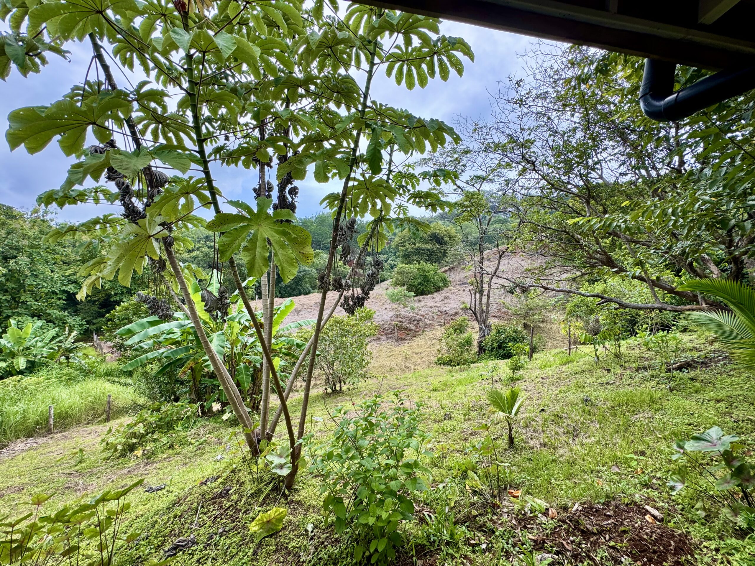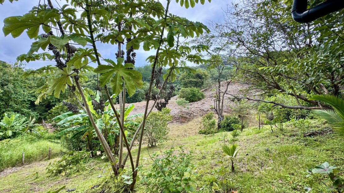 El terreno cuenta con plátanos, anacardos, cocoteros enanos, hierba limón y culantro silvestre, con espacio adicional para ampliar o cultivar.