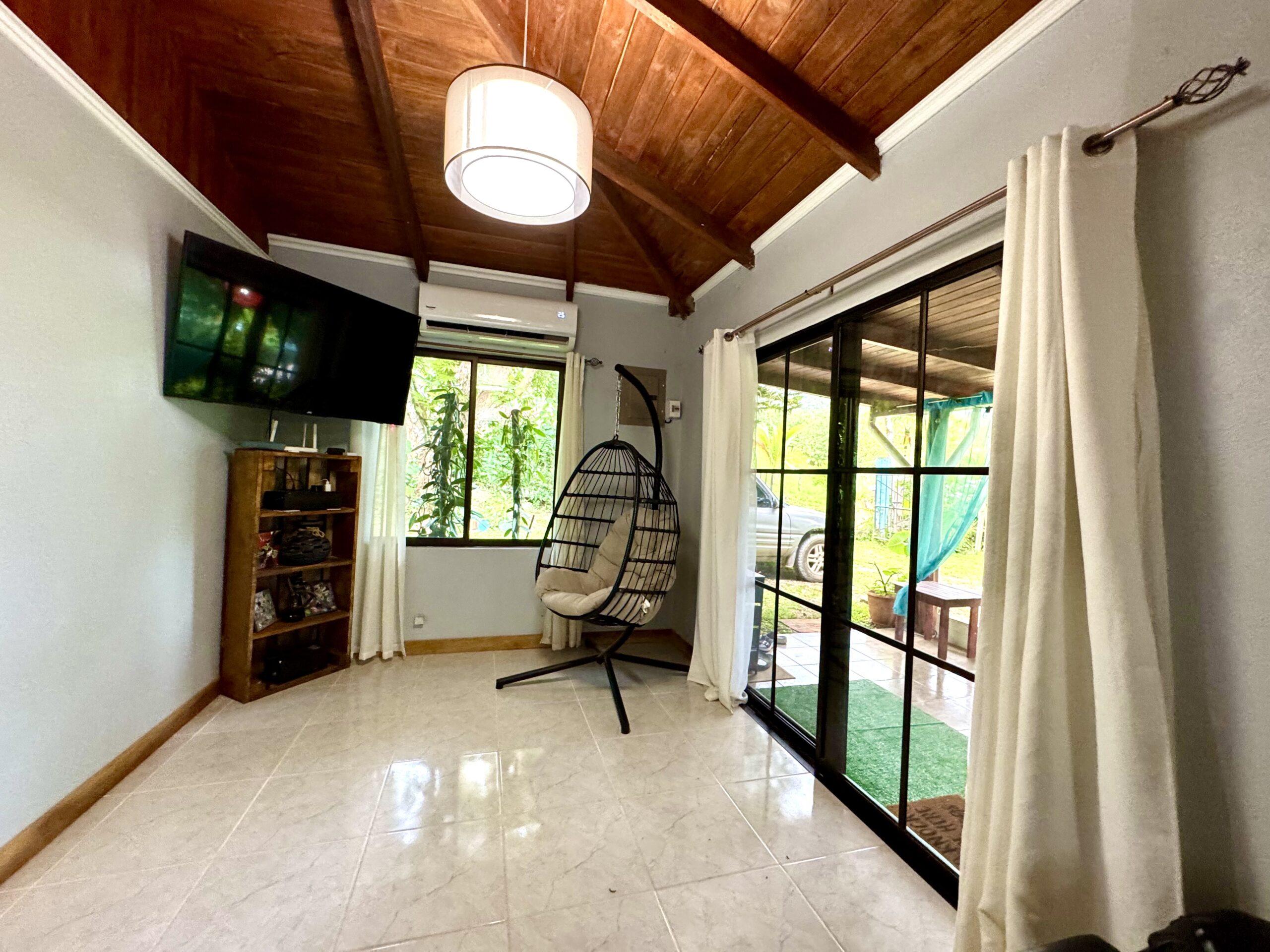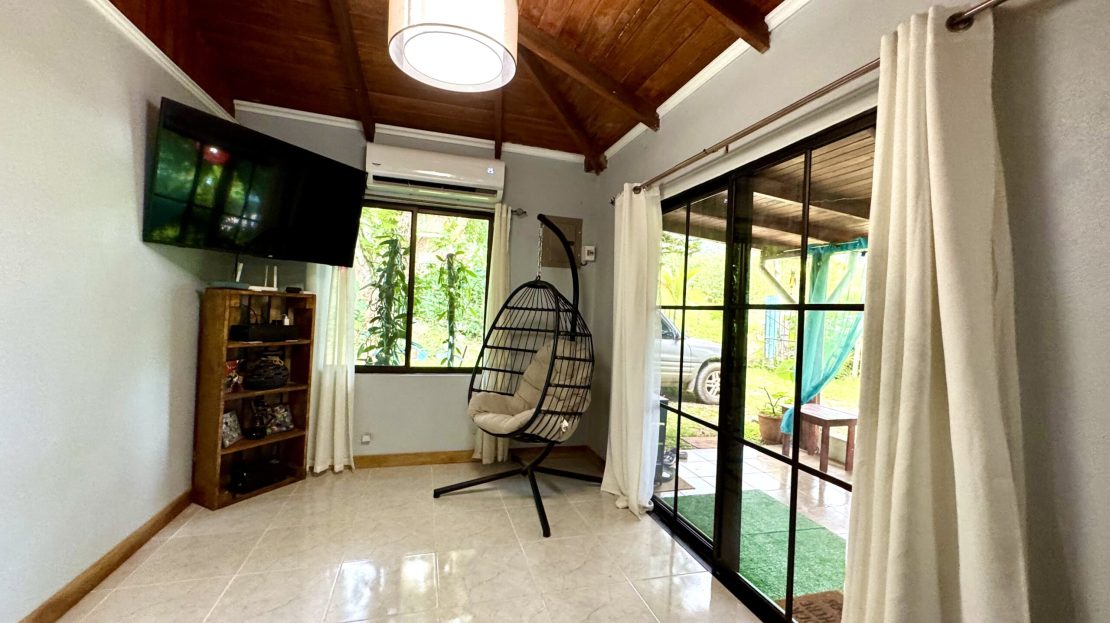 Inside, you’ll find three cozy bedrooms, two of which feature custom-built furniture for added style and storage. The modern kitchen is spacious and bright, offering a large center island, plenty of cabinetry, and panoramic windows framing beautiful views of the mountains and tropical forest. The L-shaped layout flows naturally into the living area, cooled by an efficient A/C unit that keeps the entire home comfortable year-round.