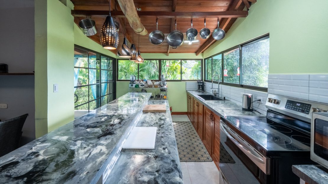 À l’intérieur, vous trouverez trois chambres confortables, dont deux avec mobilier sur mesure. La cuisine moderne est spacieuse et lumineuse, équipée d’un grand îlot central, de nombreux rangements et de fenêtres panoramiques offrant une vue apaisante sur les montagnes et la forêt tropicale. Son agencement en « L » crée une belle fluidité avec le séjour, climatisé pour un confort optimal toute l’année.