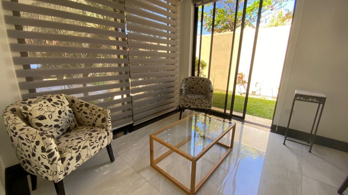 La sala de estar se abre a un patio lateral, perfecto para relajarse al aire libre o disfrutar de comidas. Este espacio también cuenta con un hermoso jardín.