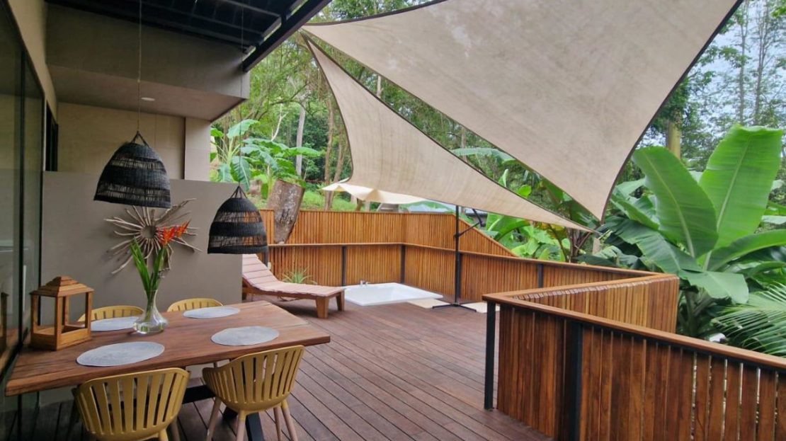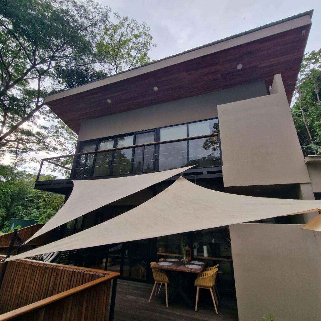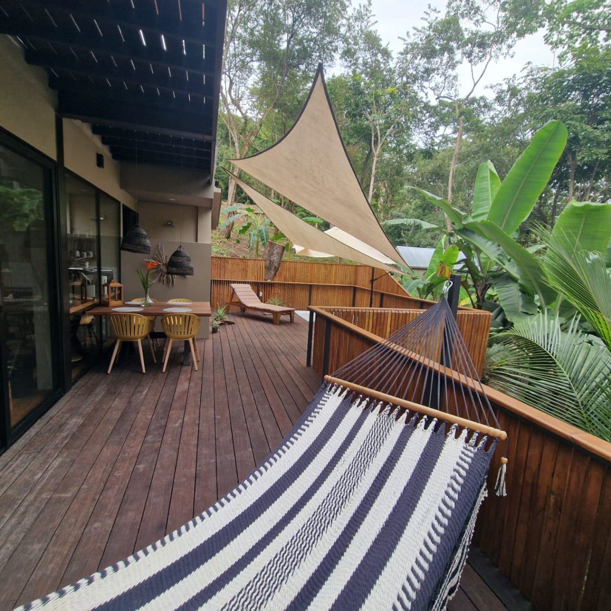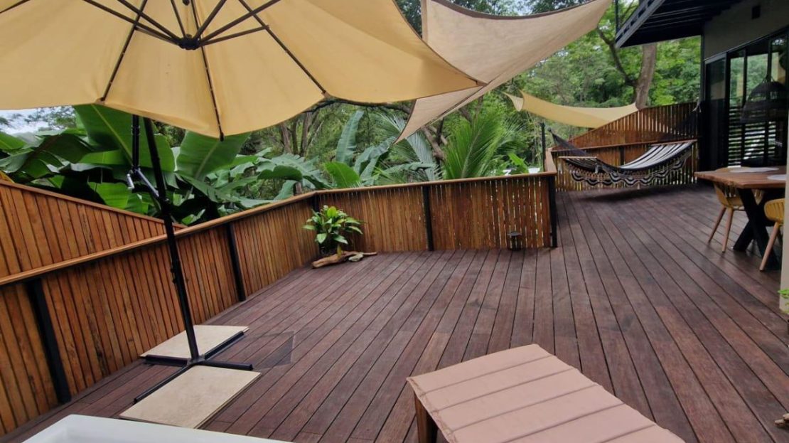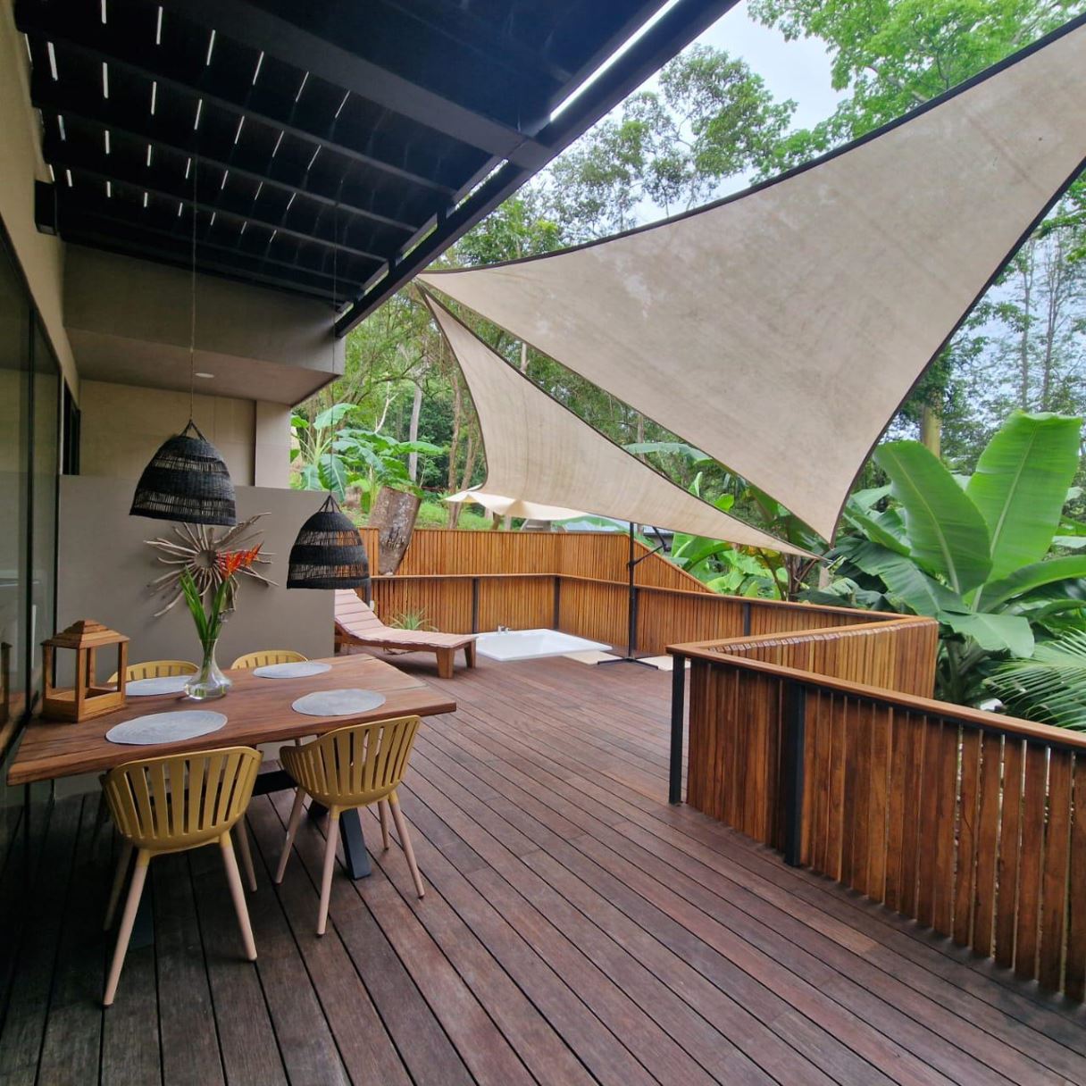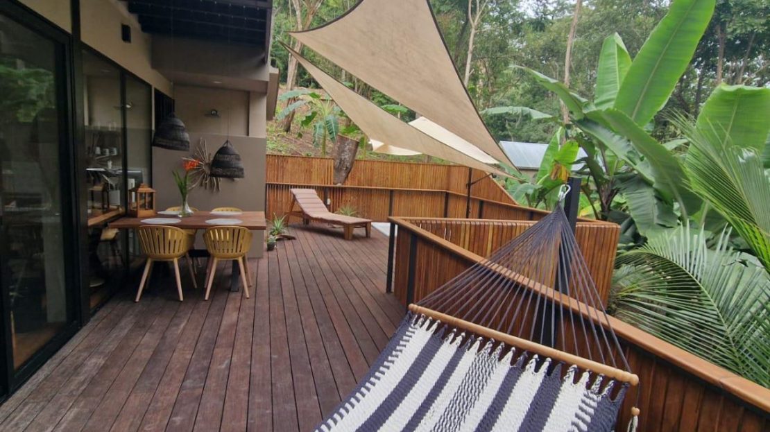 Espacios Exteriores Acogedores – Una hermosa zona de estar al aire libre perfecta para relajarse, cenar y disfrutar del entorno natural de Costa Rica.