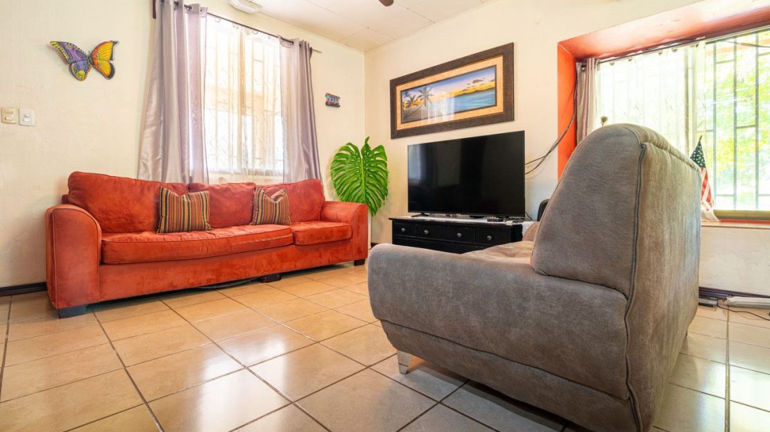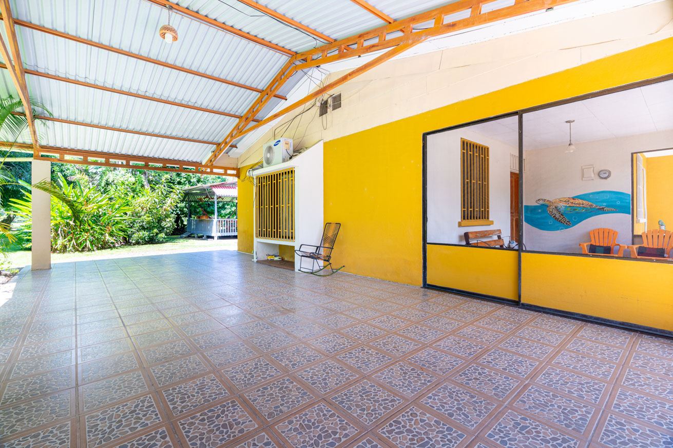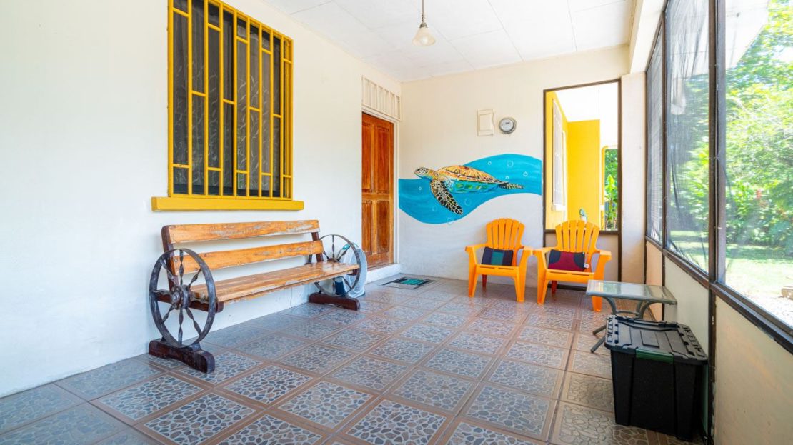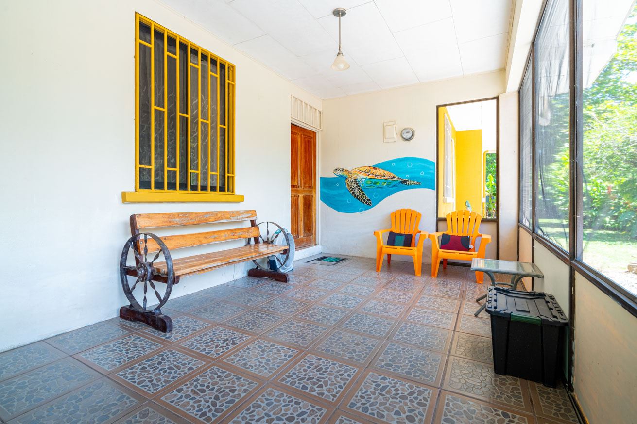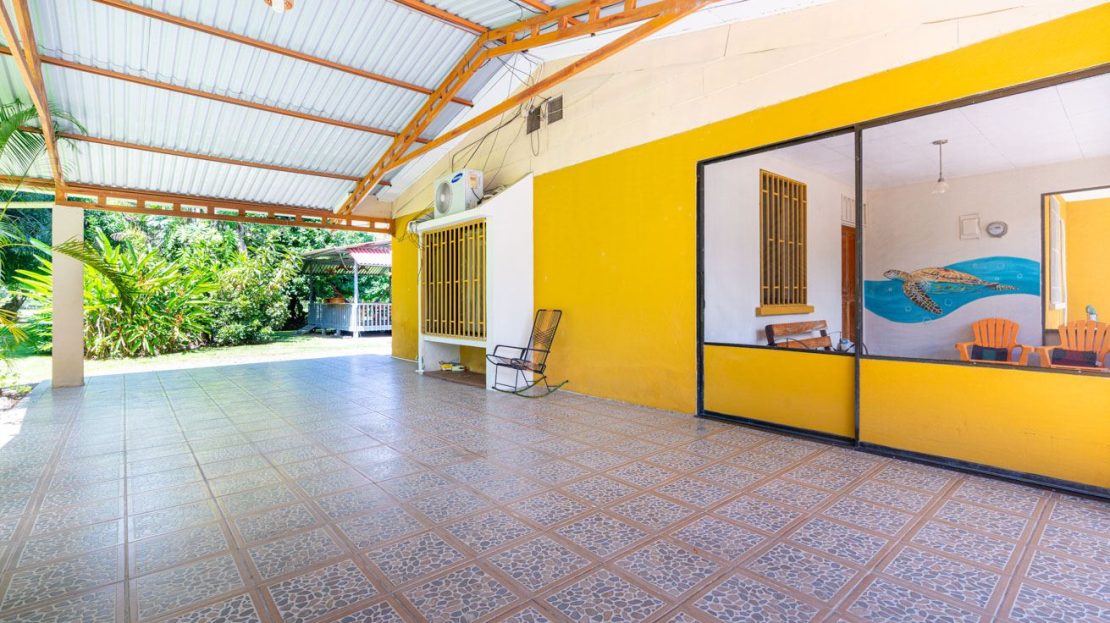 The bright, sunny-yellow main house welcomes with a large covered front patio. The bright walls, yellow accents and beautiful nature artwork add a strong touch of happiness & airiness. A large living room with plentiful sofa seating and a dining table for six shares the main open space with the big & fully equipped kitchen. The kitchen boasts miles of counter space while plentiful storage with innovative see-thru cabinets lets you know exactly what is where! Three bedrooms, with lumber beds and flooring, are complimented by two bathrooms. Air conditioning, beautiful artwork and stunning wall murals permeate this welcoming and bright home. A covered gazebo, accessible a short distance from the home via a covered outside walkway, holds a hammock, bar and plenty of seating – it will surely host many brunches, dinners, lively drink sessions, sunset cocktails and lazy afternoon naps.