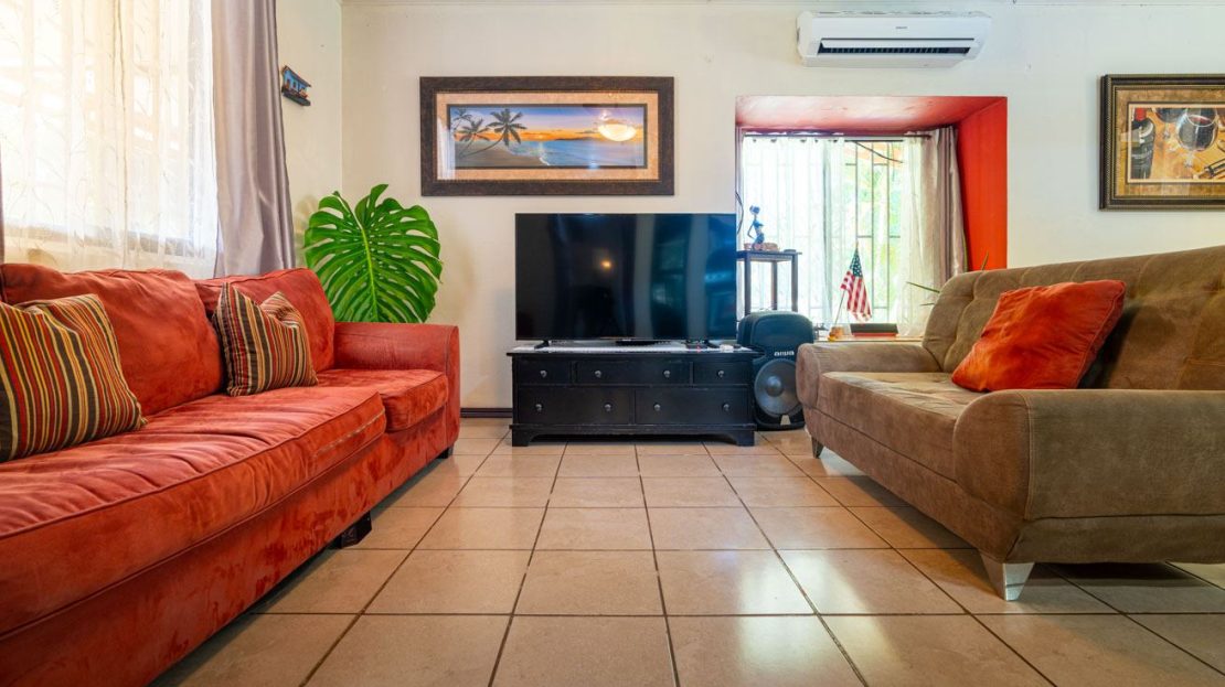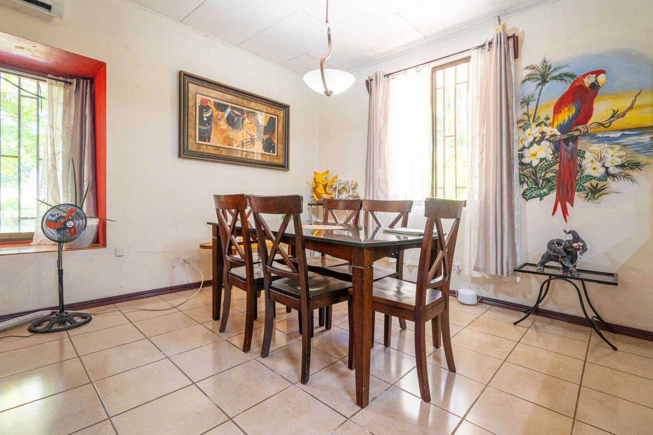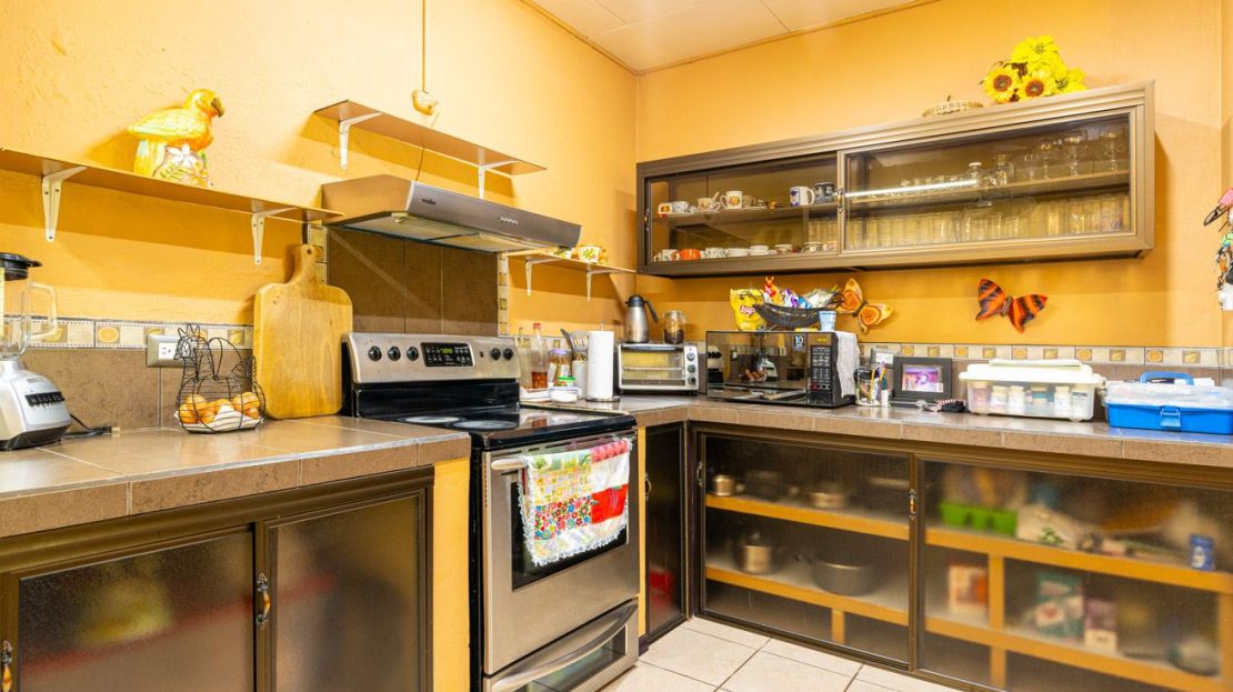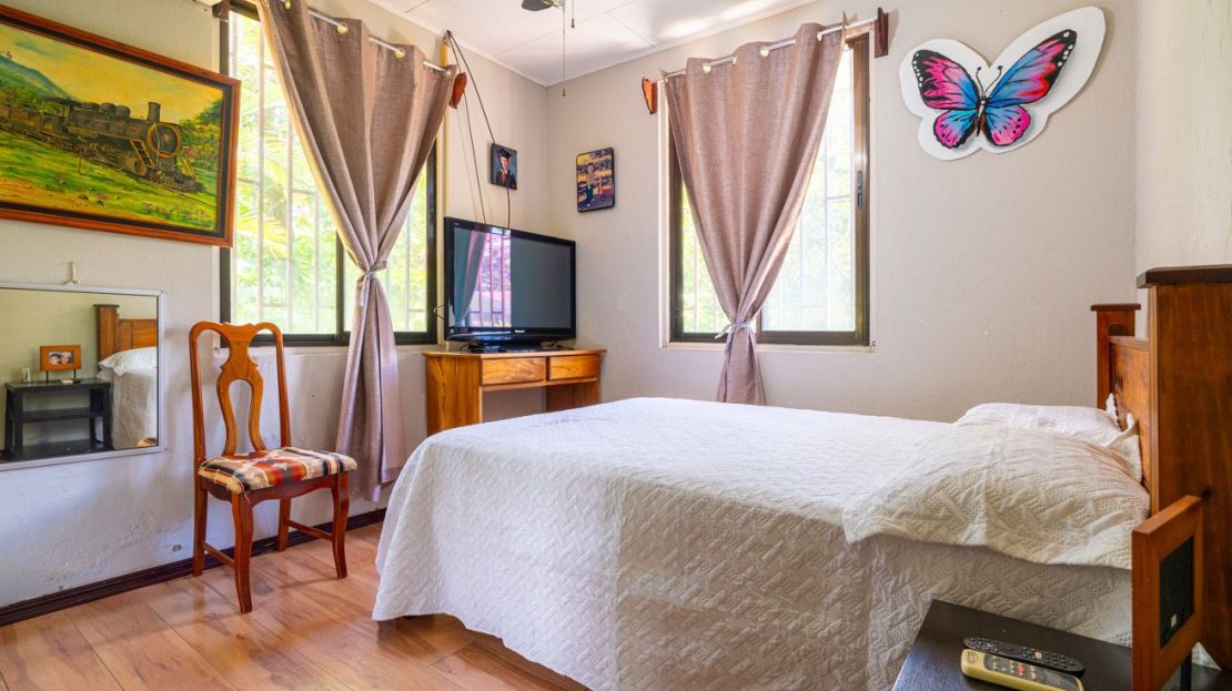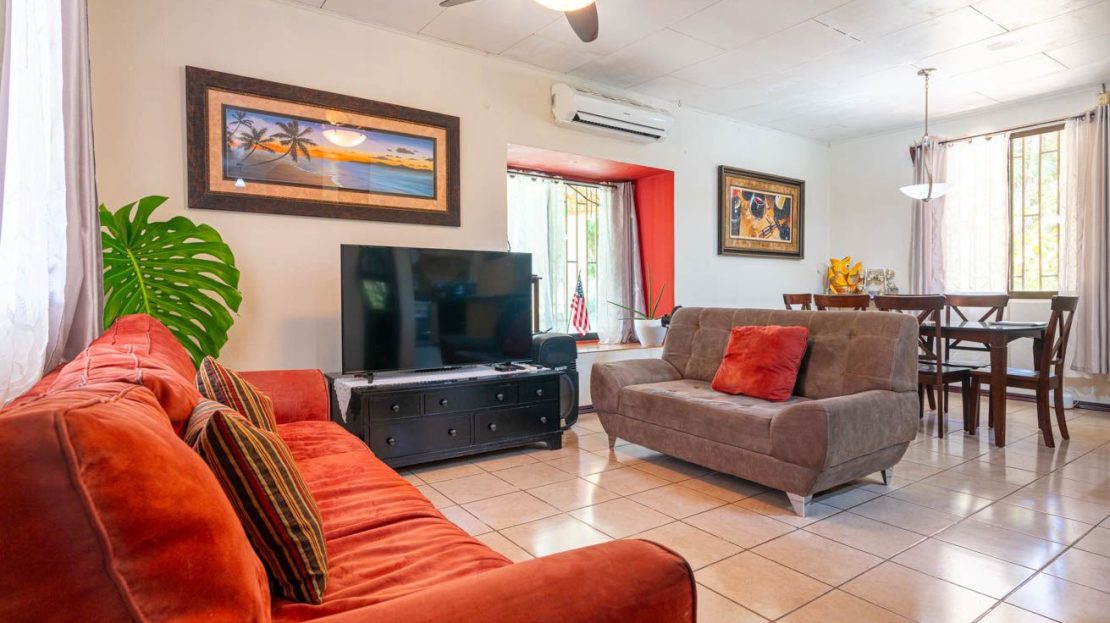 The bright, sunny-yellow main house welcomes with a large covered front patio. The bright walls, yellow accents and beautiful nature artwork add a strong touch of happiness & airiness. A large living room with plentiful sofa seating and a dining table for six shares the main open space with the big & fully equipped kitchen. The kitchen boasts miles of counter space while plentiful storage with innovative see-thru cabinets lets you know exactly what is where! Three bedrooms, with lumber beds and flooring, are complimented by two bathrooms. Air conditioning, beautiful artwork and stunning wall murals permeate this welcoming and bright home. A covered gazebo, accessible a short distance from the home via a covered outside walkway, holds a hammock, bar and plenty of seating – it will surely host many brunches, dinners, lively drink sessions, sunset cocktails and lazy afternoon naps.