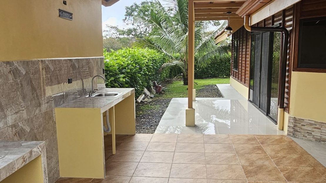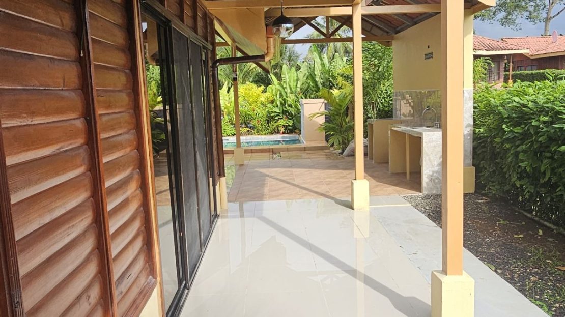 La casa cuenta con tres dormitorios —o dos dormitorios más un loft versátil— y dos baños completos. El exterior está diseñado para el estilo de vida tropical, con piscina privada, área social al aire libre con cocina y espacio para sentarse, perfecto para reuniones o entretenimiento.