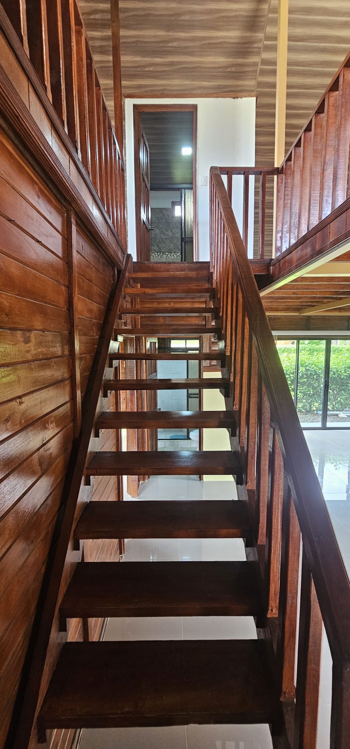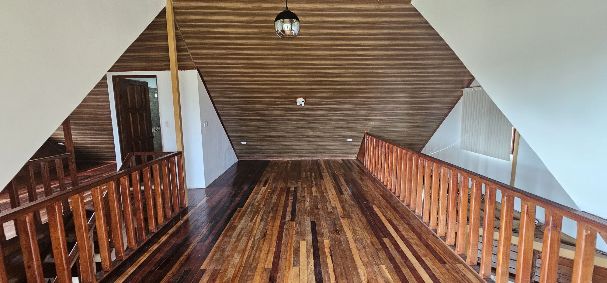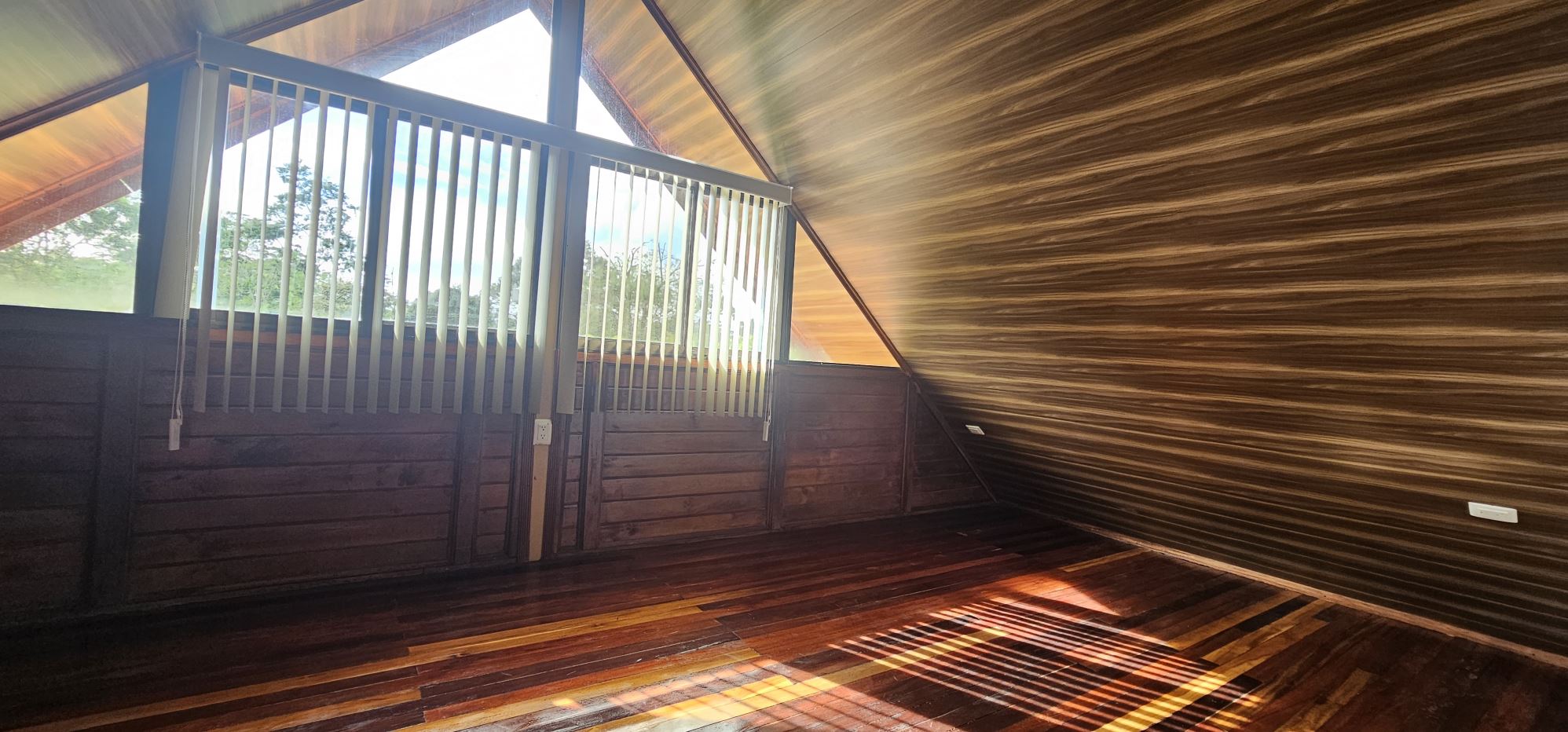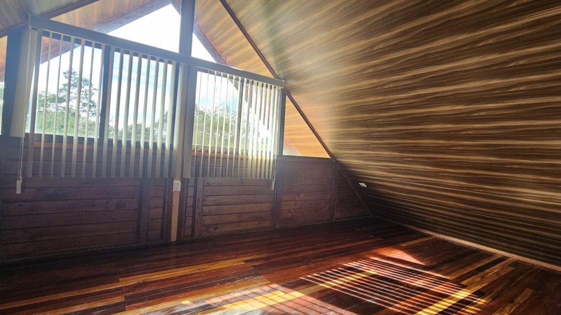The design embraces airflow and climate comfort. Elevated construction, generous windows, and open spaces allow constant cross-breezes, keeping the interior cool and fresh year-round. Upstairs, a spacious balcony opens to peaceful views of the surrounding greenery, providing an ideal setting for relaxing, reading, or enjoying evening sunsets in the mountain air.