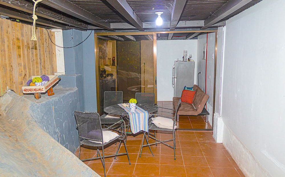 Lower Apartment: Two bedrooms, one bathroom, with large picture windows framing the vibrant greenery