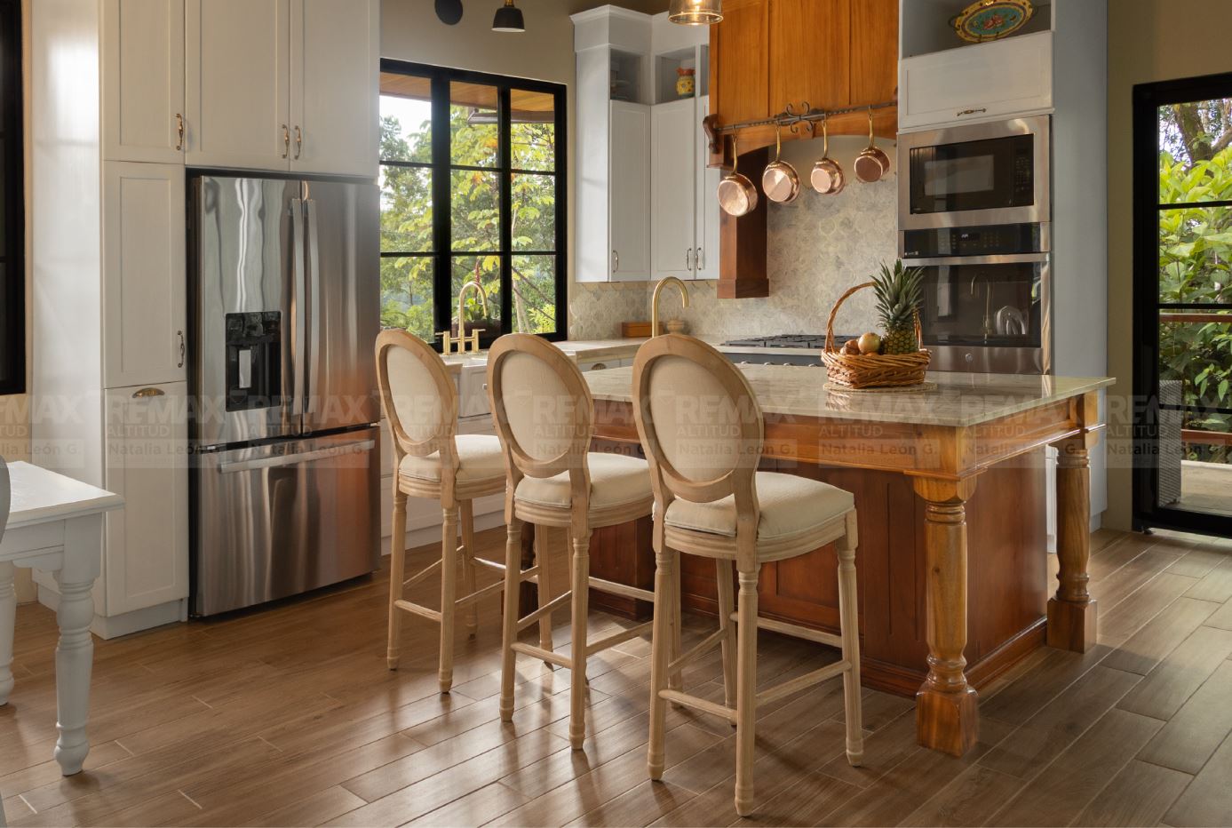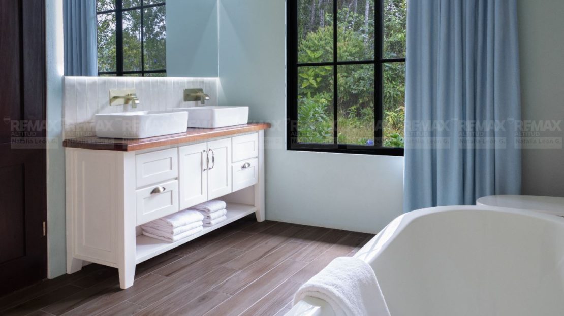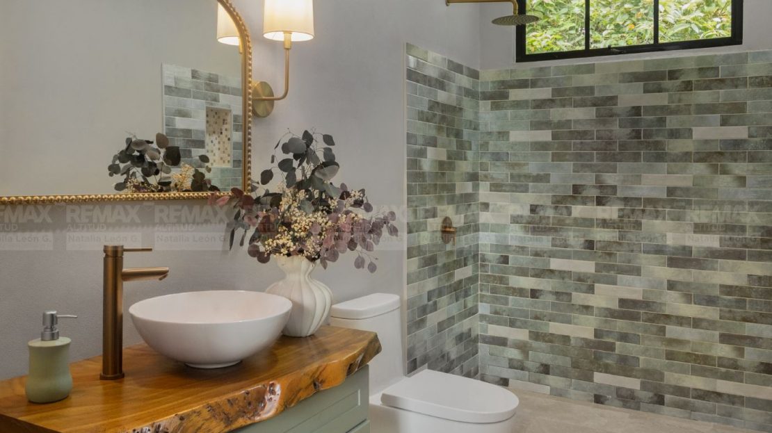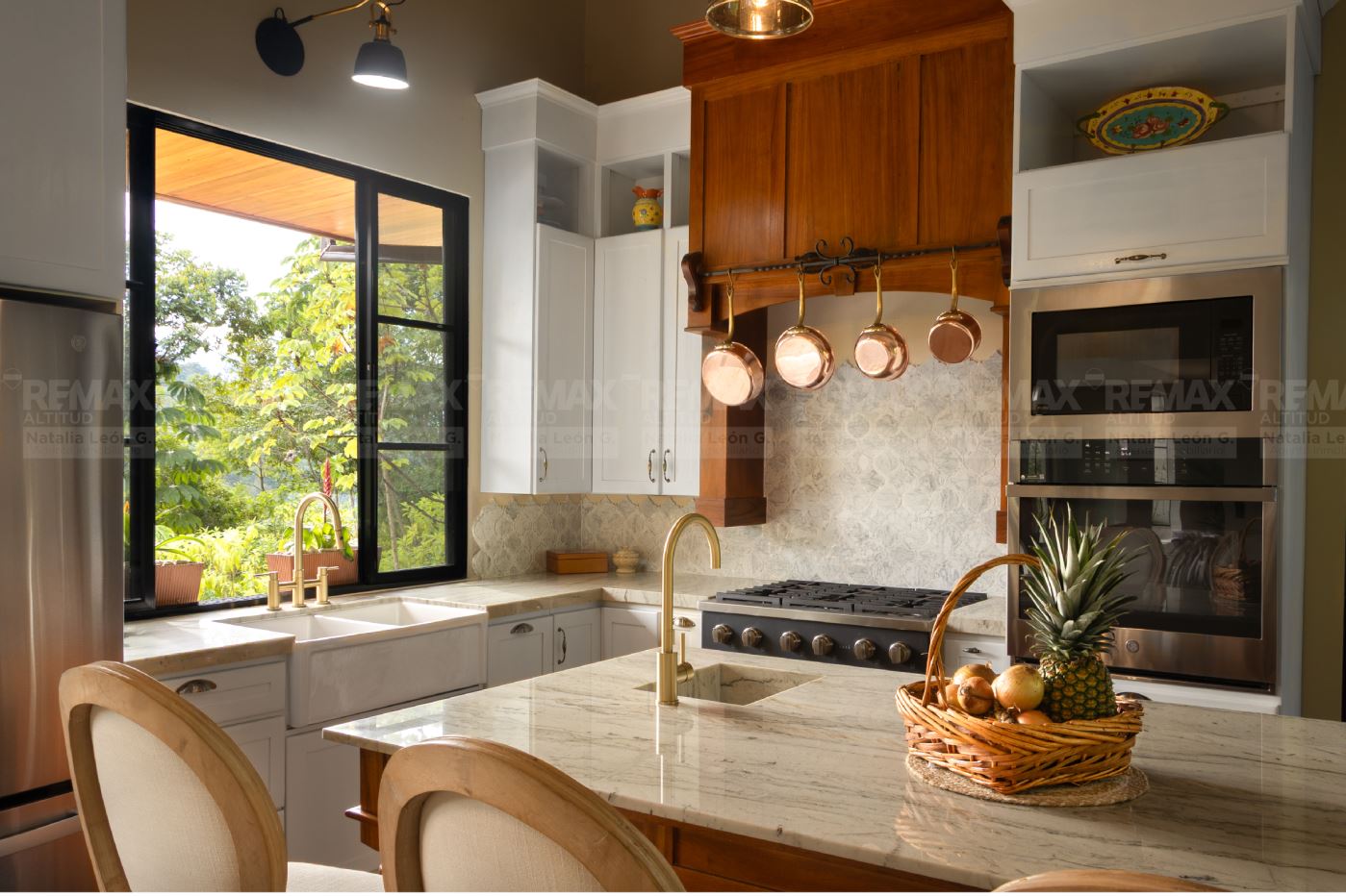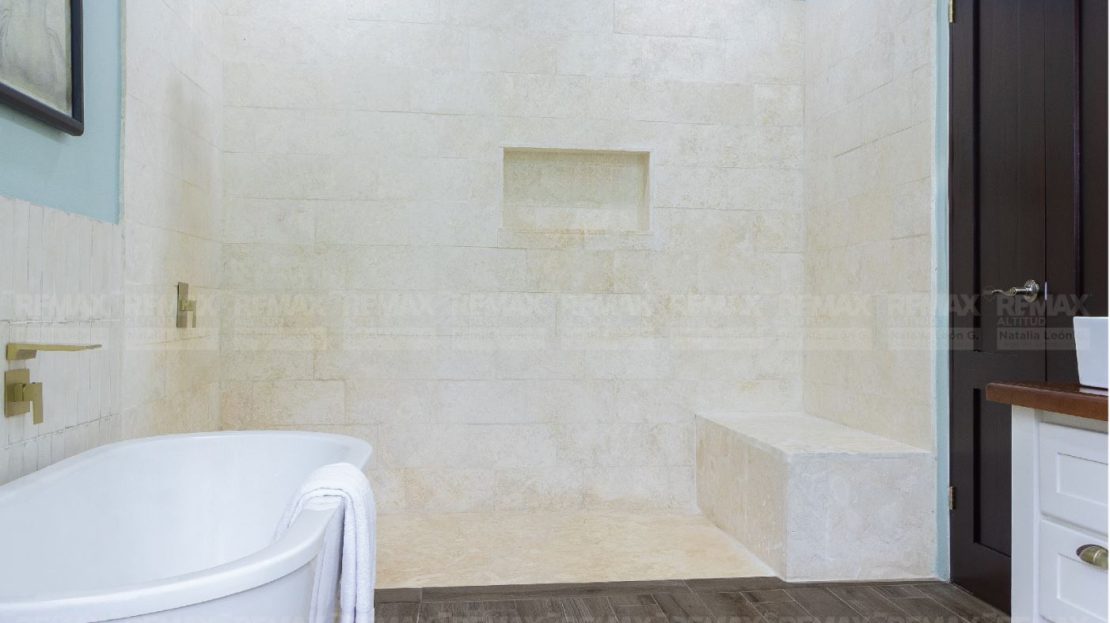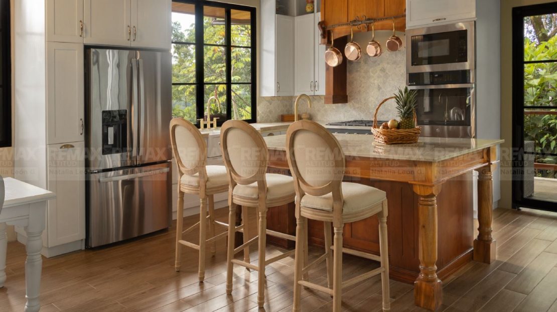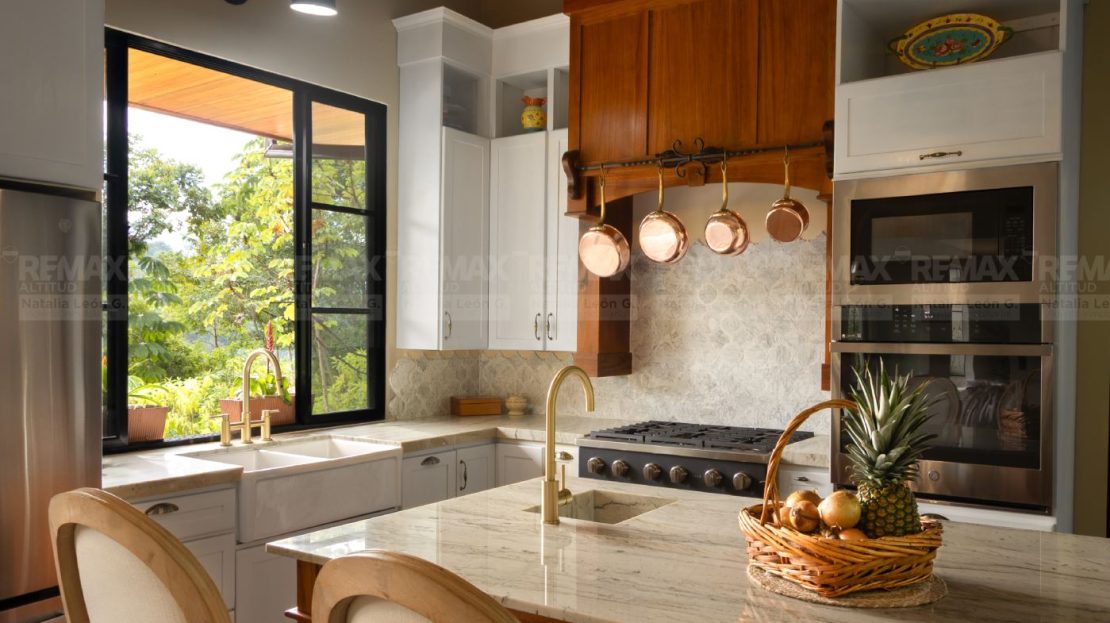 • Acabados de Alta Gama: Pisos exteriores de travertino, encimeras de cocina en cuarcita, detalles en piedra natural, techo de cobre, gabinetes y cielos de maderas exóticas, y electrodomésticos de acero inoxidable.