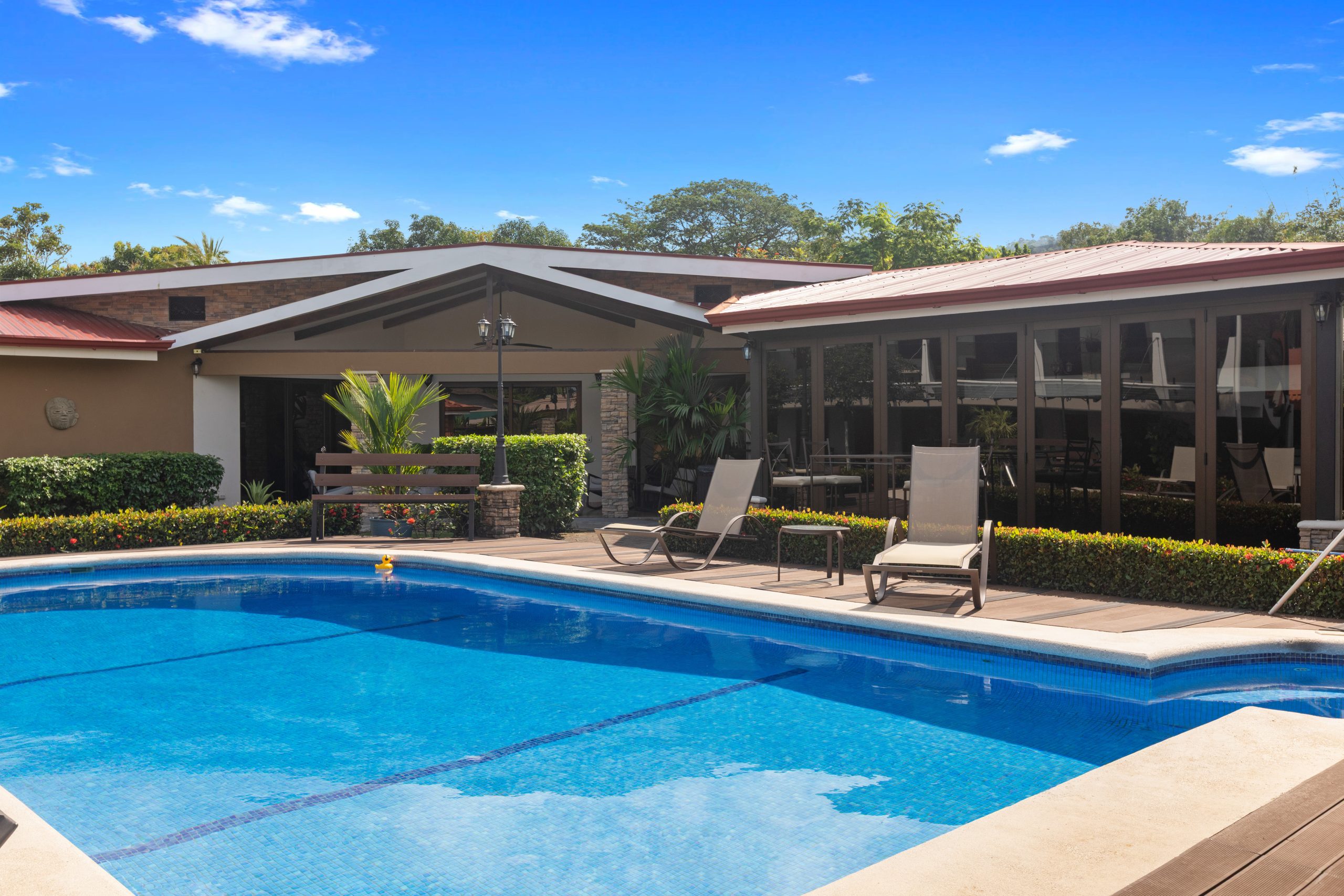 Les espaces extérieurs sont l’un des grands atouts de cette propriété. Profitez d’une grande piscine de 5 x 10 mètres avec sa terrasse privée, parfaite pour recevoir et se détendre. Deux ranchos offrent plusieurs zones de repos, tandis que le bar de piscine et l’espace lounge créent une atmosphère de type resort très appréciée des vacanciers. Des jardins tropicaux luxuriants entourent la propriété, renforçant l’intimité et l’ambiance naturelle. De plus, deux entrées distinctes et un stationnement pour jusqu’à 8 véhicules assurent un confort optimal pour les propriétaires et les invités.
