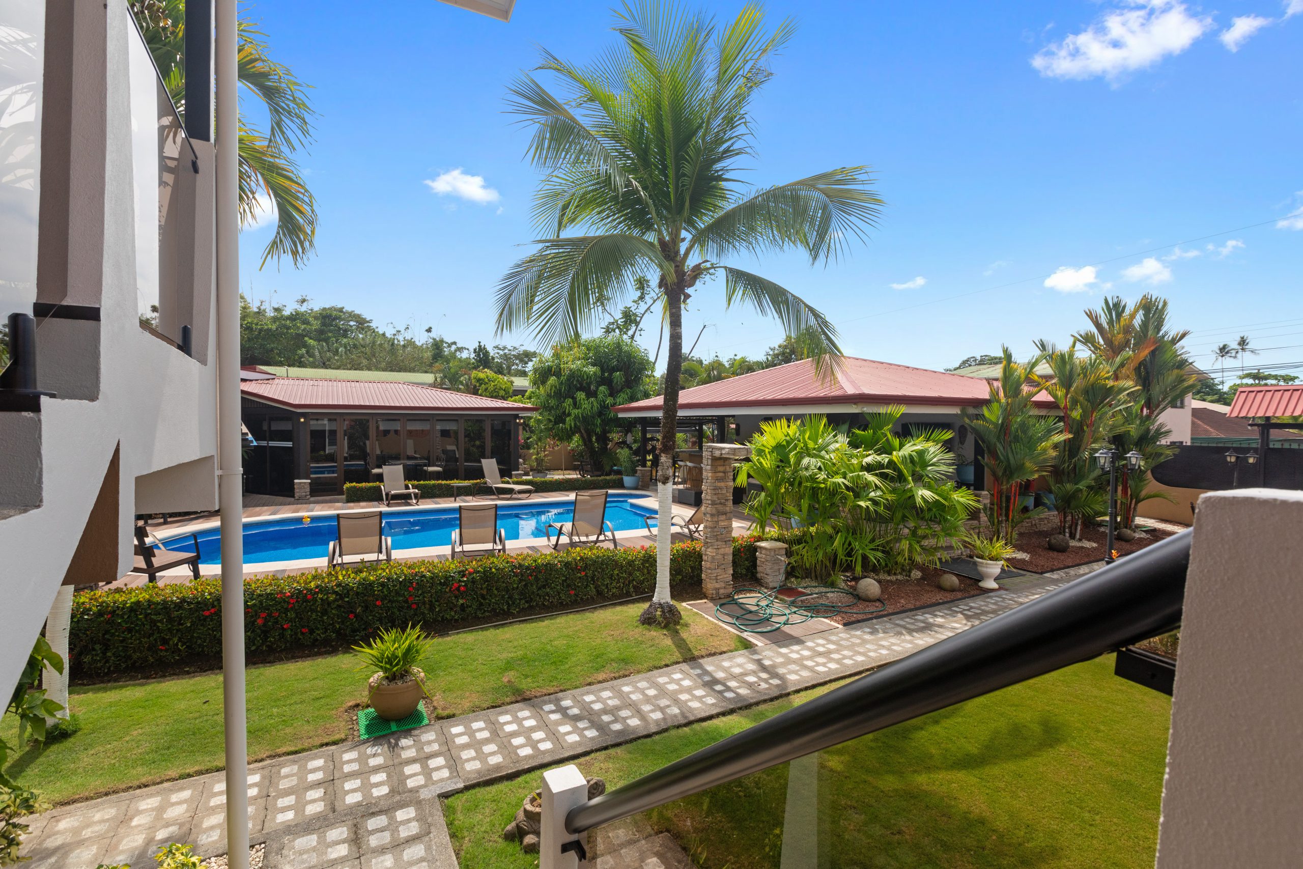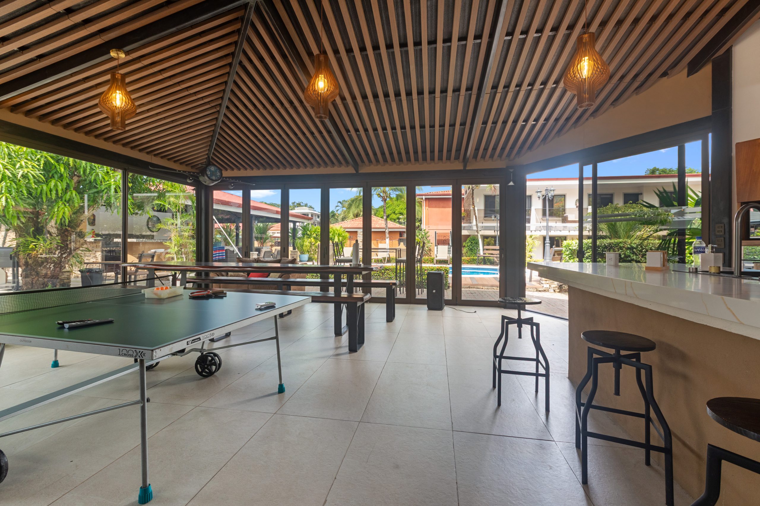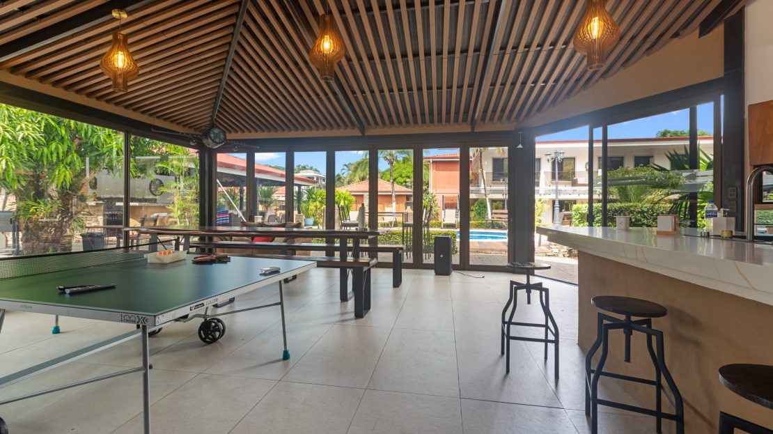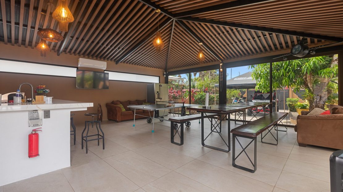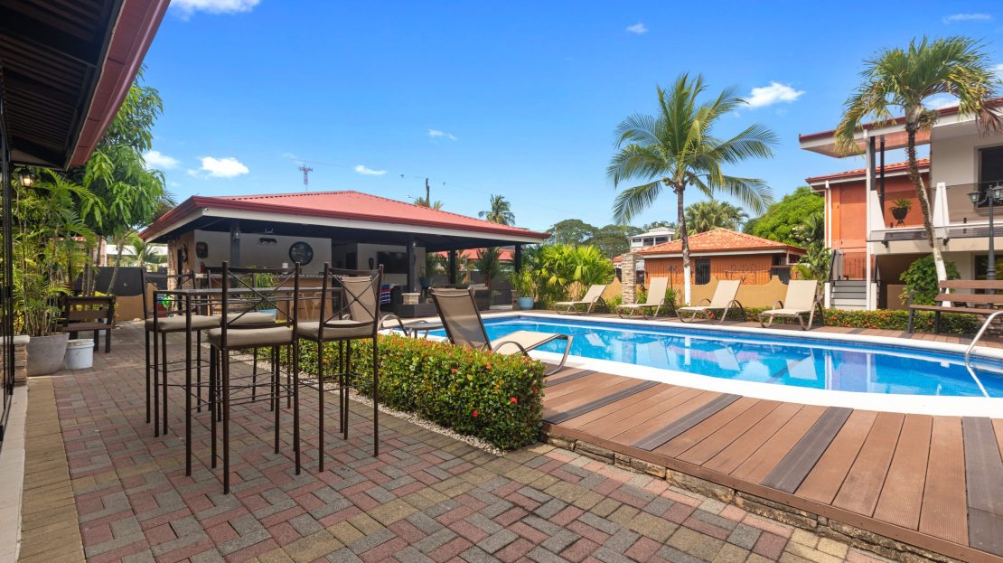 El área exterior es donde esta propiedad realmente destaca. Disfrute de una gran piscina de 5 x 10 metros con su propia terraza, perfecta para recibir invitados y relajarse. Dos ranchos crean múltiples zonas de descanso, mientras que el bar de piscina y área lounge aportan un ambiente tipo resort muy atractivo para huéspedes y arrendatarios. Jardines tropicales rodean la propiedad, brindando mayor privacidad y una atmósfera natural. Además, cuenta con dos accesos independientes y espacio de estacionamiento para hasta 8 vehículos, garantizando comodidad para propietarios y visitantes.