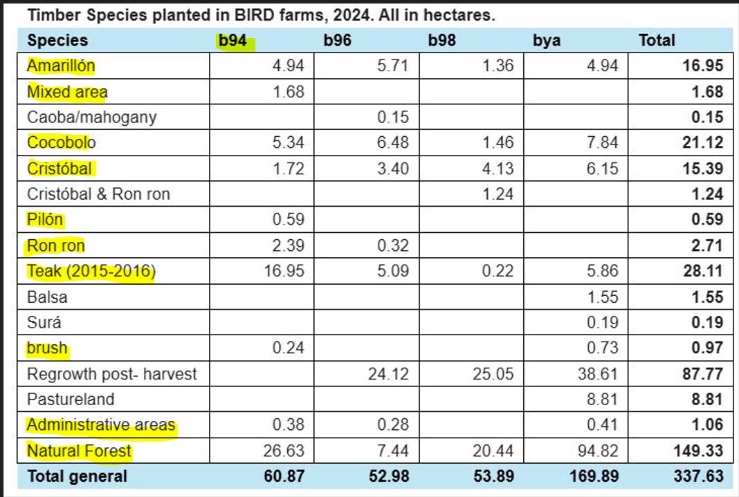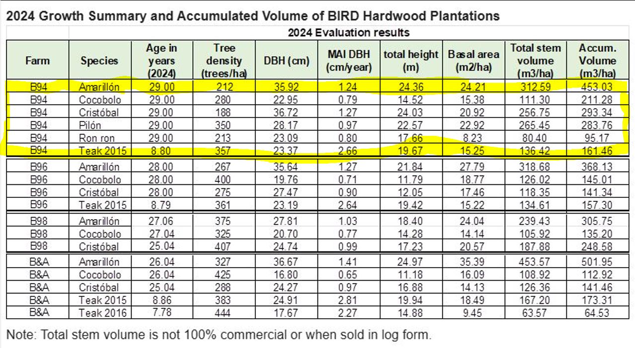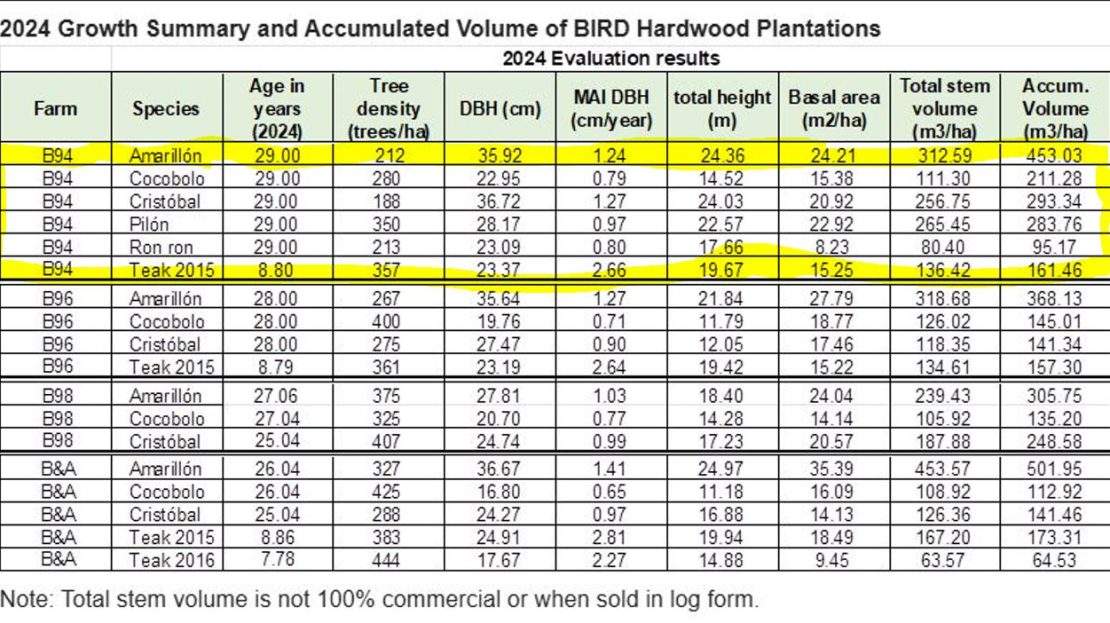 As of 2023, these farms have a standing inventory of planted native species whose age classes range between 23 and 28 years which an investor can generate a return from a timber harvest beginning immediately. Between 2015 and 2023, all of the 90 ha of teak were harvested and 28 ha of teak were replanted with the latest generation of high-performance clonal teak stock. This new teak planted in 2015 is growing above average and being managed very professionally and under FSC® (NC-FM/COC- 00152) certification standards.