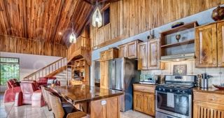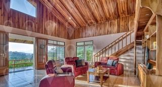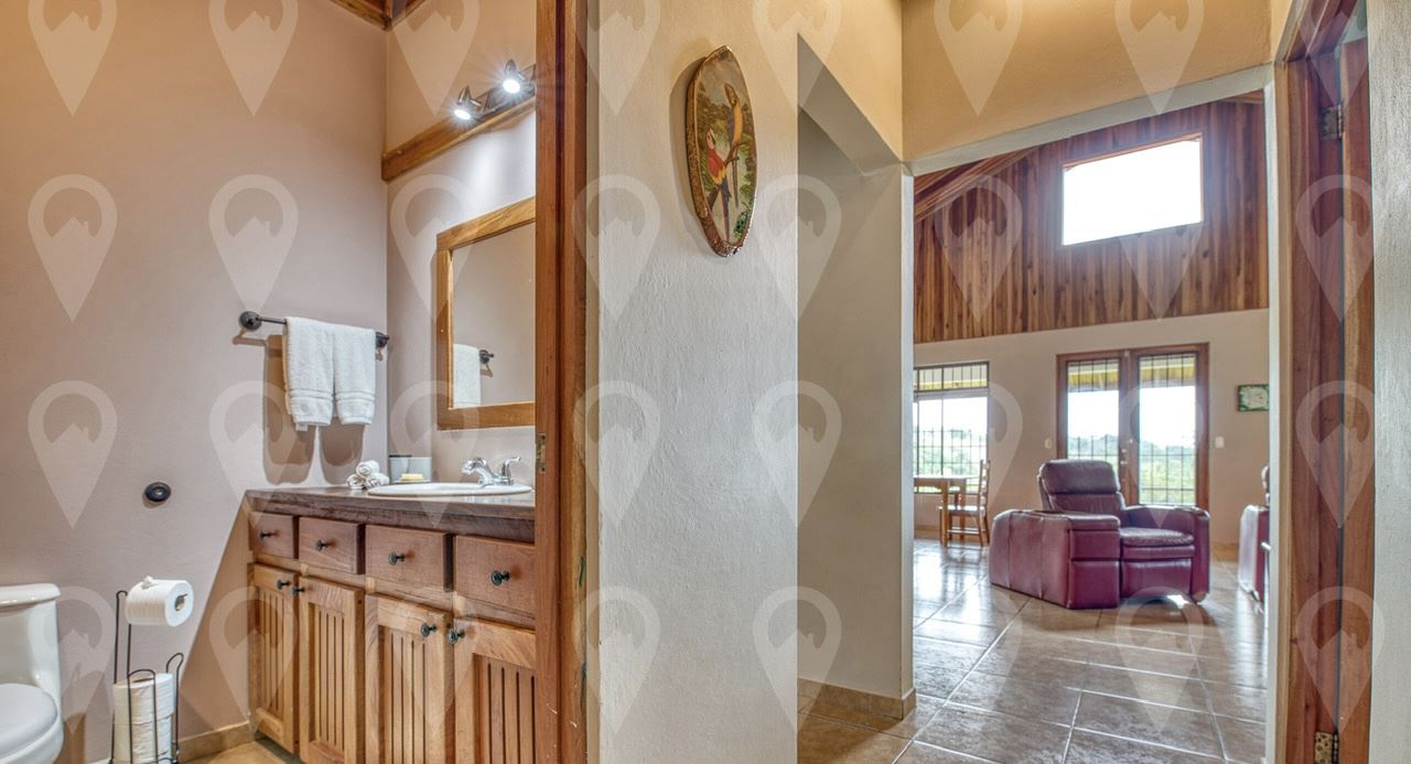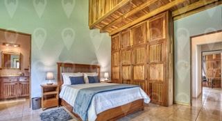 At the heart of the estate is a beautiful, custom designed residence, perched atop the property’s upper grounds. From the covered front terrace that spans the full length of the home, you can enjoy sweeping 250-degree views of Lake Arenal, the majestic Arenal Volcano, Monteverde and the rainforest-covered valley below. This 3,000 square foot luxury rustic home is styled for easy living and effortless entertaining. Soaring cathedral ceilings finished in local hardwood tongue-and-groove create warmth and character, while large windows flood the interior with natural light and frame the lush tropical surroundings.