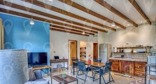 Below the main villa, a third building includes two fully independent apartments: one with three bedrooms and 1½ bathrooms, and another with two bedrooms and one bathroom. Each apartment features beautiful neutral tile floors, beamed ceilings, large picture windows, fully equipped kitchens, and ample storage. While currently unfurnished, they offer a versatile canvas for personalization, complete with air conditioning for comfort when desired. These units are perfectly suited for extended family, long-term guests, or generating steady rental income.