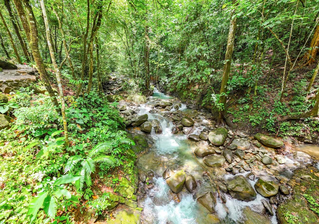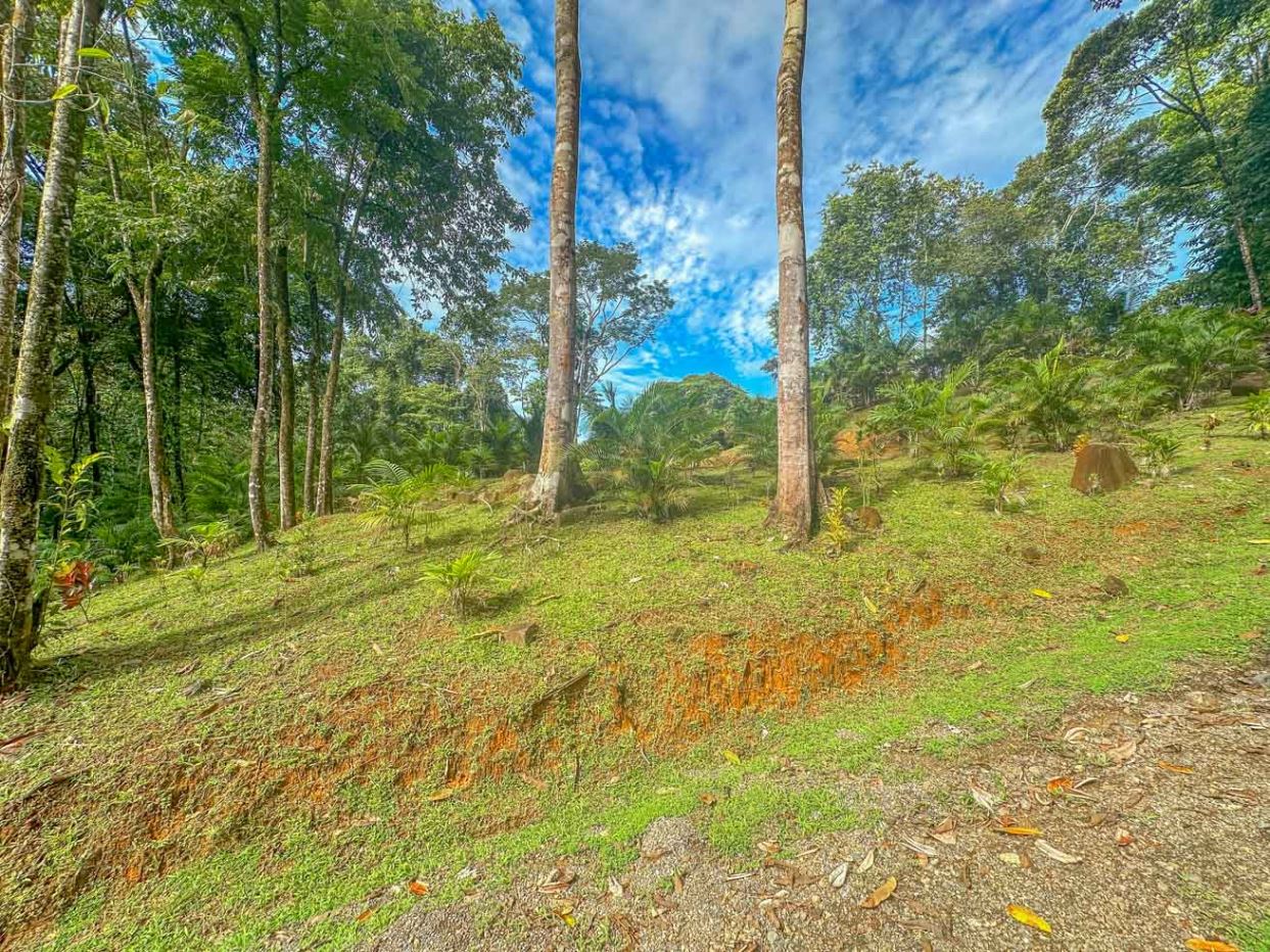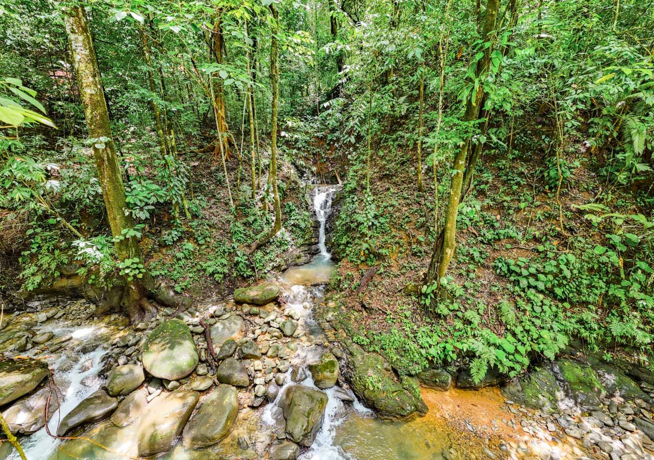 As you step onto this land you will be greeted by lush landscaping of flowering plants and varieties of palms creating a vibrant and inviting atmosphere. Majestic old trees stand tall, providing shade and habitat for local wildlife which includes toucans, macaws, parrots, monkeys, sloths, anteaters, coatis, raccoons, and the majestic blue morpho butterflies. The property borders the magnificent Rio Luna Media with 76 meters / 250 ft. of cascading river frontage and a magnificent 6m / 18ft waterfall that can be seen and heard from many of the future building sites scattered up and down the property. River otters happily frolic in the Rio Luna Media swim holes and cascades, adding to its charm.