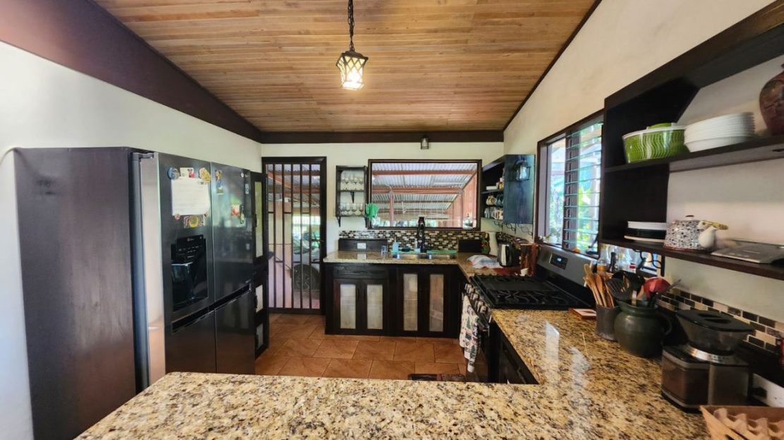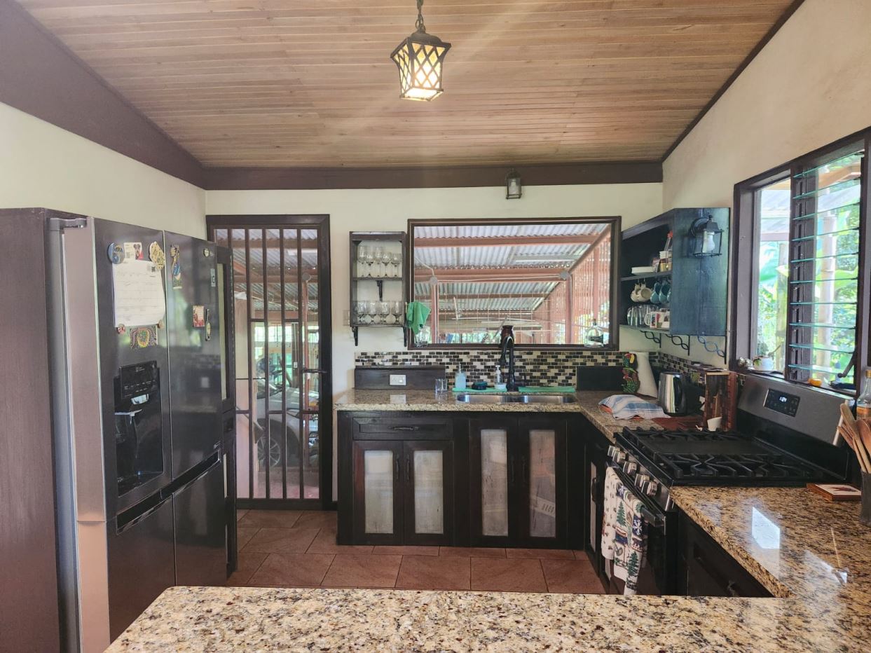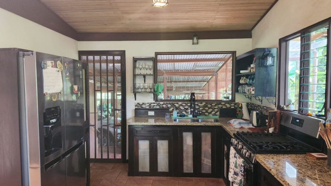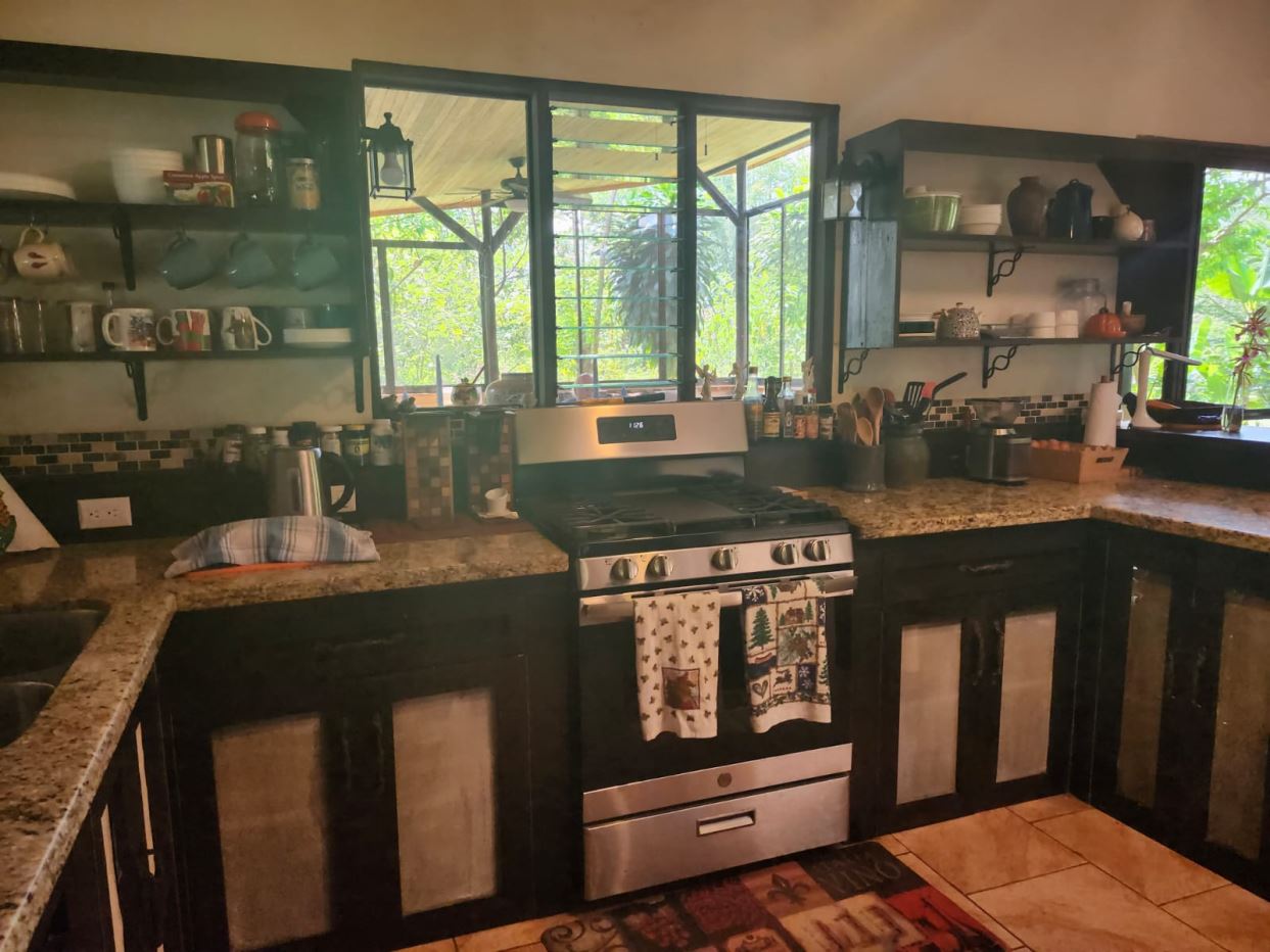 The property has easy two-wheel drive access, a bus stop at the lane’s end, and proximity to Rivas for essentials such as a market, pharmacy, bank machine and butcher’s. Modern comforts include a solar hot water system, DSL internet, landline, and TV service. The upgraded kitchen boasts granite countertops, a 4-burner gas stove, and more. Notable additions include an electric front gate, and a whole-house surge protector. The property includes a greenhouse, storage shed, and a diverse array of fruit trees, plants, and flowers. Enjoy a cup of coffee from beans grown on the property and roasted across the river! Make Casa Jardin your stair-free haven in nature’s embrace. Act now and embrace your retreat in this riverside paradise!