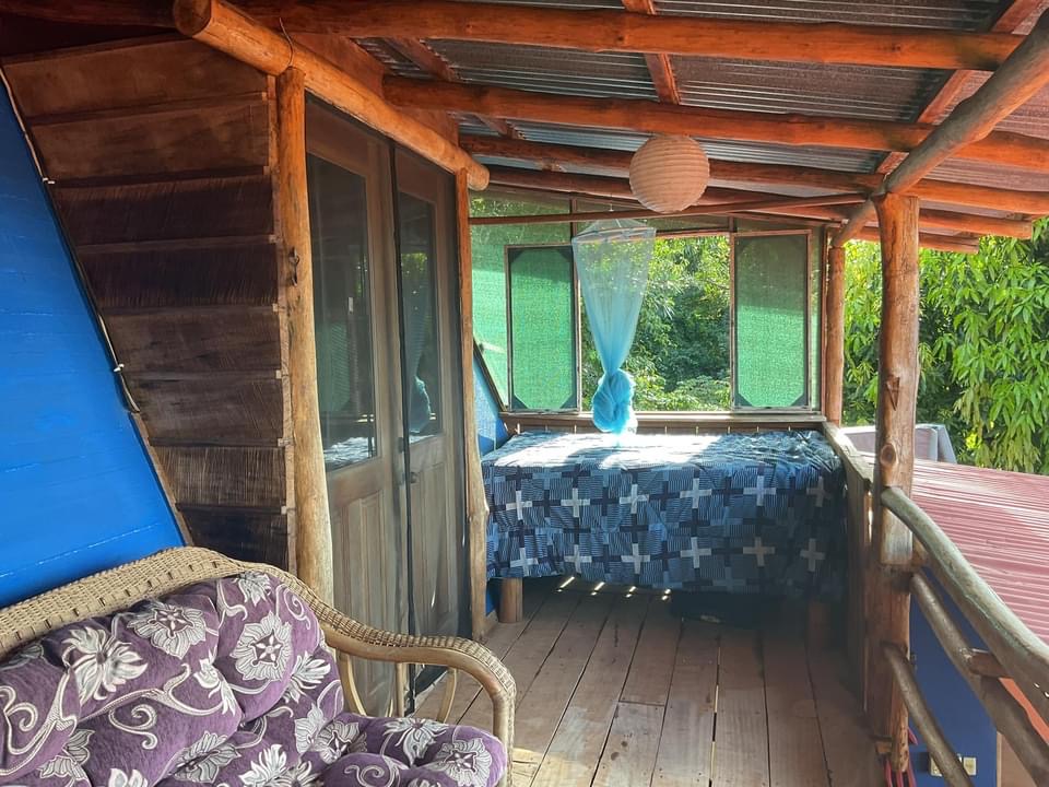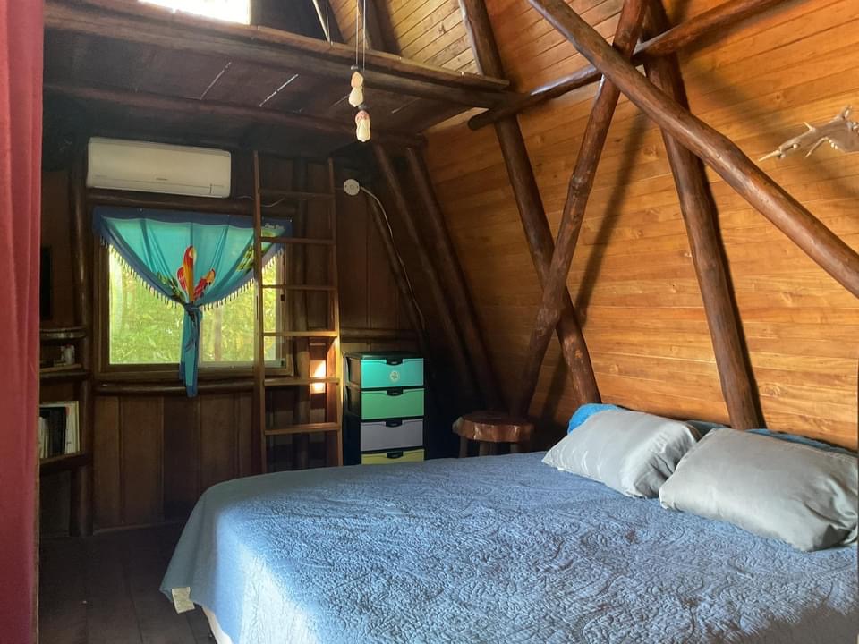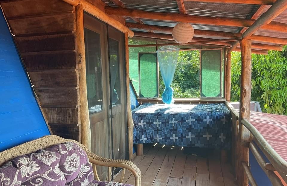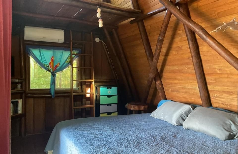 The current Rancho features two and a half bedrooms and one and a half baths, comfortably accommodating six or more guests. The master bedroom boasts a comfortable king bed, while the guest room offers a cozy queen bed. For a unique sleeping experience, a double bed on the open deck provides a treehouse-like feel. The master bedroom is equipped with ceiling fans and air conditioning for your comfort.