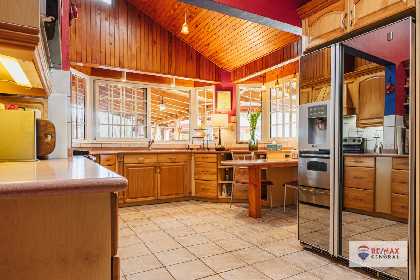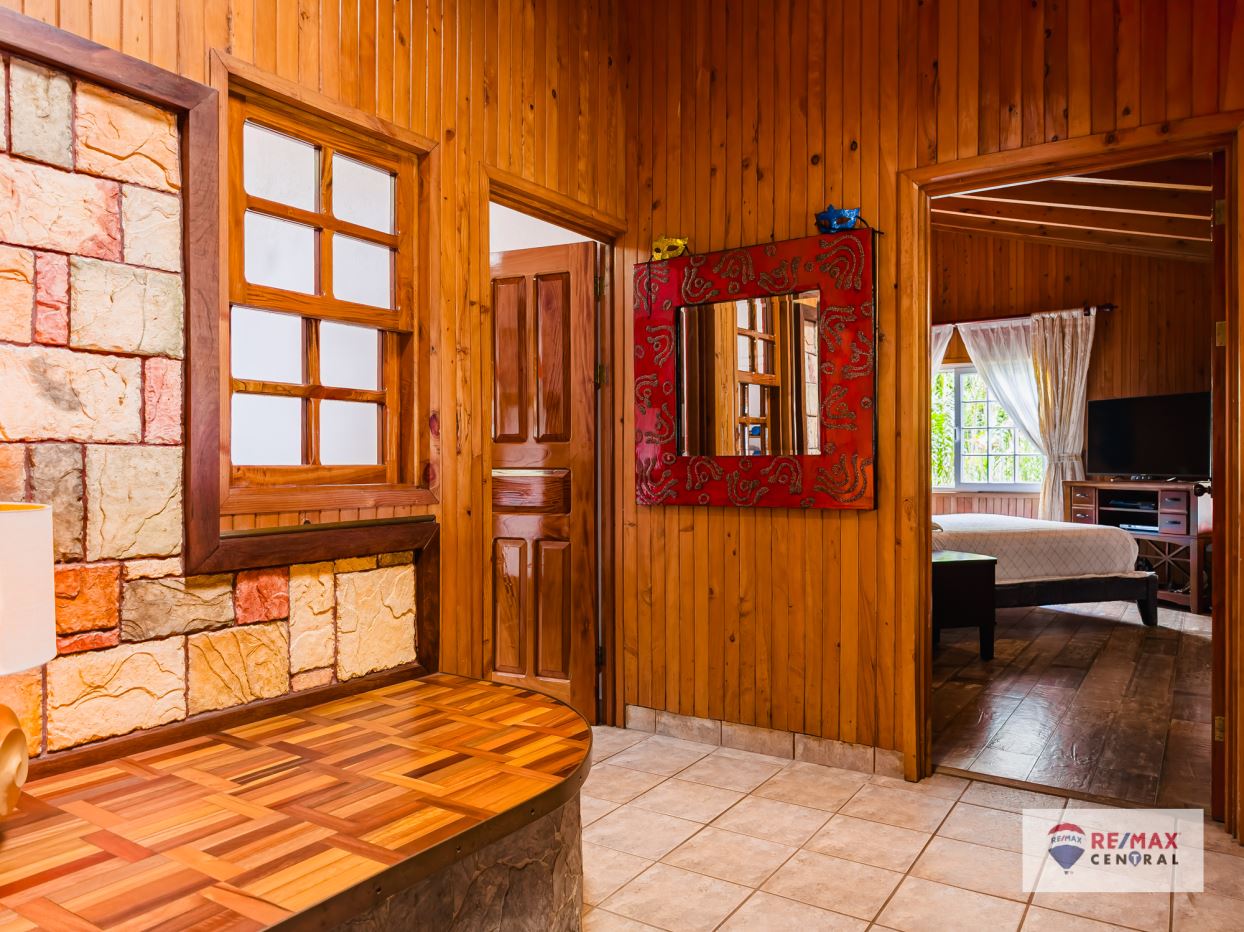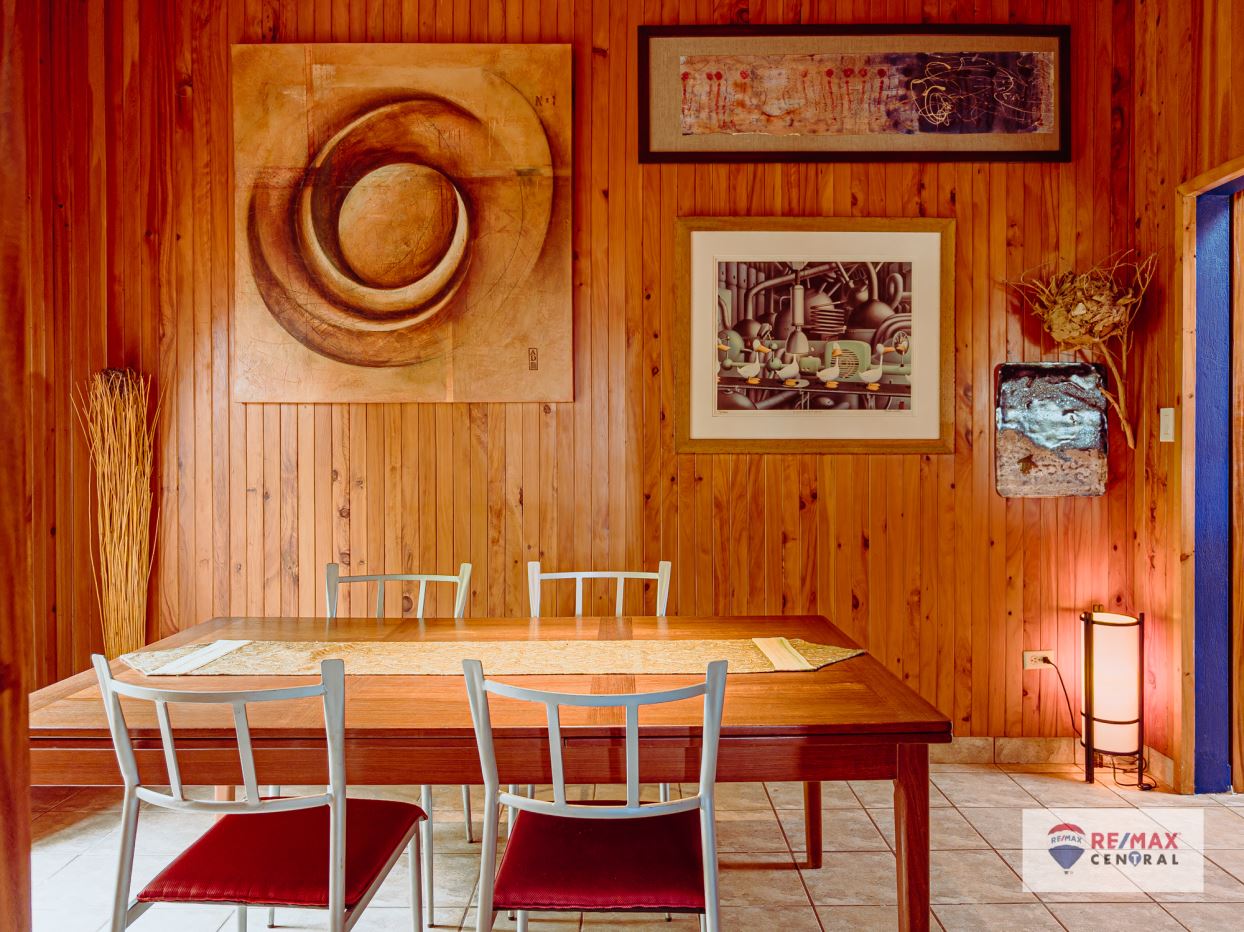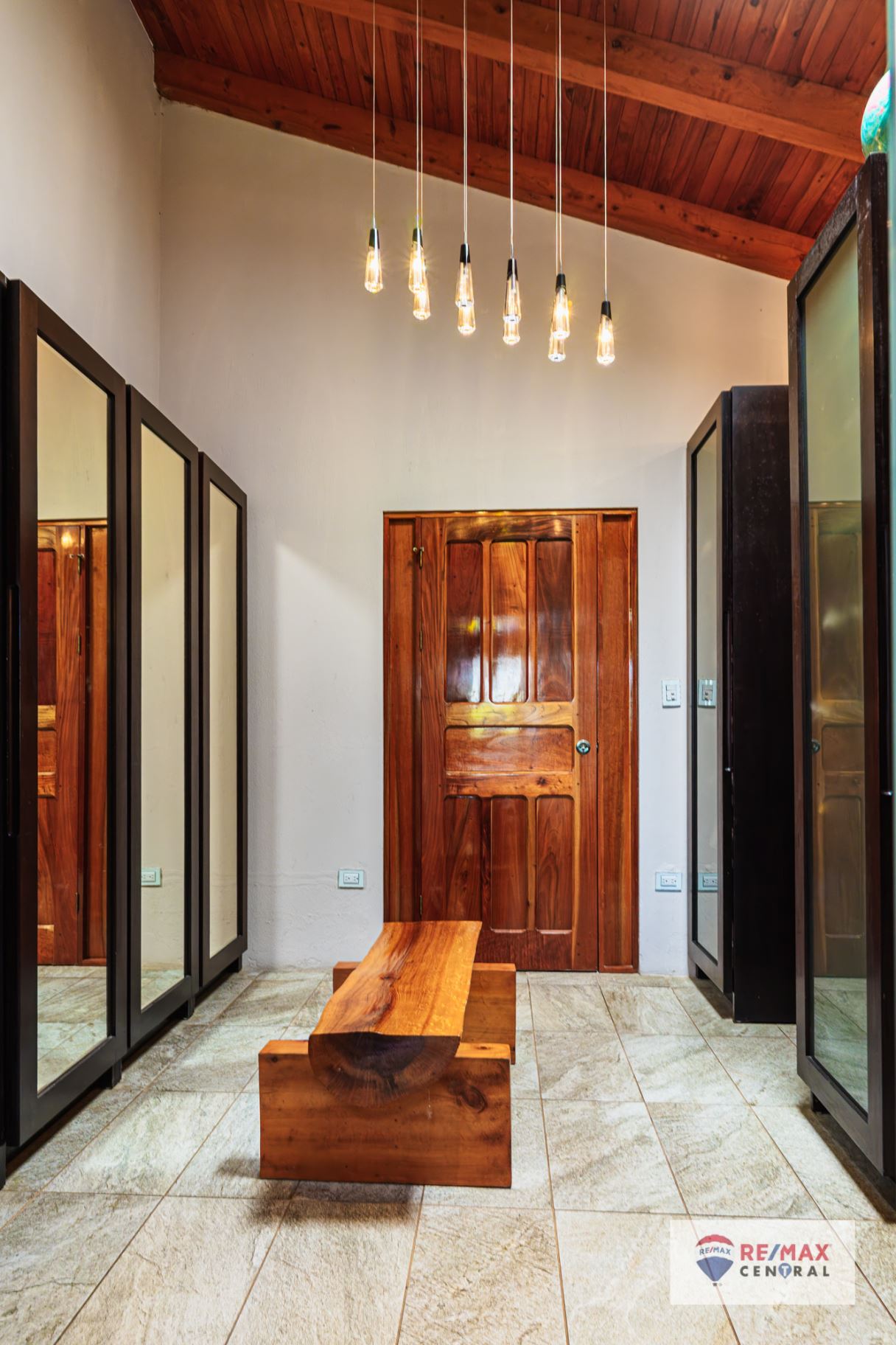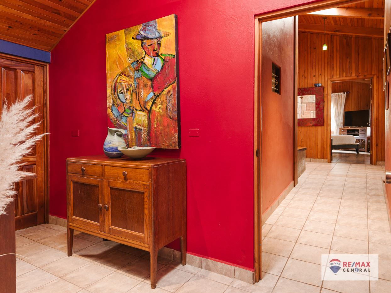 La casa posee un encantador estilo costarricense con interiores bellamente elaborados en madera nativa. La amplia sala de estar tiene techos altos, ventanas con vistas y una acogedora chimenea. El comedor cuenta con un techo abovedado y puertas de vidrio que se abren a una impresionante área de jardín. La moderna cocina campestre está diseñada a medida con numerosos gabinetes de madera nativa, barra de desayuno, techo abovedado y grandes ventanas panorámicas para disfrutar de las vistas de la naturaleza. La primera habitación de invitados es una suite con techos abovedados y ventanas clásicas con vistas a la naturaleza. El baño completo, diseñado a medida, es moderno con lavabos dobles. La segunda habitación puede servir como oficina o área recreativa. La excepcional habitación principal está bien diseñada con techos altos abovedados, ventanas grandes con vistas a la naturaleza, chimenea y suelo de cerámica con diseño de madera. El baño principal contemporáneo es espectacular con diseño a medida, lavabos dobles, ducha privada única y gabinetes de diseño. El vestidor es sobresaliente con secciones modernas para ropa en ambos lados y iluminación de diseñador. Hay un área separada para lavandería y almacenamiento. El patio cubierto al frente abarca el estilo de vida natural, ideal para el desayuno o una bebida al atardecer, mientras se disfrutan las excelentes vistas y atardeceres.