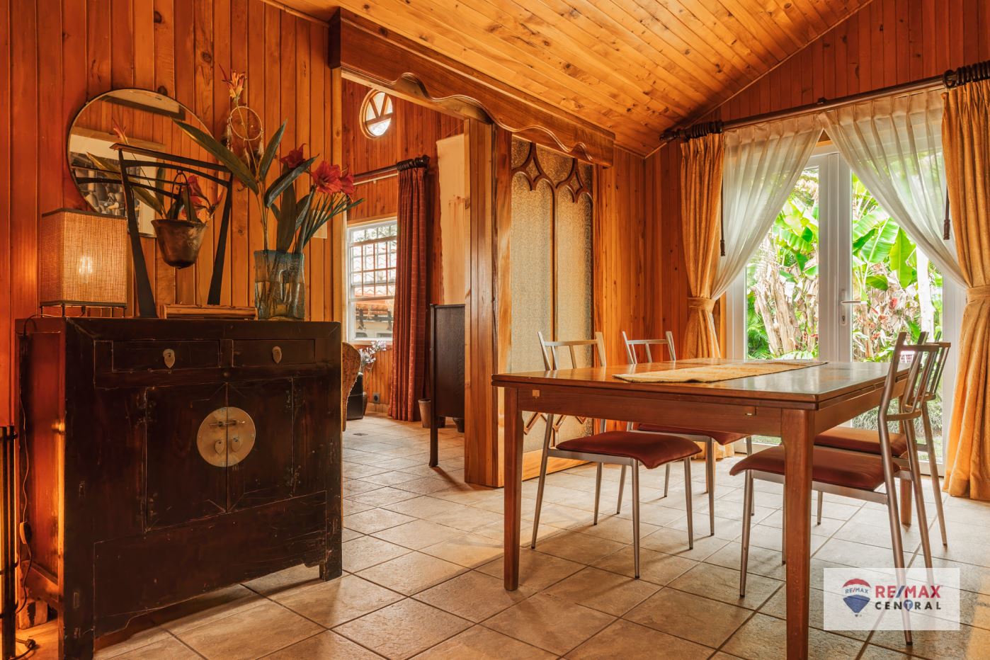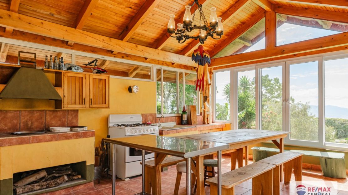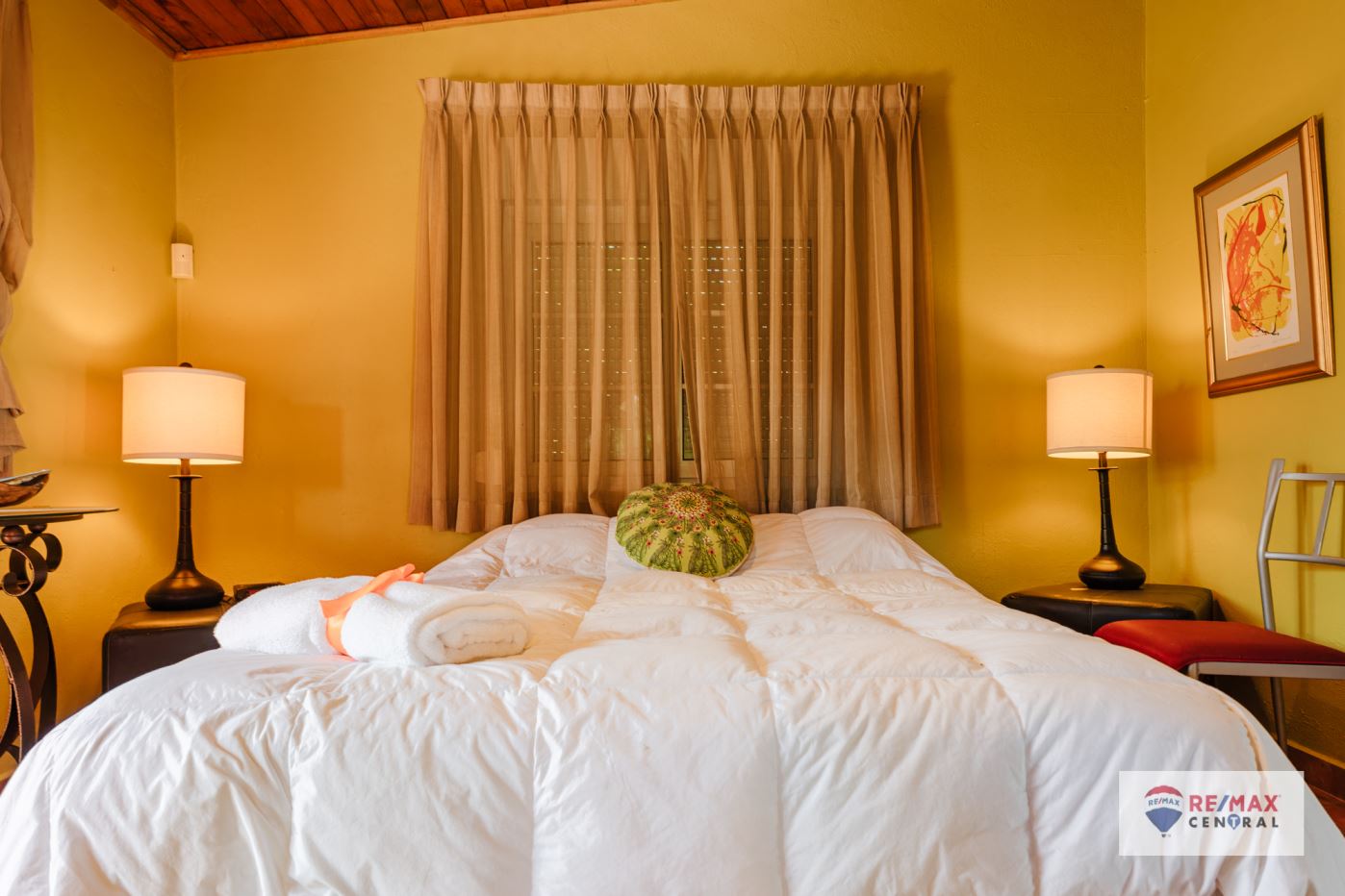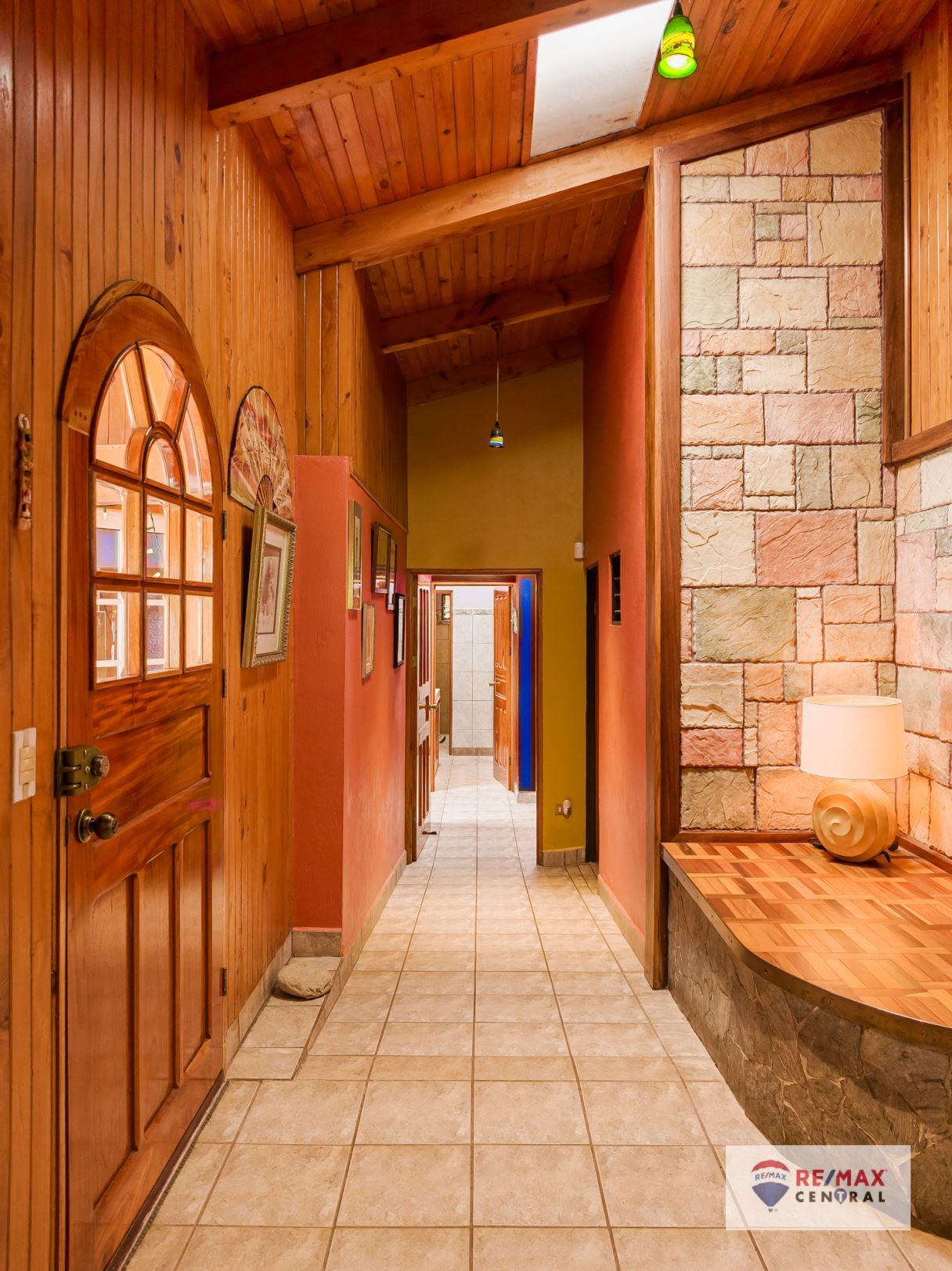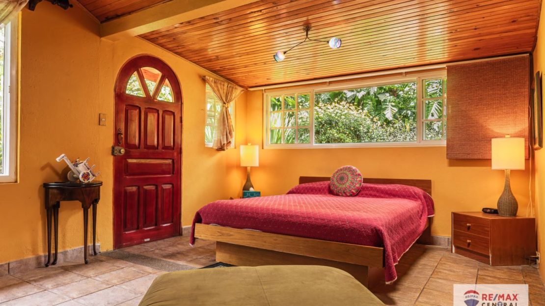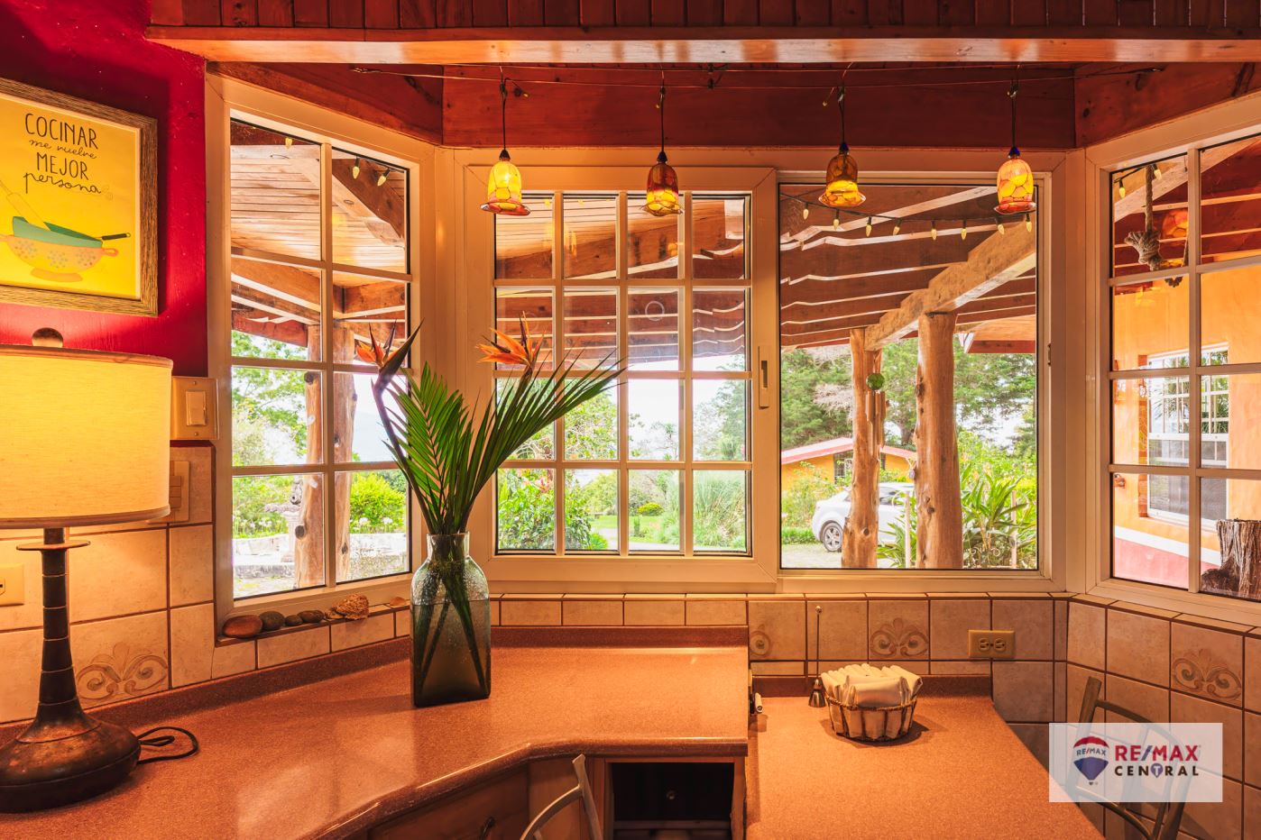 La casa posee un encantador estilo costarricense con interiores bellamente elaborados en madera nativa. La amplia sala de estar tiene techos altos, ventanas con vistas y una acogedora chimenea. El comedor cuenta con un techo abovedado y puertas de vidrio que se abren a una impresionante área de jardín. La moderna cocina campestre está diseñada a medida con numerosos gabinetes de madera nativa, barra de desayuno, techo abovedado y grandes ventanas panorámicas para disfrutar de las vistas de la naturaleza. La primera habitación de invitados es una suite con techos abovedados y ventanas clásicas con vistas a la naturaleza. El baño completo, diseñado a medida, es moderno con lavabos dobles. La segunda habitación puede servir como oficina o área recreativa. La excepcional habitación principal está bien diseñada con techos altos abovedados, ventanas grandes con vistas a la naturaleza, chimenea y suelo de cerámica con diseño de madera. El baño principal contemporáneo es espectacular con diseño a medida, lavabos dobles, ducha privada única y gabinetes de diseño. El vestidor es sobresaliente con secciones modernas para ropa en ambos lados y iluminación de diseñador. Hay un área separada para lavandería y almacenamiento. El patio cubierto al frente abarca el estilo de vida natural, ideal para el desayuno o una bebida al atardecer, mientras se disfrutan las excelentes vistas y atardeceres.