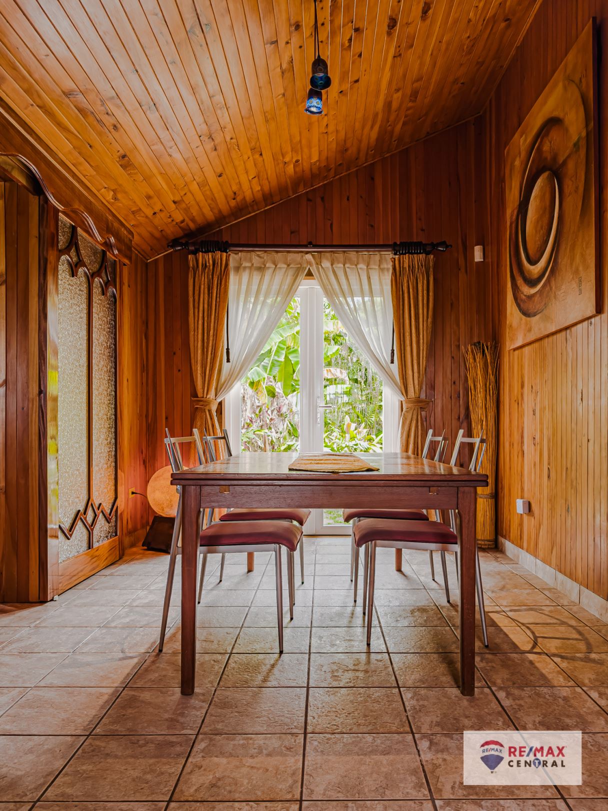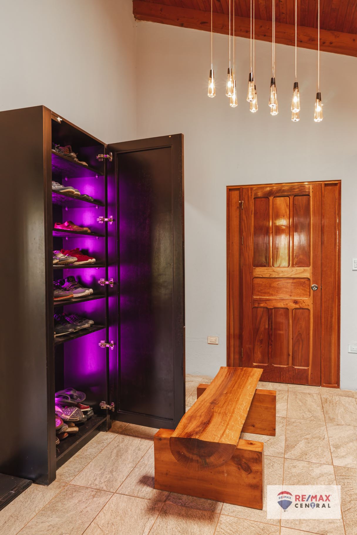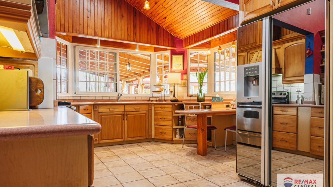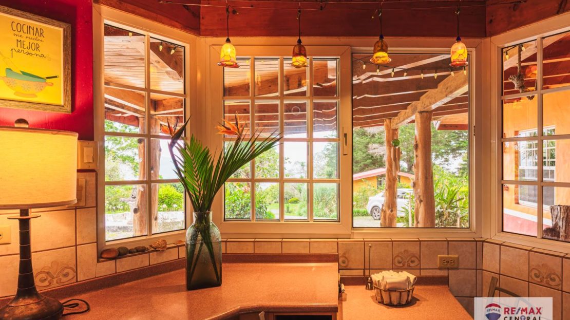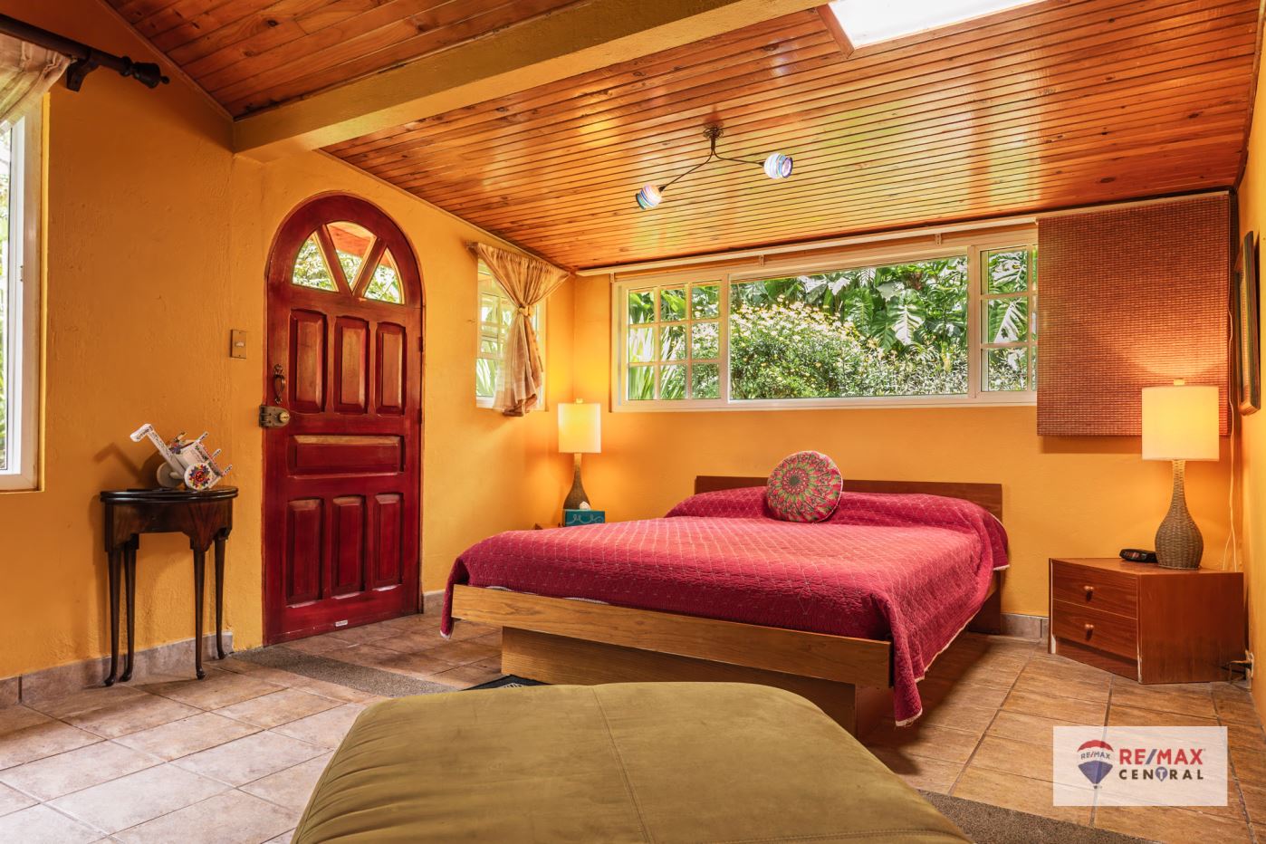 La casa posee un encantador estilo costarricense con interiores bellamente elaborados en madera nativa. La amplia sala de estar tiene techos altos, ventanas con vistas y una acogedora chimenea. El comedor cuenta con un techo abovedado y puertas de vidrio que se abren a una impresionante área de jardín. La moderna cocina campestre está diseñada a medida con numerosos gabinetes de madera nativa, barra de desayuno, techo abovedado y grandes ventanas panorámicas para disfrutar de las vistas de la naturaleza. La primera habitación de invitados es una suite con techos abovedados y ventanas clásicas con vistas a la naturaleza. El baño completo, diseñado a medida, es moderno con lavabos dobles. La segunda habitación puede servir como oficina o área recreativa. La excepcional habitación principal está bien diseñada con techos altos abovedados, ventanas grandes con vistas a la naturaleza, chimenea y suelo de cerámica con diseño de madera. El baño principal contemporáneo es espectacular con diseño a medida, lavabos dobles, ducha privada única y gabinetes de diseño. El vestidor es sobresaliente con secciones modernas para ropa en ambos lados y iluminación de diseñador. Hay un área separada para lavandería y almacenamiento. El patio cubierto al frente abarca el estilo de vida natural, ideal para el desayuno o una bebida al atardecer, mientras se disfrutan las excelentes vistas y atardeceres.