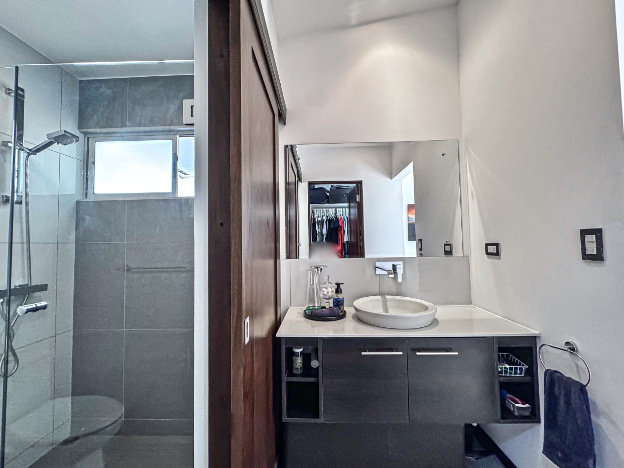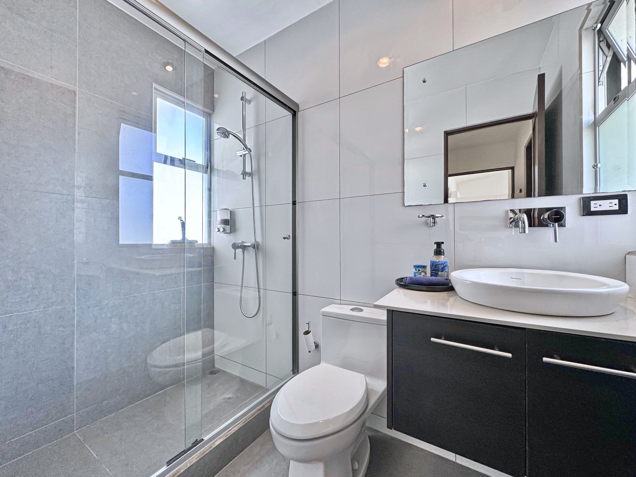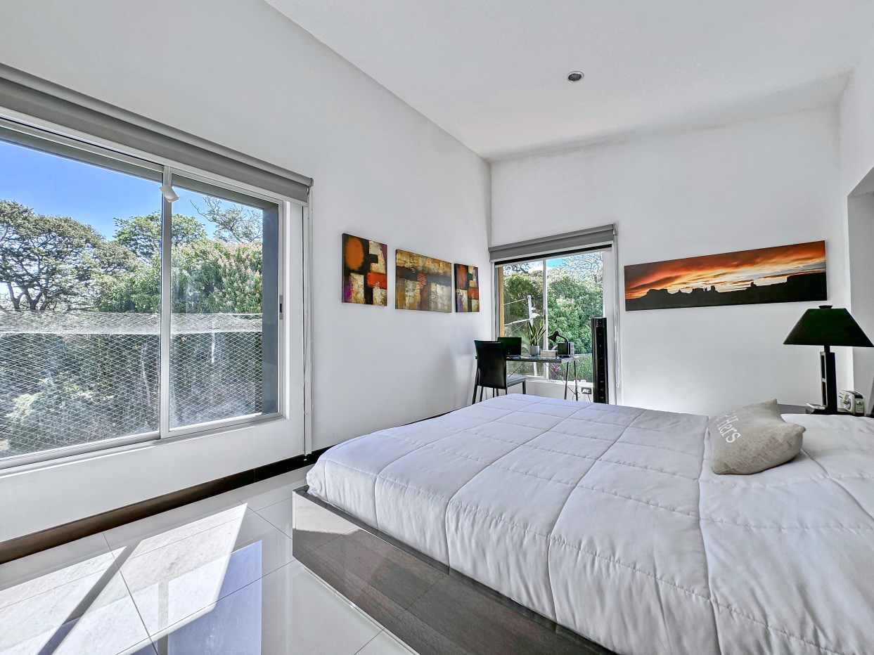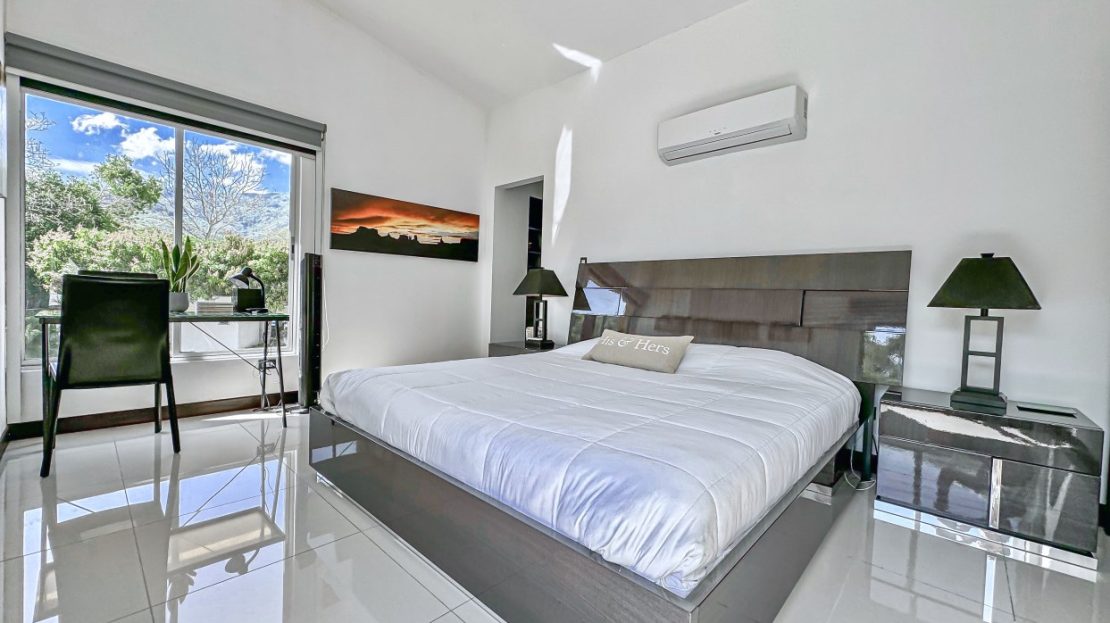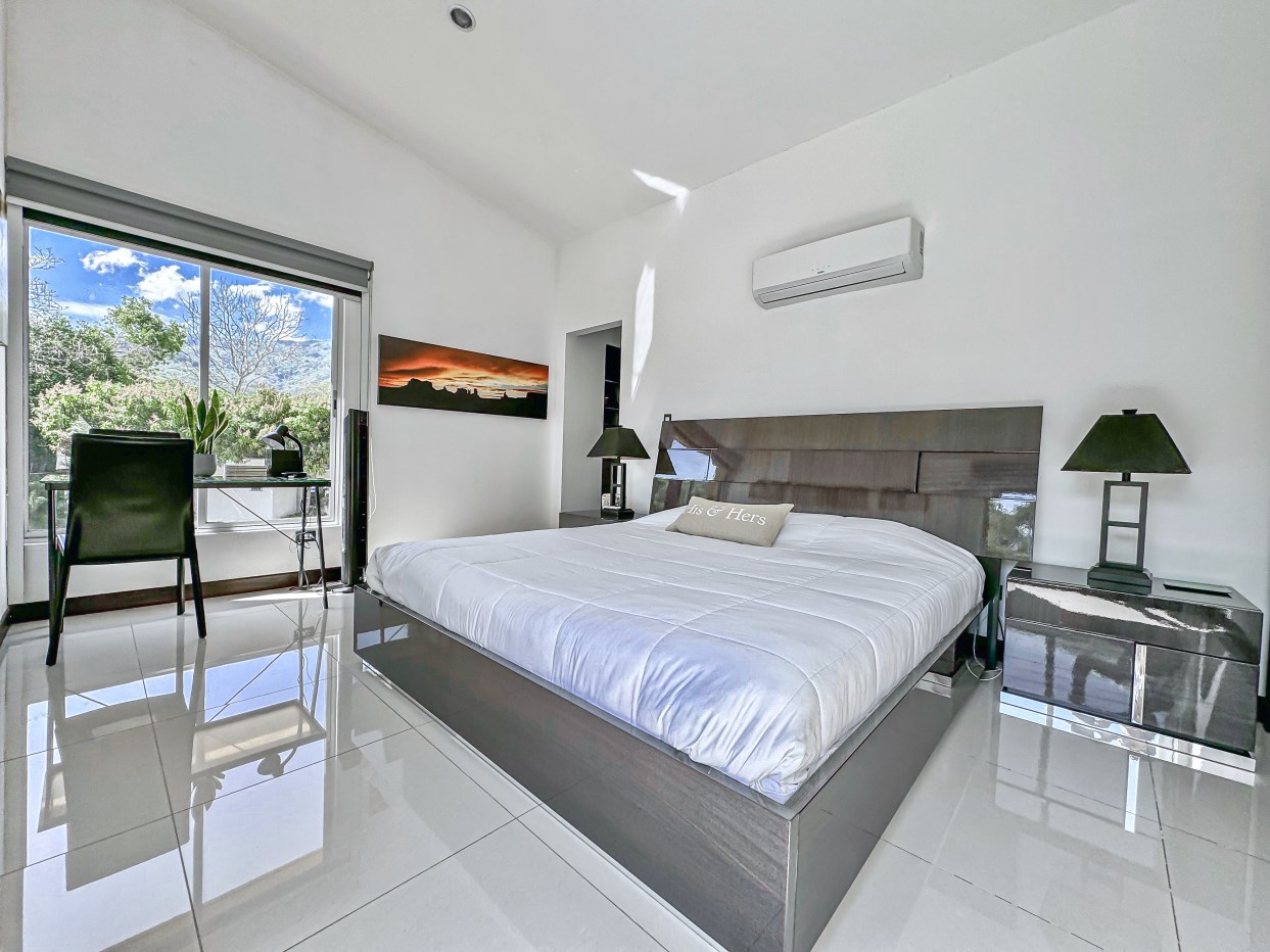 The Master bedroom boasts beautiful views of the Cerros of Escazu mountain range, a spacious walk-in closet, an air conditioner, and an en-suite bathroom with a walk-in shower. The second bedroom boasts a vaulted ceiling and beautiful garden views. The third room is currently a TV lounge room although originally designed for a third bedroom.