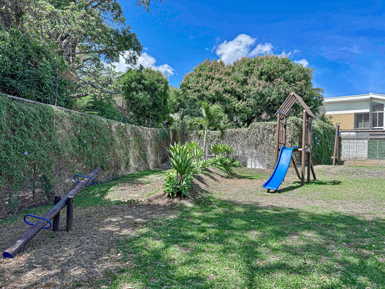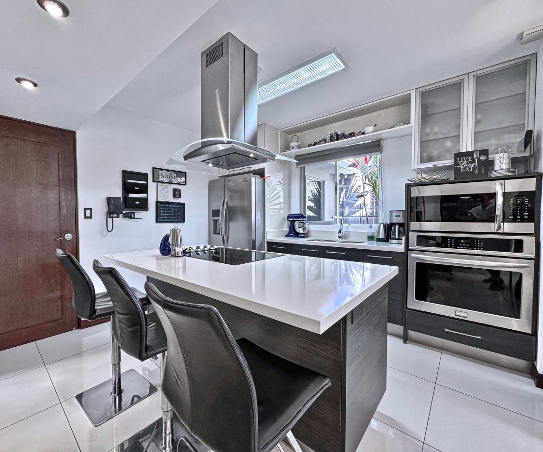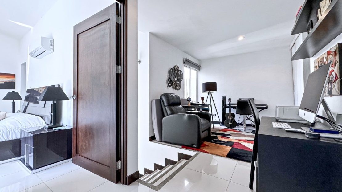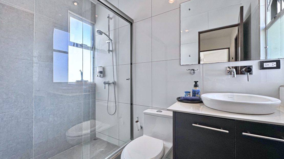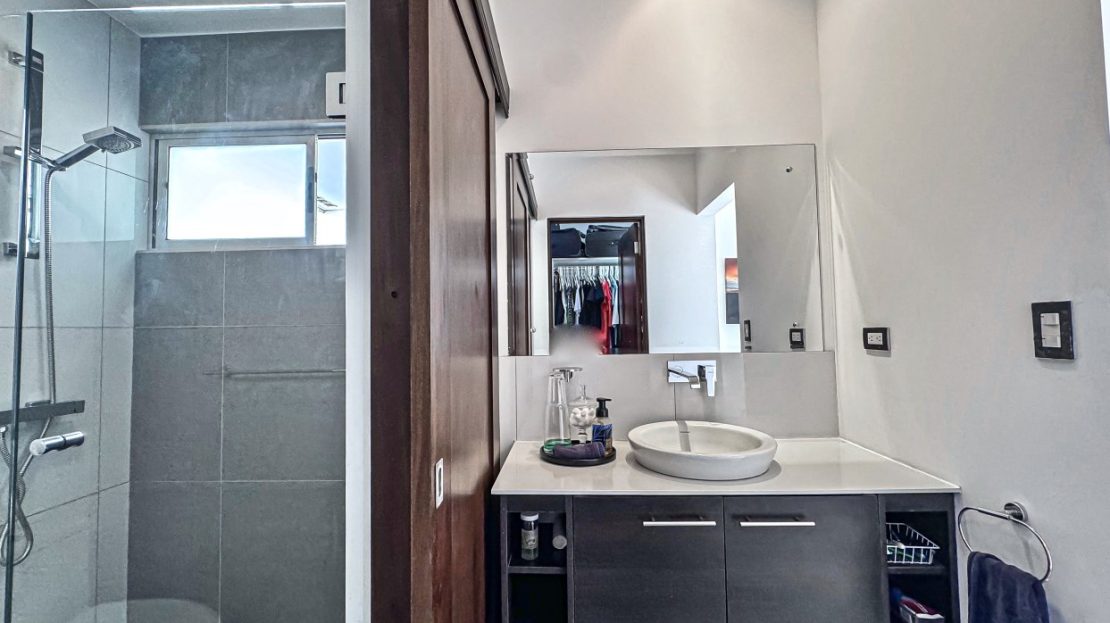 The Master bedroom boasts beautiful views of the Cerros of Escazu mountain range, a spacious walk-in closet, an air conditioner, and an en-suite bathroom with a walk-in shower. The second bedroom boasts a vaulted ceiling and beautiful garden views. The third room is currently a TV lounge room although originally designed for a third bedroom.