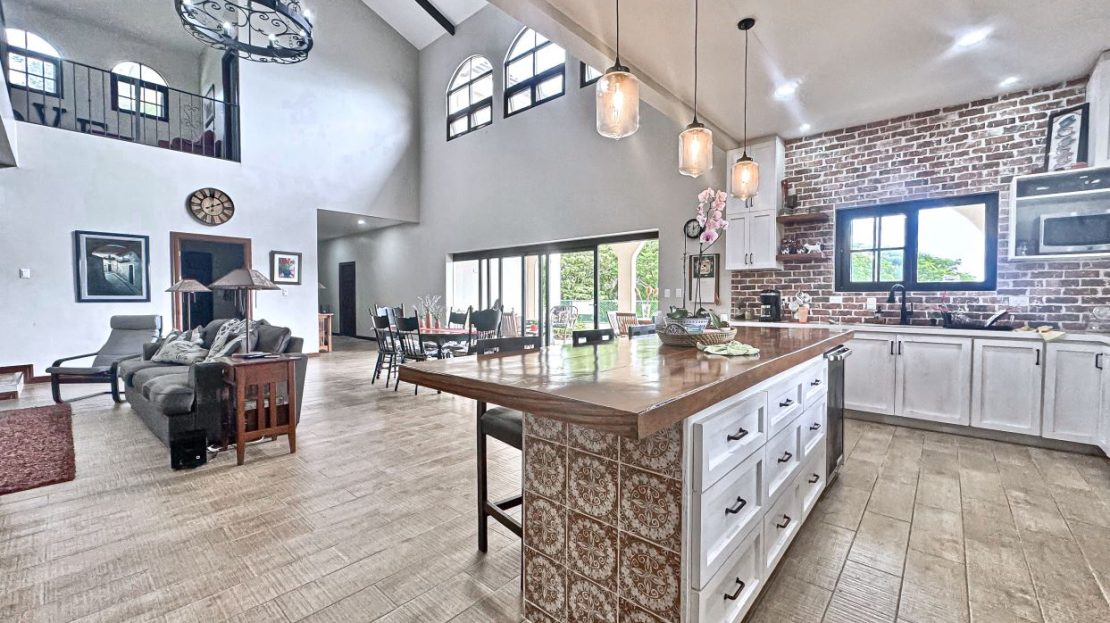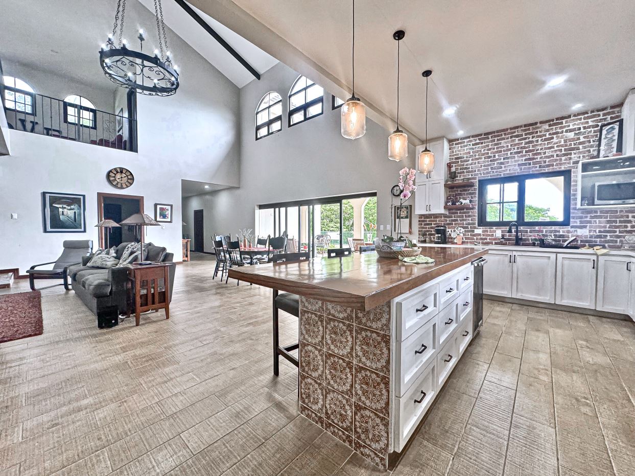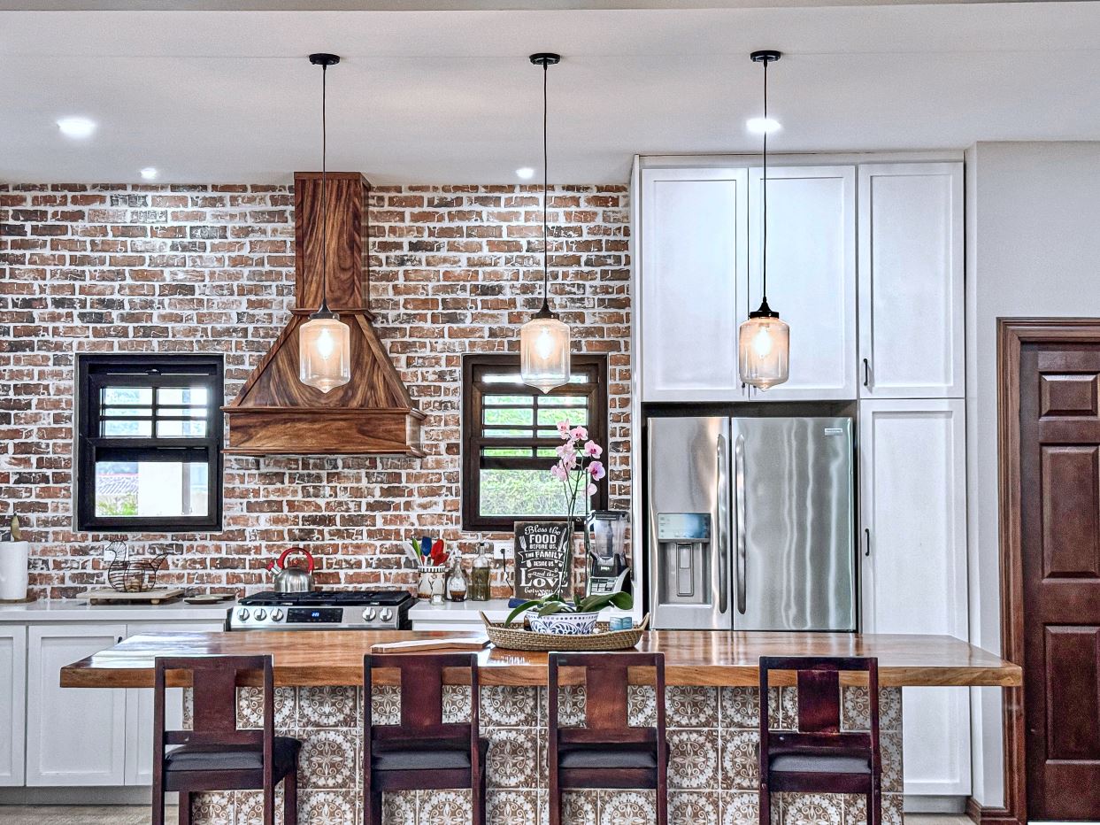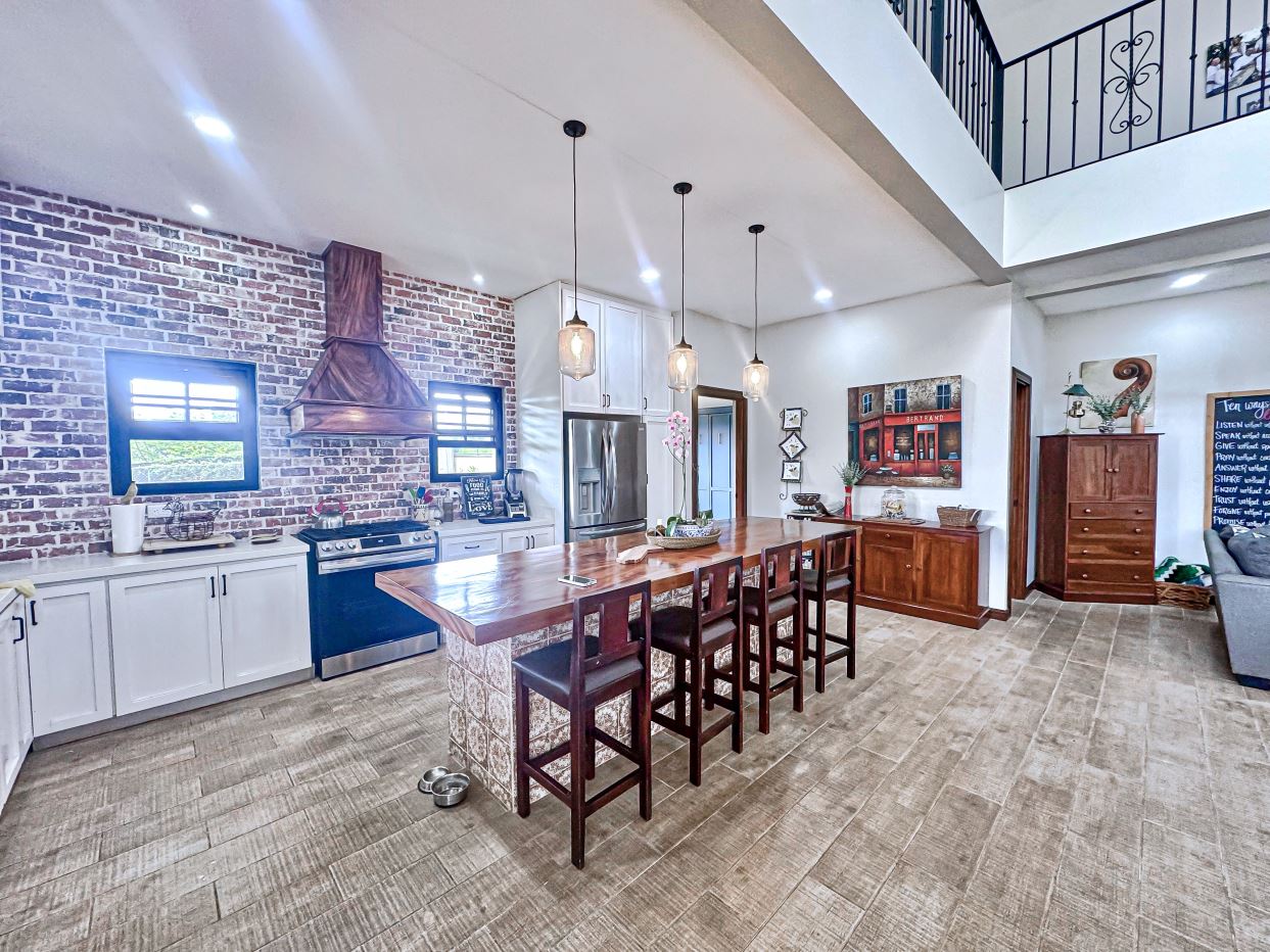 The jaw-dropping kitchen decor is a true centerpiece, boasting modern white cabinetry and classic red brick accent wall & backsplash. At the center of the kitchen, a striking island with a solid Guanacaste wood top is beautifully illuminated by designer pendant lighting—creating a warm, inviting focal point for both cooking and gathering.