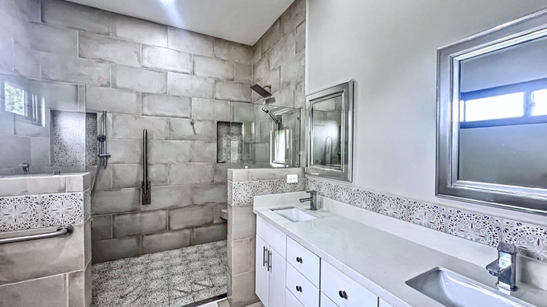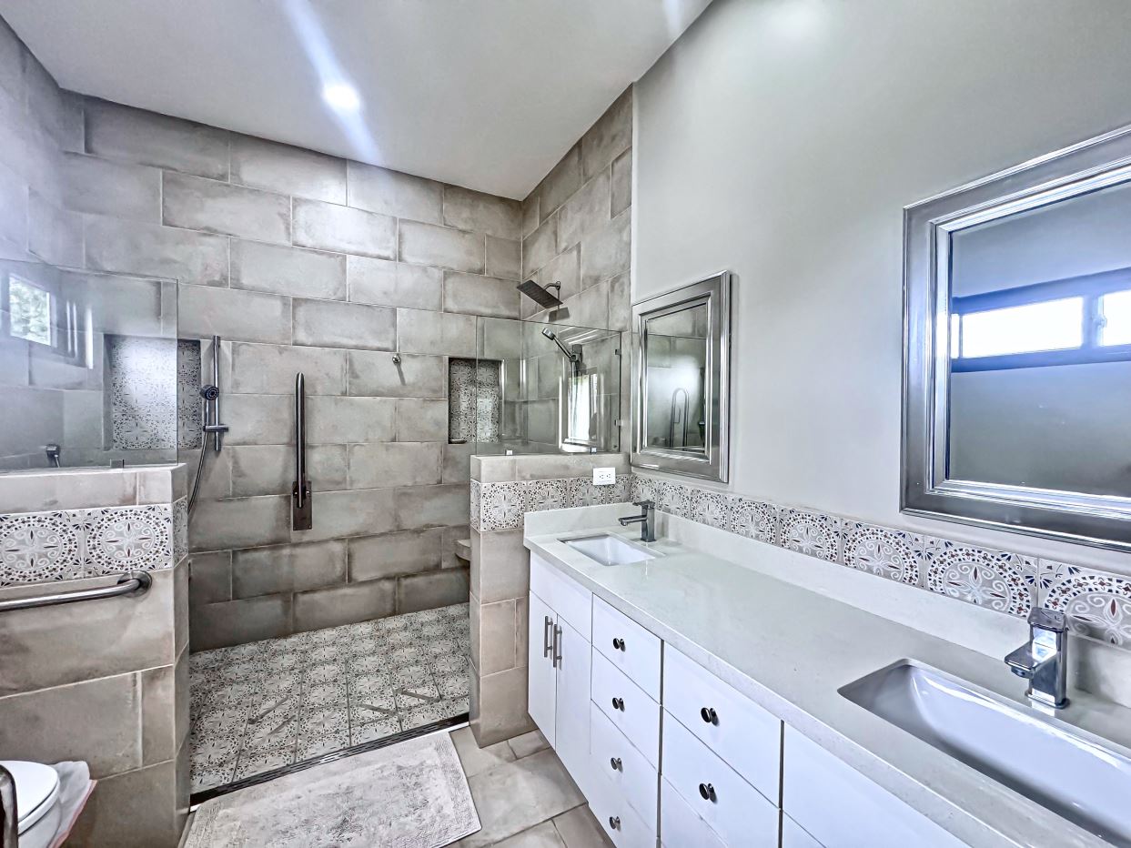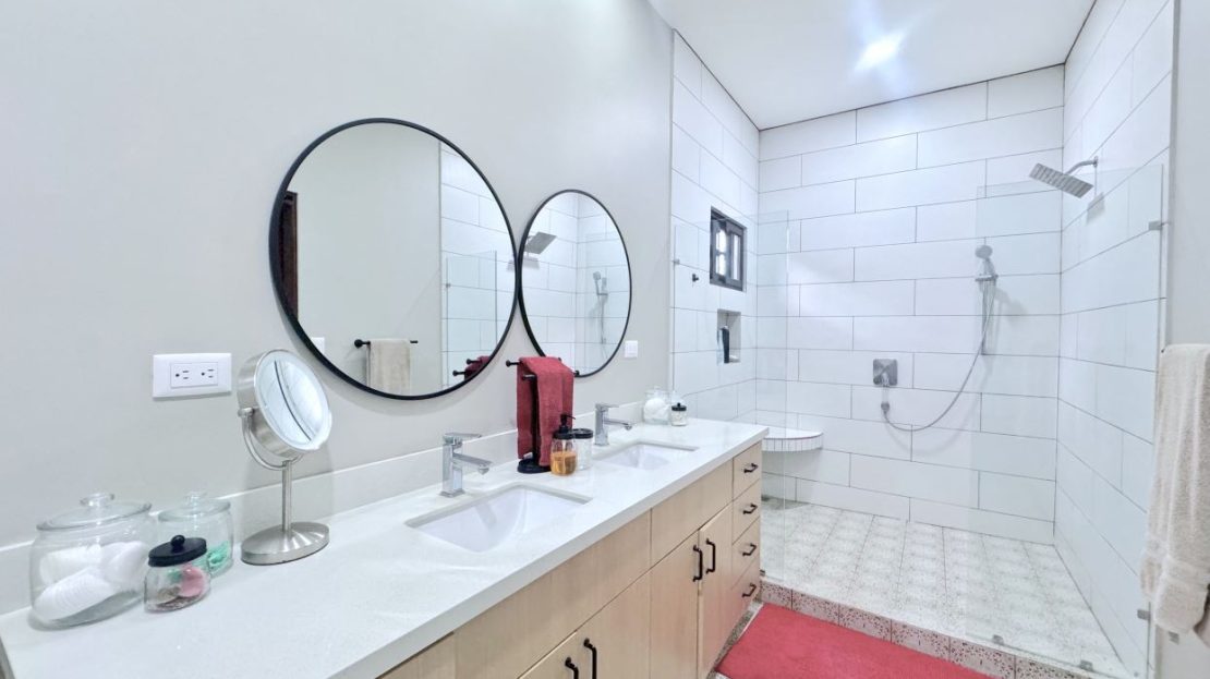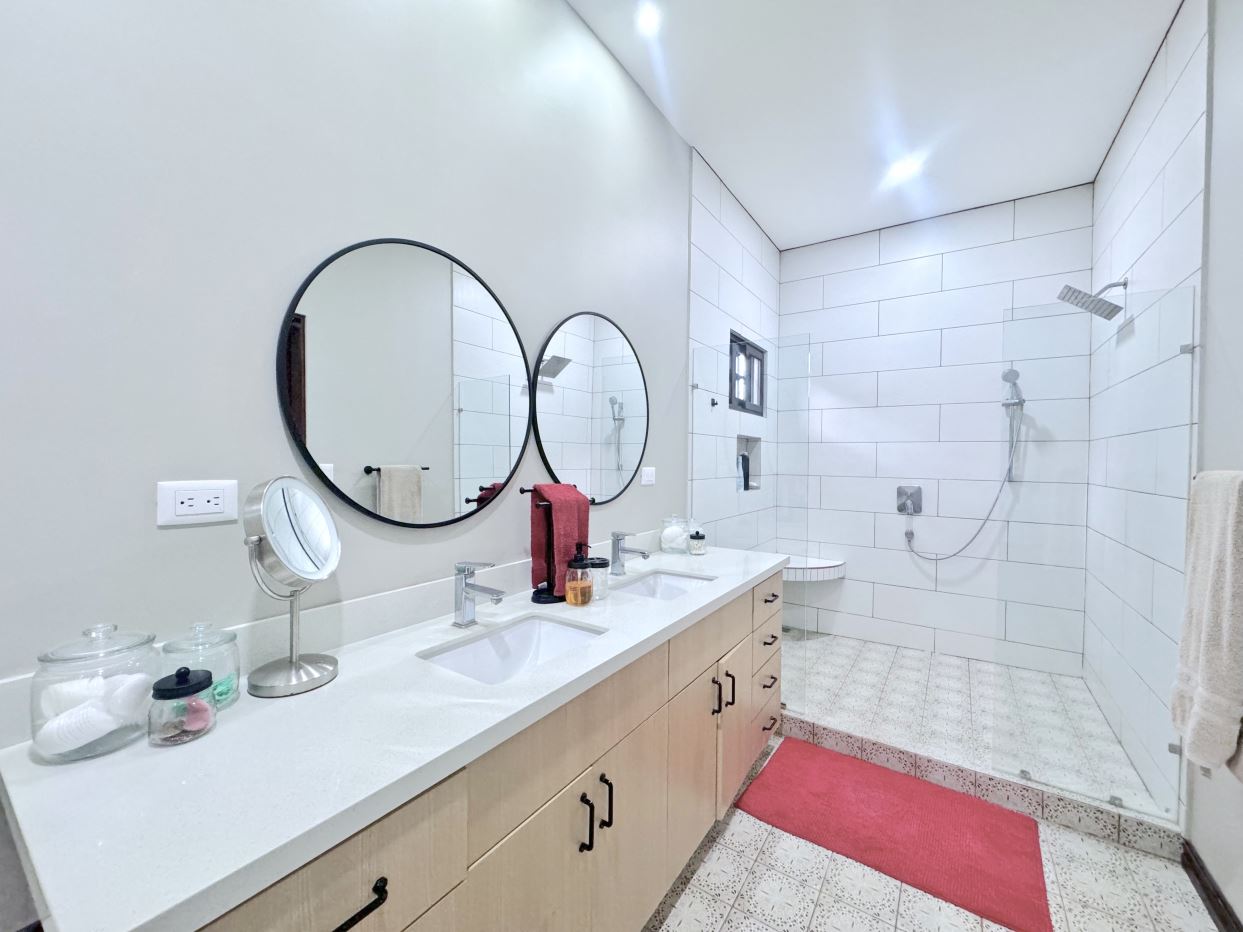 The jaw-dropping kitchen decor is a true centerpiece, boasting modern white cabinetry and classic red brick accent wall & backsplash. At the center of the kitchen, a striking island with a solid Guanacaste wood top is beautifully illuminated by designer pendant lighting—creating a warm, inviting focal point for both cooking and gathering.