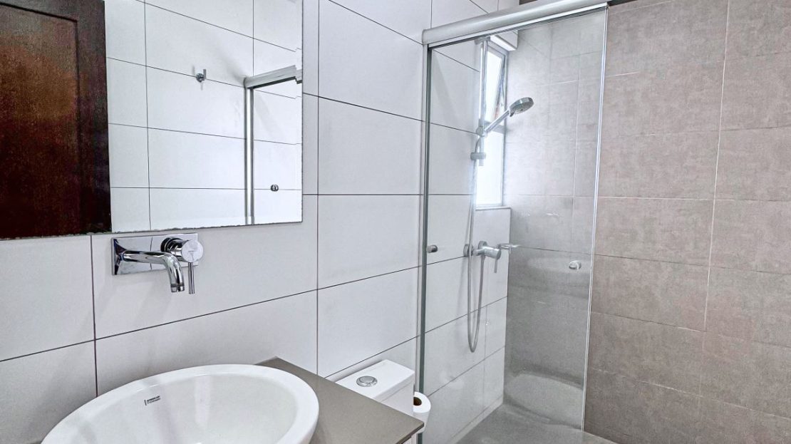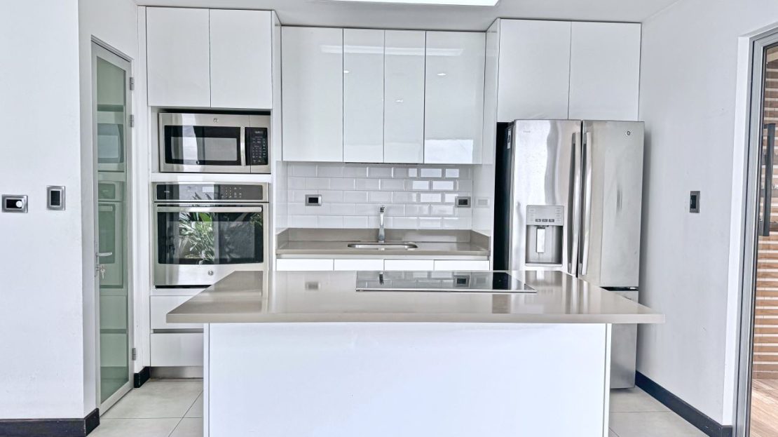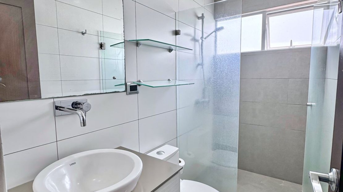 The primary bedroom boasts beautiful views of the Heredia mountain range, a walk-in closet, a wall entertainment unit, an air conditioner, and an en-suite bathroom with a walk-in shower. The second bedroom boasts mountain views. The third room is currently a TV lounge room, although originally designed for a third bedroom. The secondary rooms have access to an independant full bathroom.