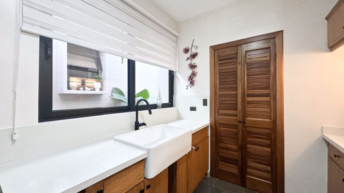 The kitchen is a true delight — equipped with stainless steel appliances, a walk-in pantry, porcelain farmhouse sink, and white quartz countertops paired with warm wood cabinetry and modern black fixtures.