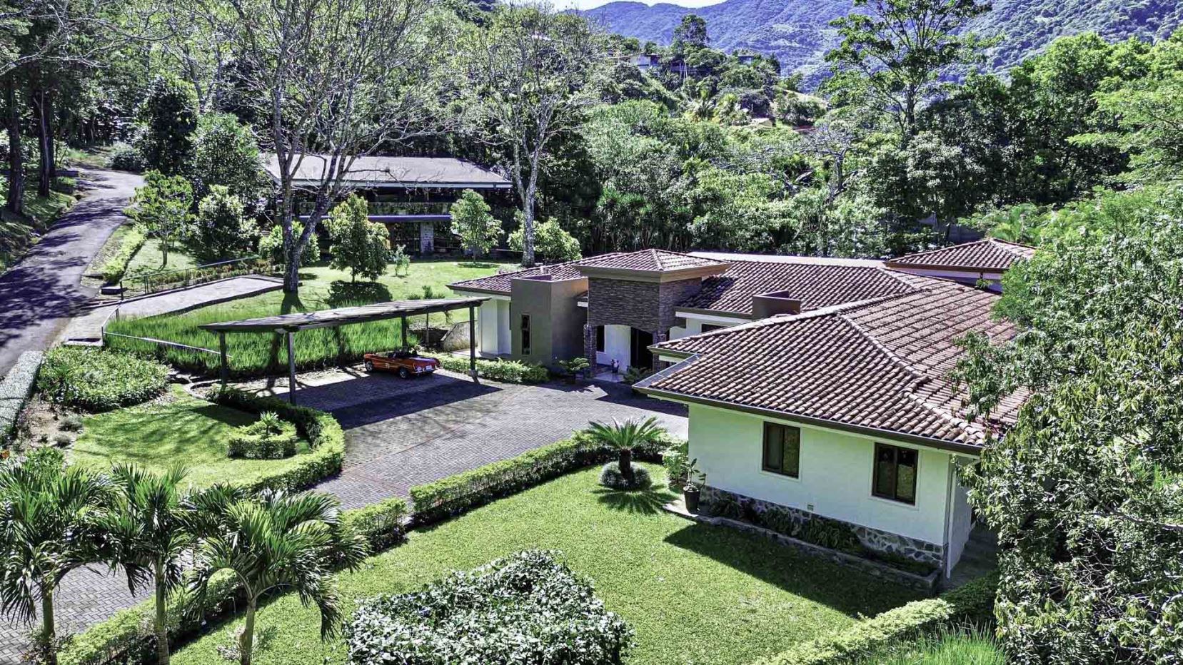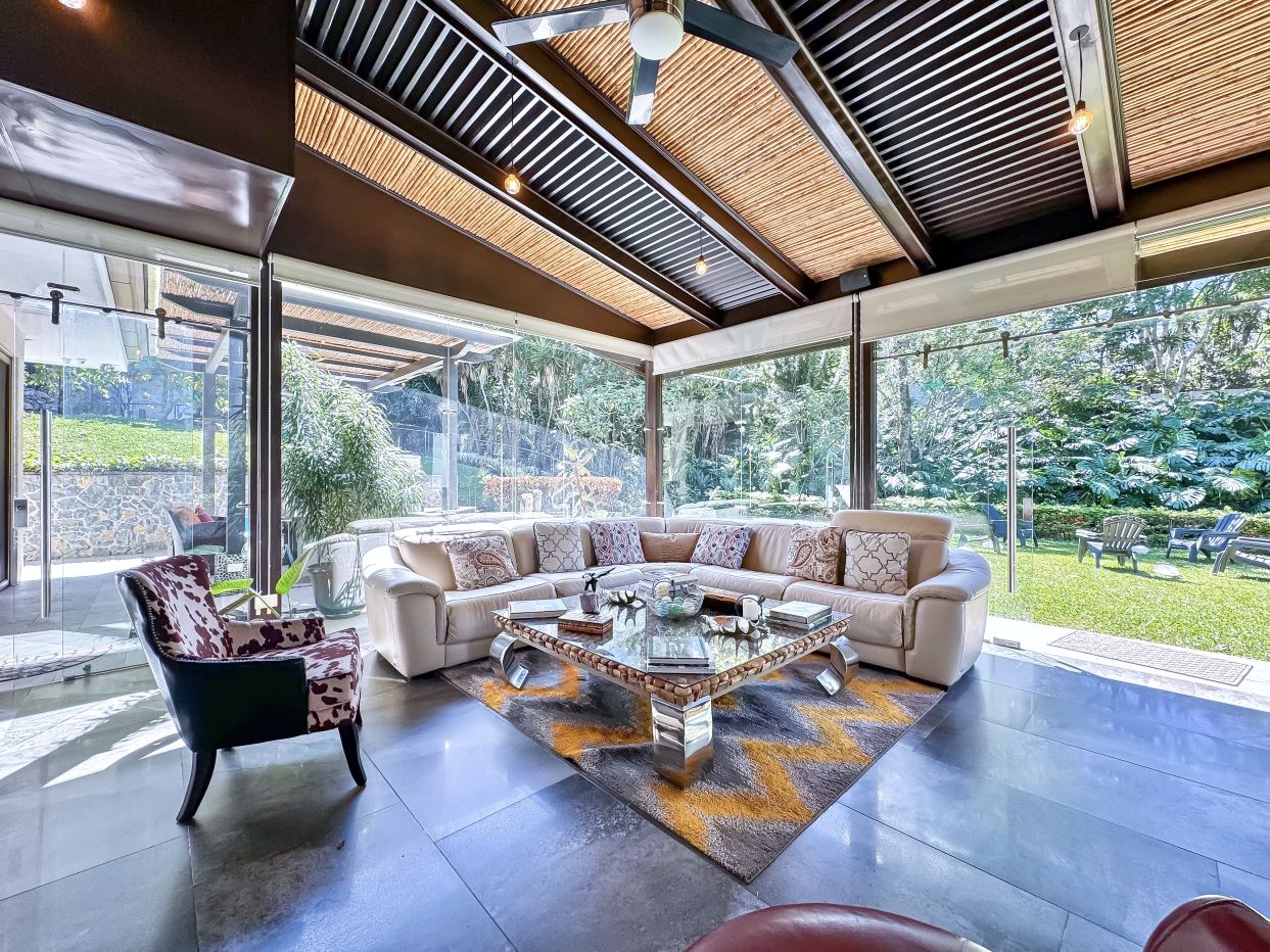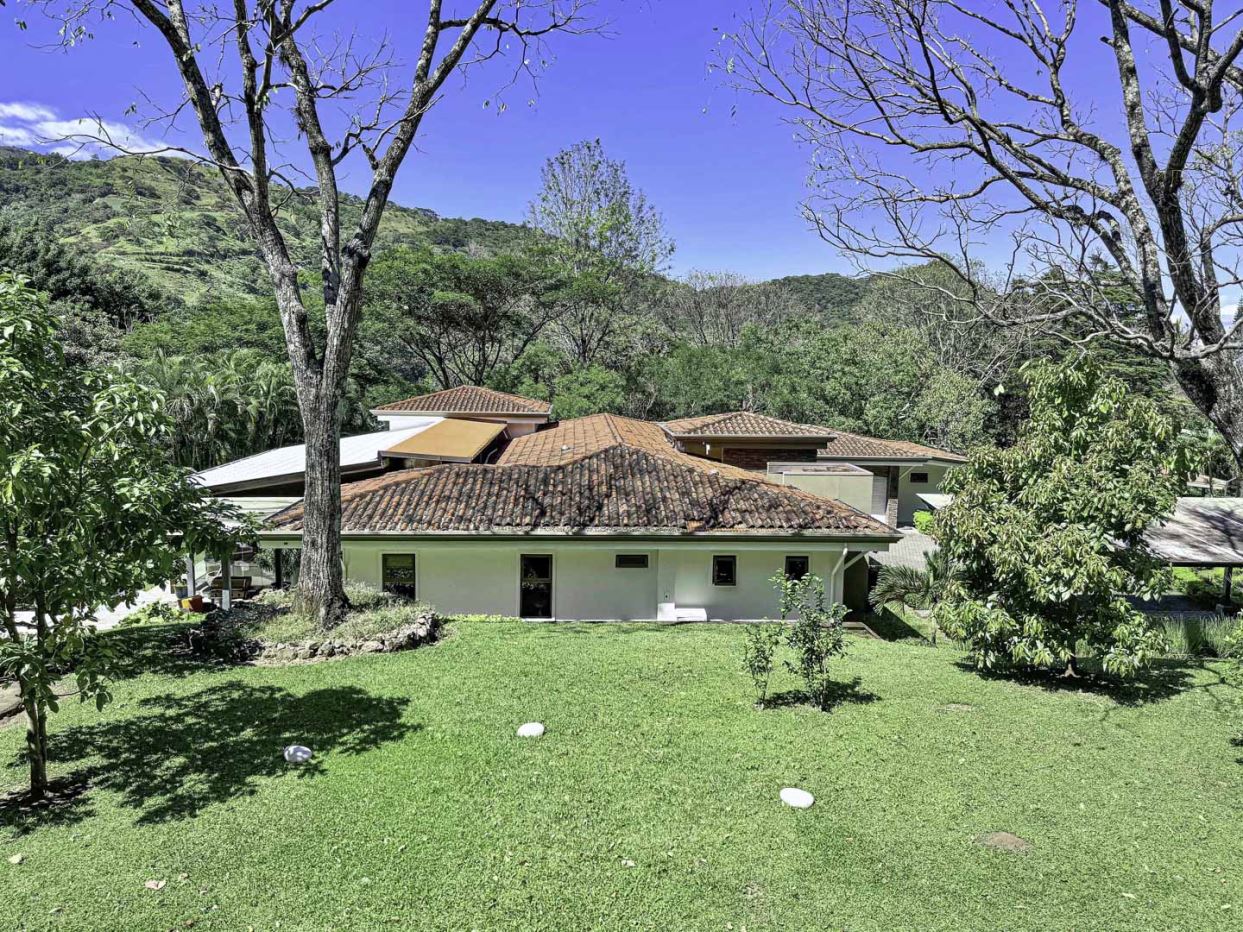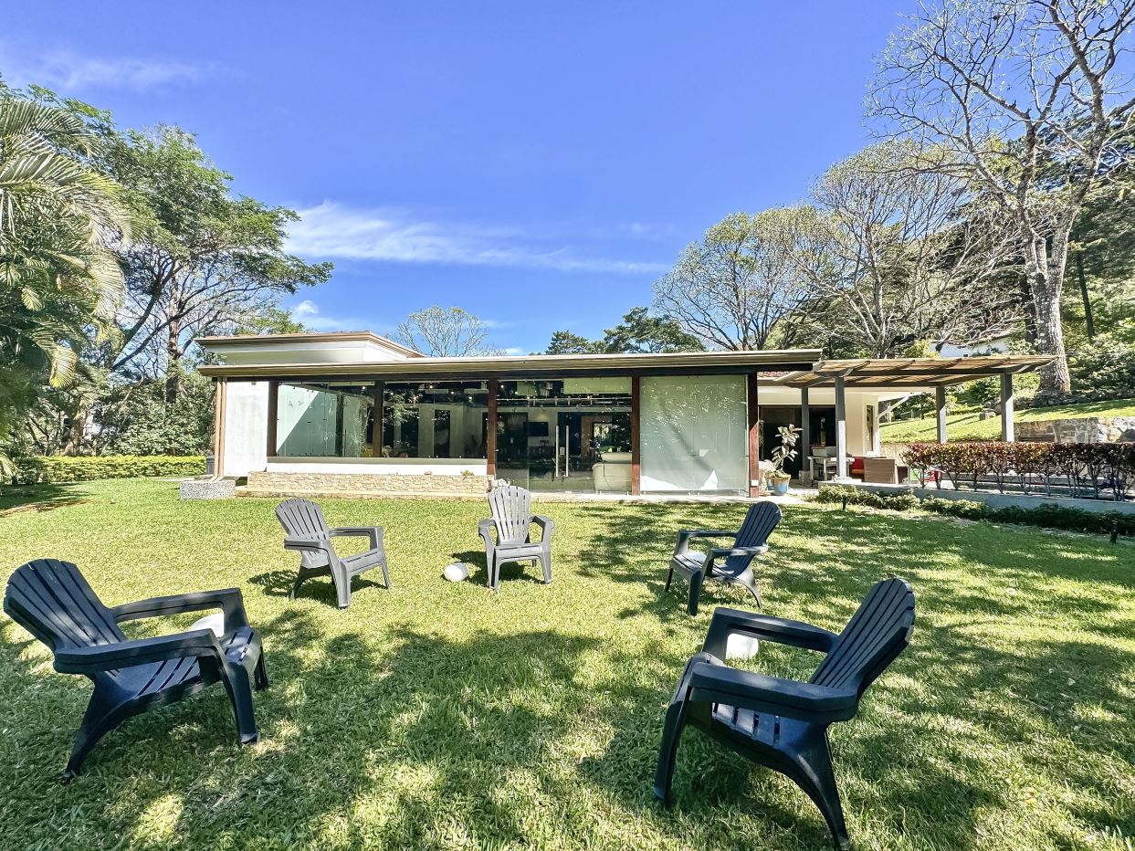 Welcome to Oak Trees Estate, a one-level home for sale in Santa Ana, Costa Rica, boasting a primary residence with 4 bedrooms, four full bathrooms, a maid’s room, a one- bedroom cottage house and a two-level clubhouse. Oak Trees Estate is a rare and exceptional find—an expansive estate just minutes from the heart of the city, set amidst a lush backdrop of mature trees, spanning over 7,000 square meters of serene, private grounds. With its enchanting walking trails, a picturesque bridge, rustic clubhouse with contemporary features and a charming guest house, this residence is a true sanctuary.