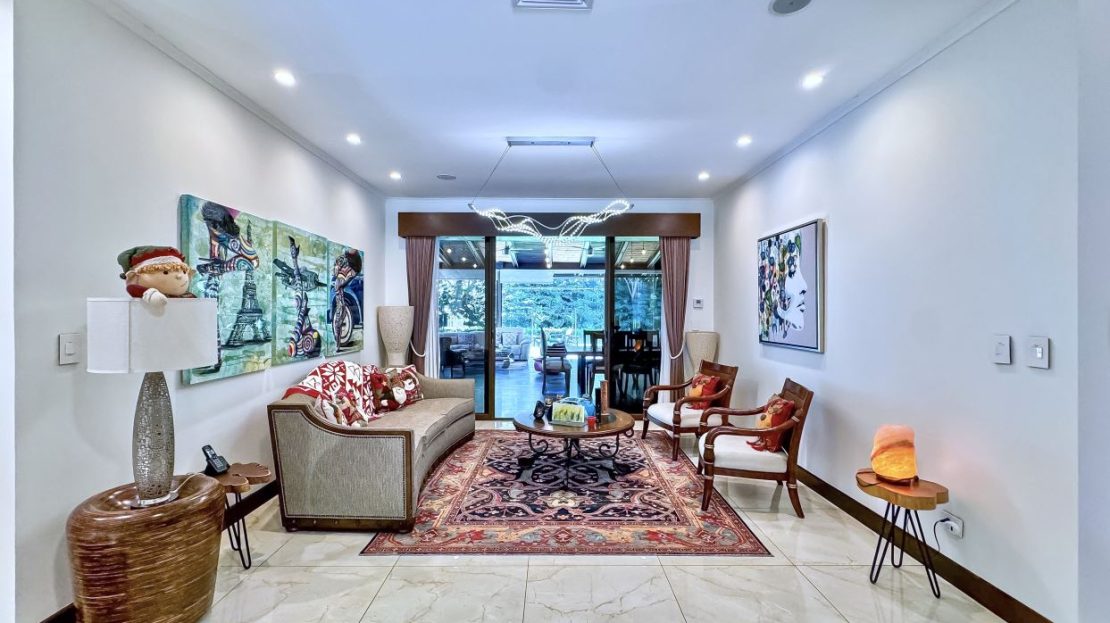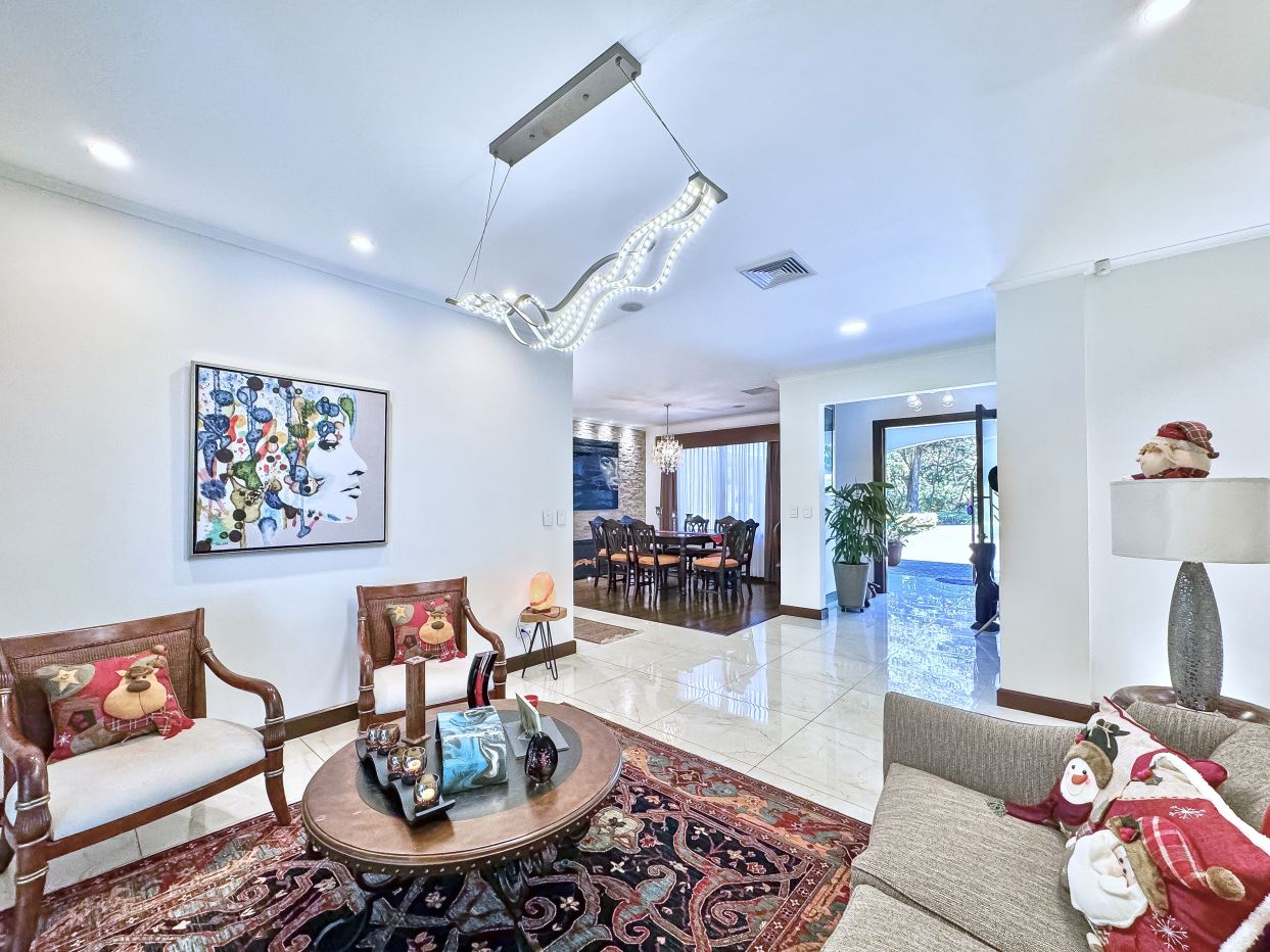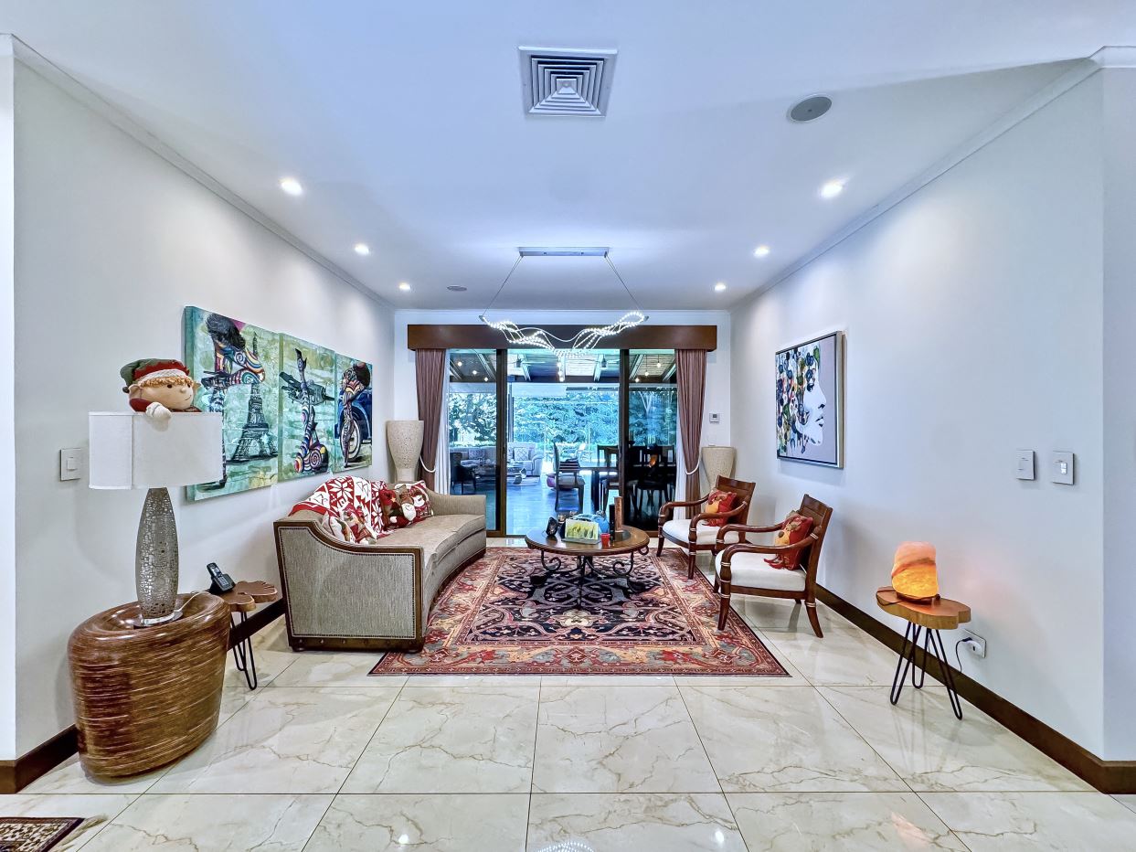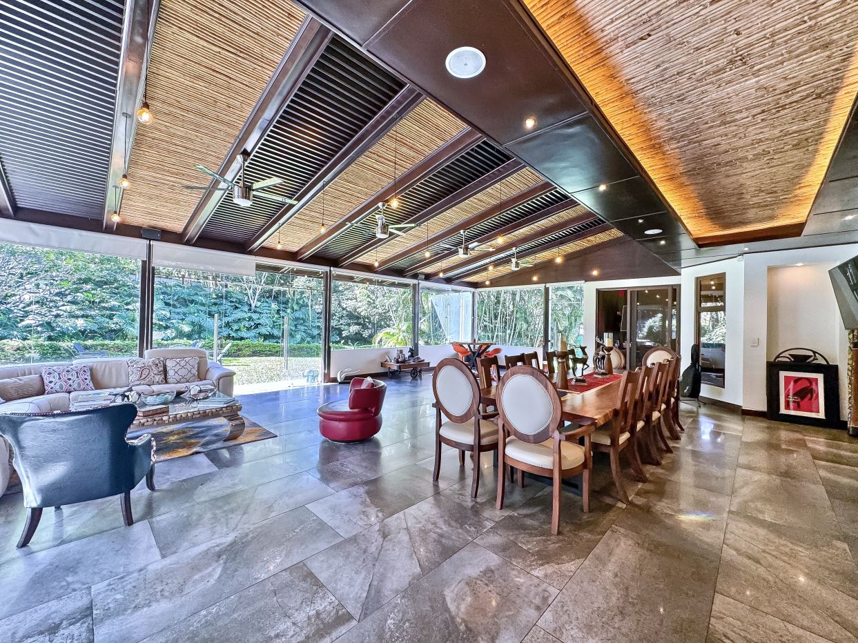 The entrance welcomes you with beautifully manicured landscaping and a tranquil fountain. Inside, a refined foyer opens seamlessly to the spacious living and dining areas, along with the covered terrace. This expansive terrace—ideal for entertaining or family gatherings, features ceilings accented with designer wood trim and cana brava, as well as large glass doors and windows that fill the space with natural light, creating an airy and inviting ambiance.