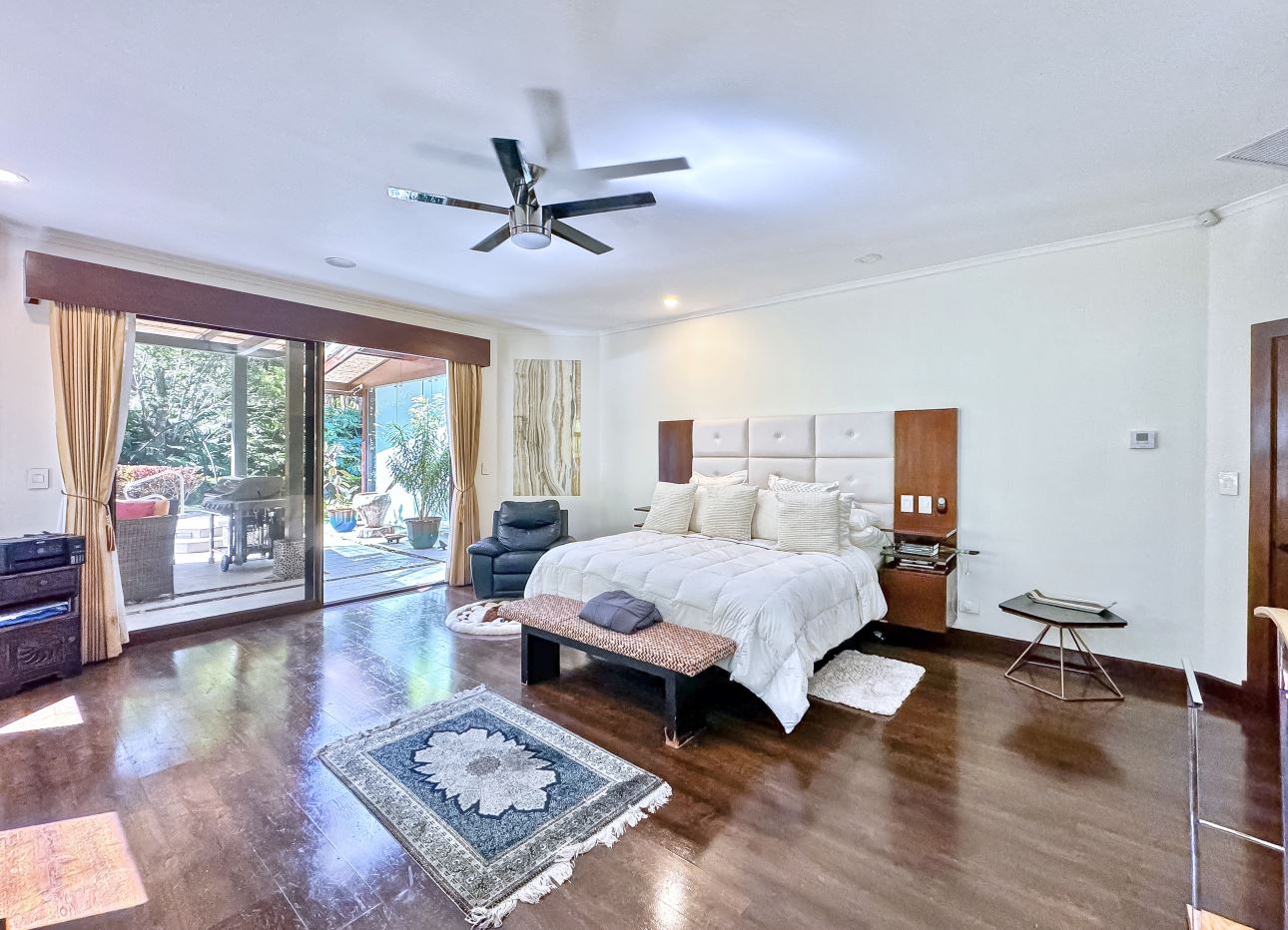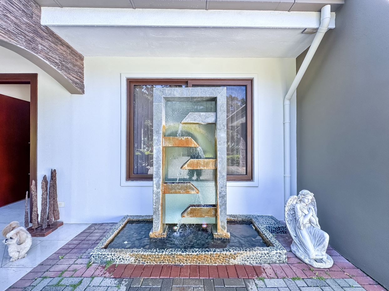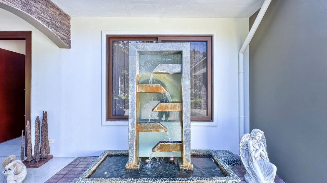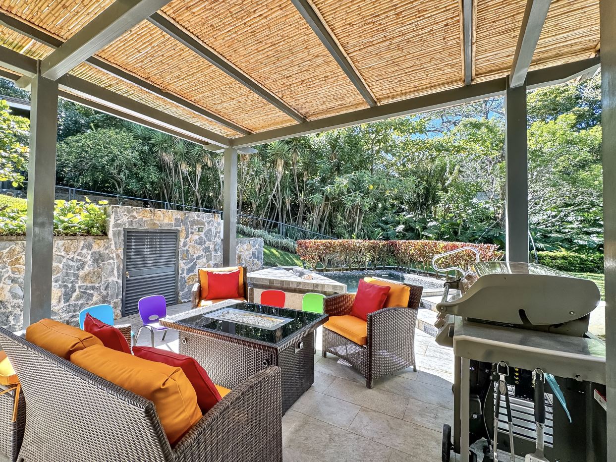 The entrance welcomes you with beautifully manicured landscaping and a tranquil fountain. Inside, a refined foyer opens seamlessly to the spacious living and dining areas, along with the covered terrace. This expansive terrace—ideal for entertaining or family gatherings, features ceilings accented with designer wood trim and cana brava, as well as large glass doors and windows that fill the space with natural light, creating an airy and inviting ambiance.