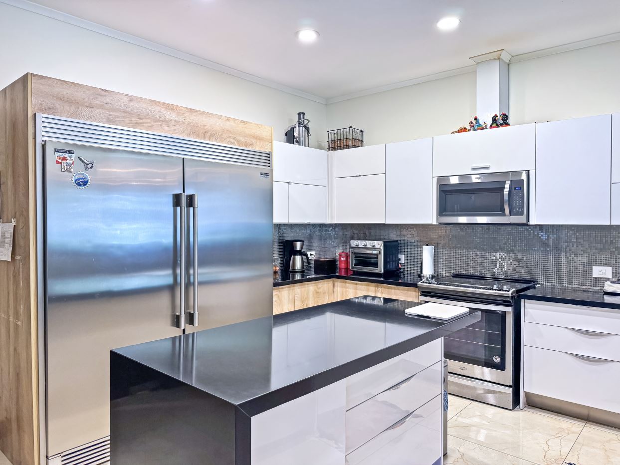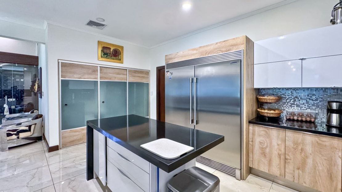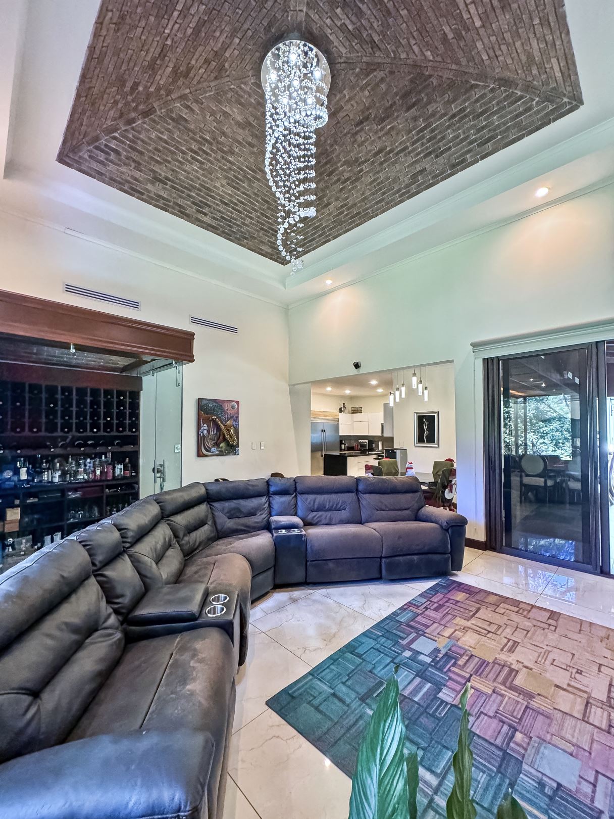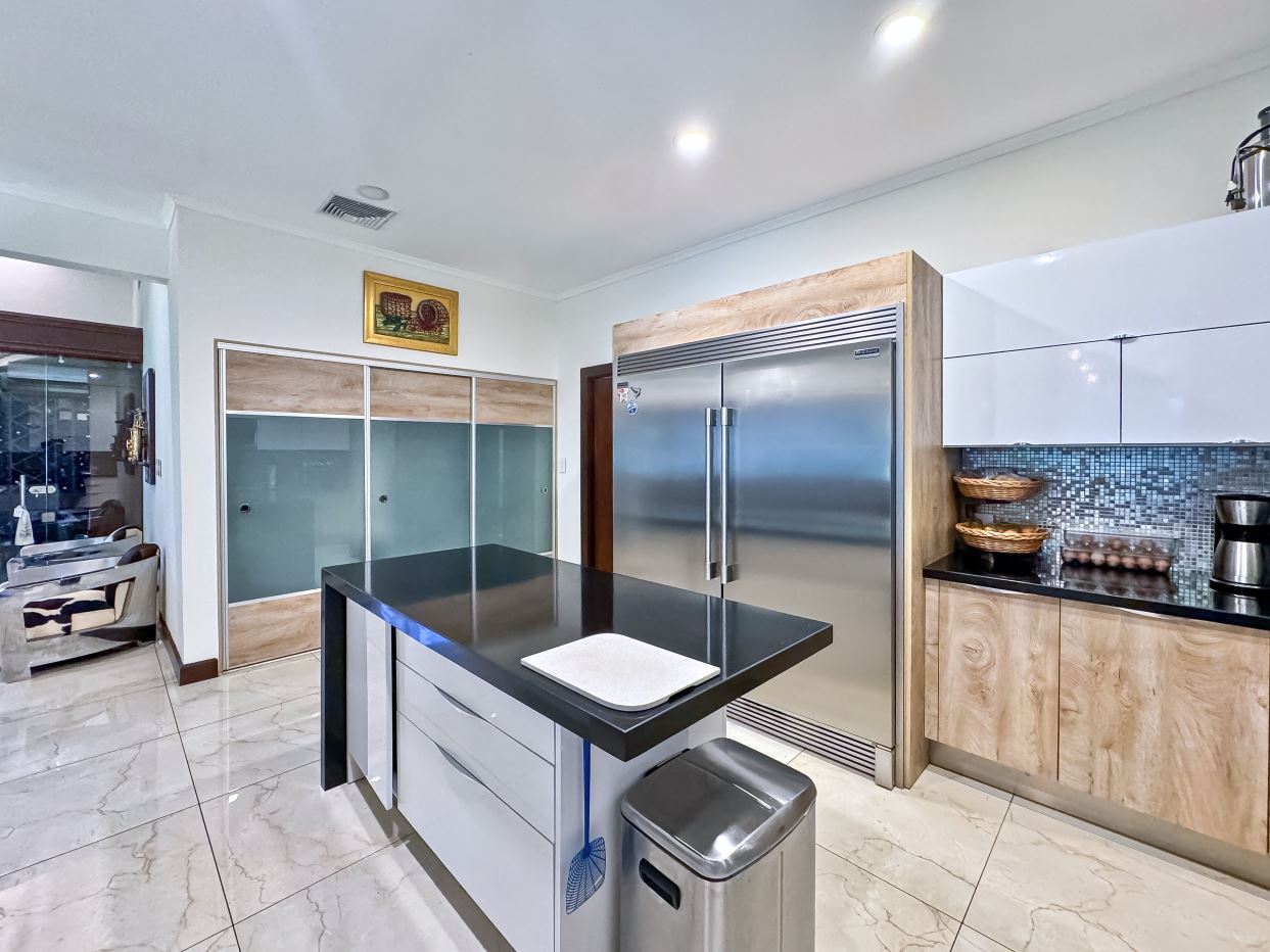 The chef’s kitchen connects effortlessly to the TV lounge and includes a central island, generous storage, stainless steel appliances, and elegant granite countertops. The TV lounge is defined by its dramatic high ceilings, designer pendant lighting, and a glass-enclosed wine cellar—bringing a touch of modern sophistication.