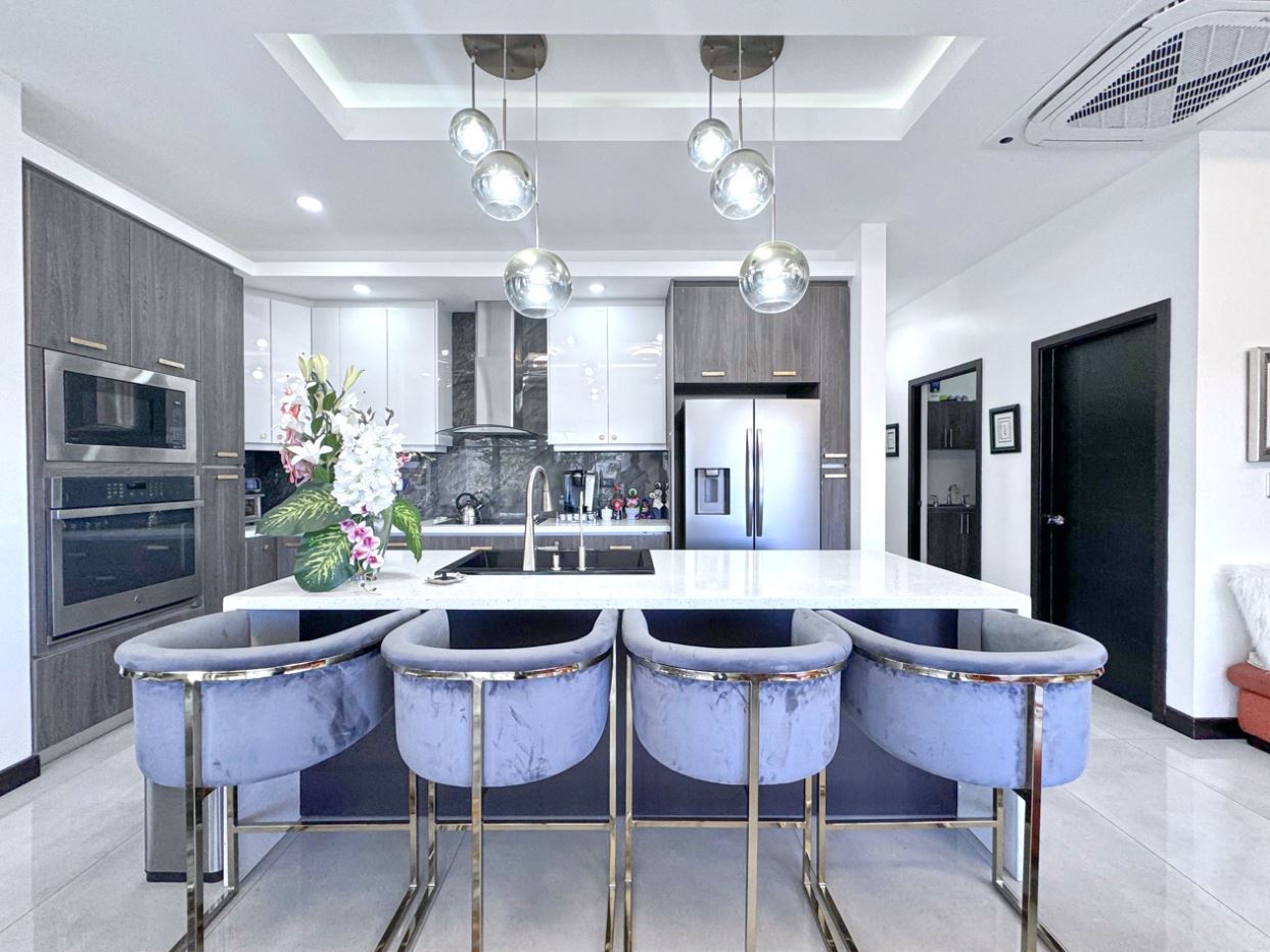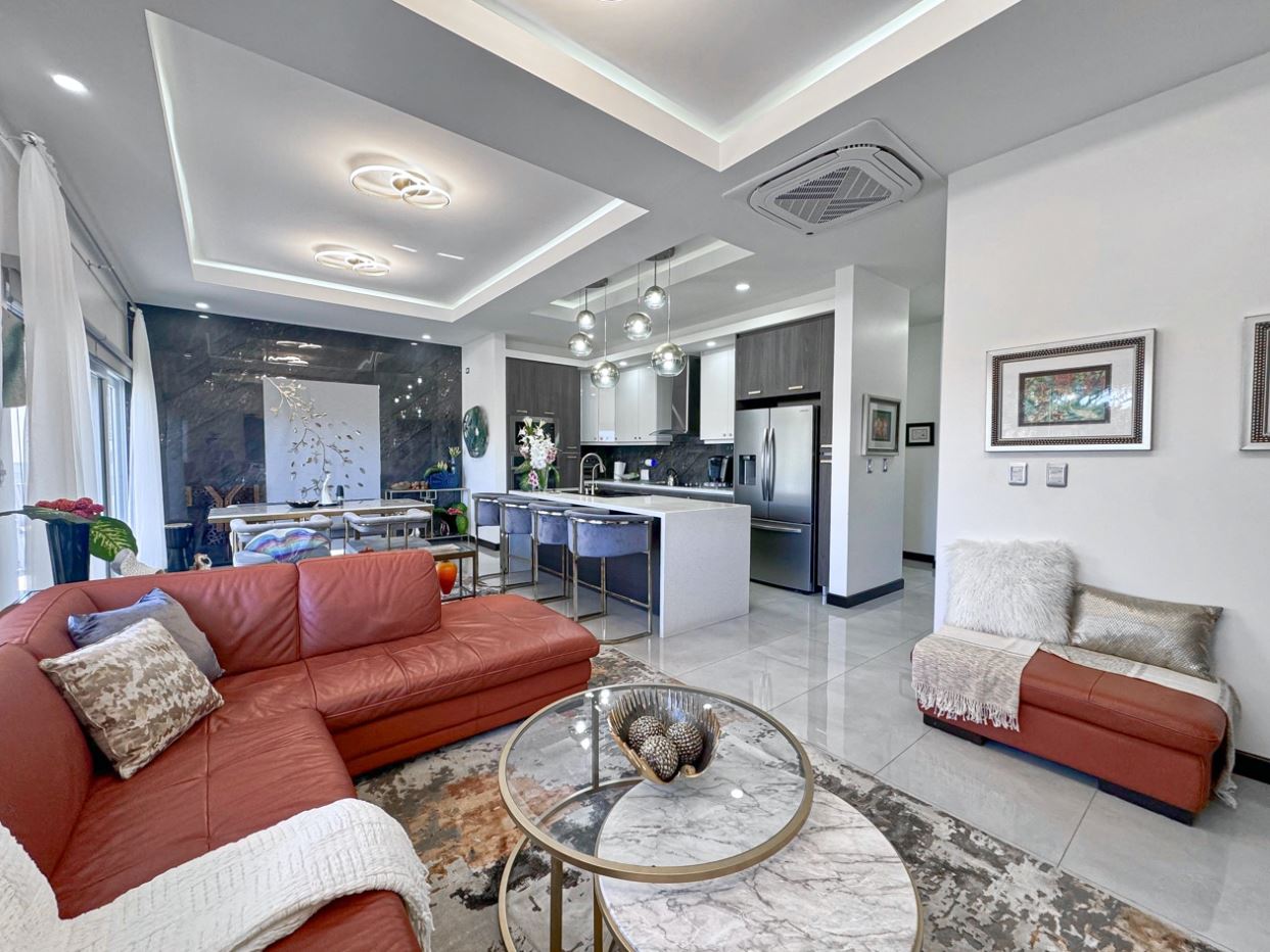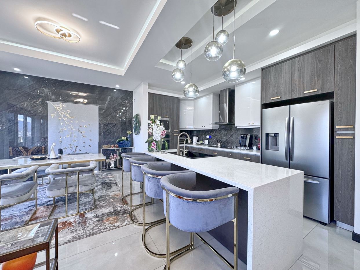 The penthouse features 152 m² of thoughtfully designed living space, offering three bedrooms and two and a half bathrooms within a secure, gated condominium. The open-concept kitchen flows effortlessly into the living and dining areas, creating an inviting space ideal for both entertaining and everyday living. Floor-to-ceiling sliding glass doors lead to a spacious balcony framed by tempered glass railings, where you can unwind while taking in expansive valley and mountain views, accompanied by the soothing sounds of twittering birds.